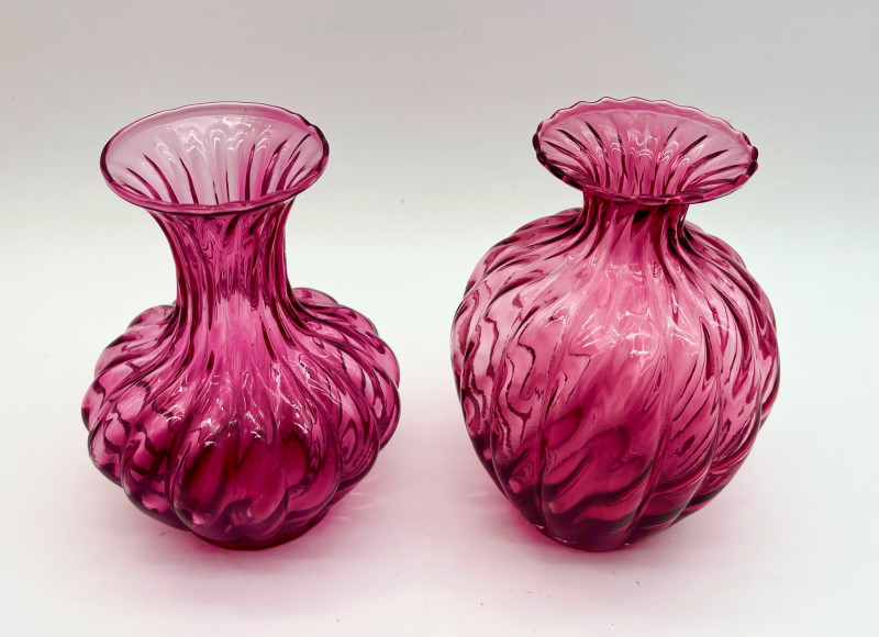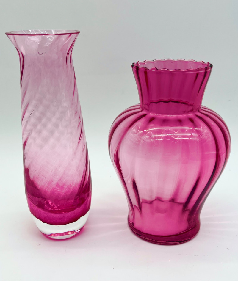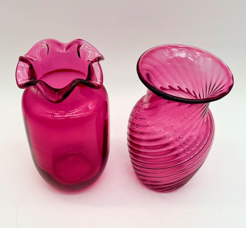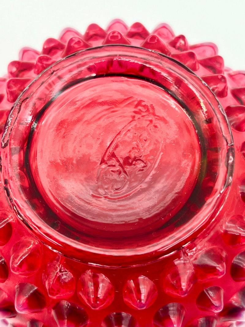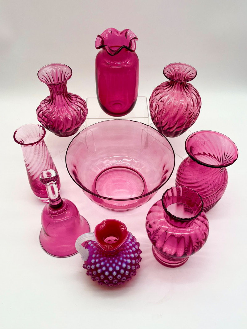 Cranberry Glass Lot Featuring Fenton Small Opalescent Hobnail Pitcher All pieces in this lot look to be in good condition with no cracks or chips. Center bowl in the first two photos is 8 1/2" wide and 4 1/2" tall. The tallest vase is just over 7" and the shortest is just under 6".