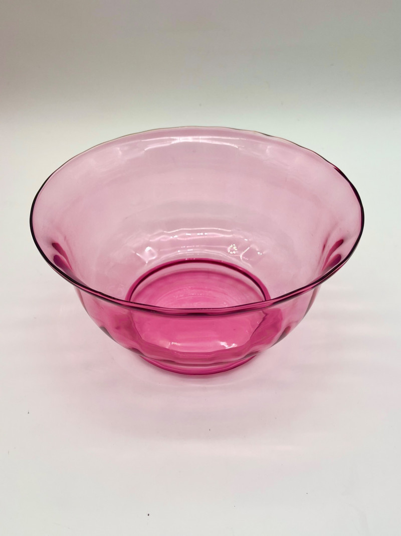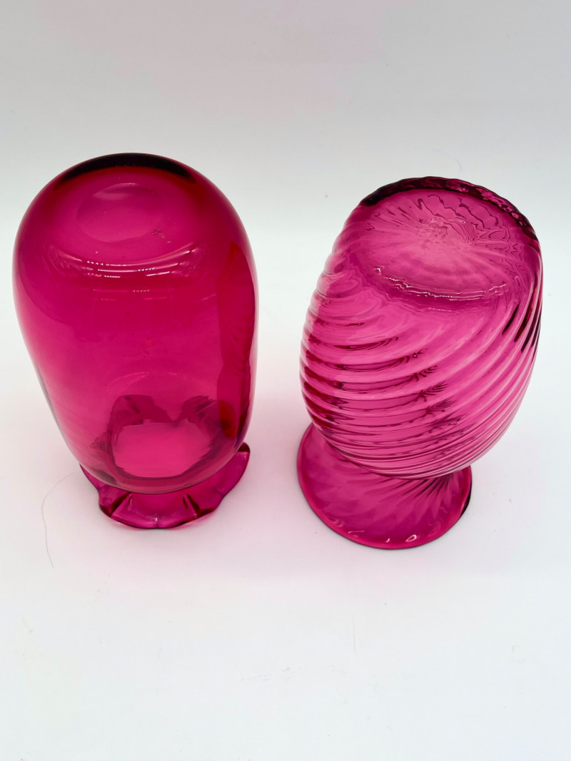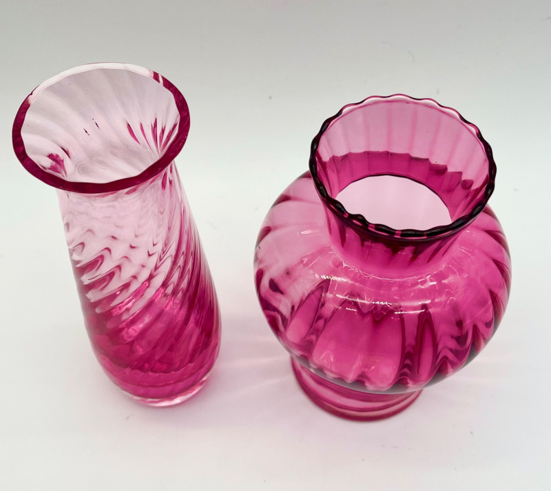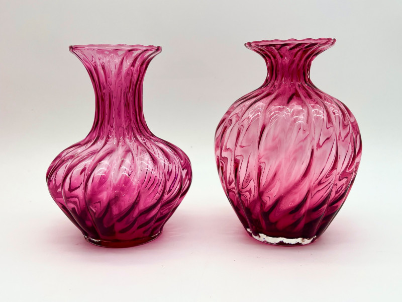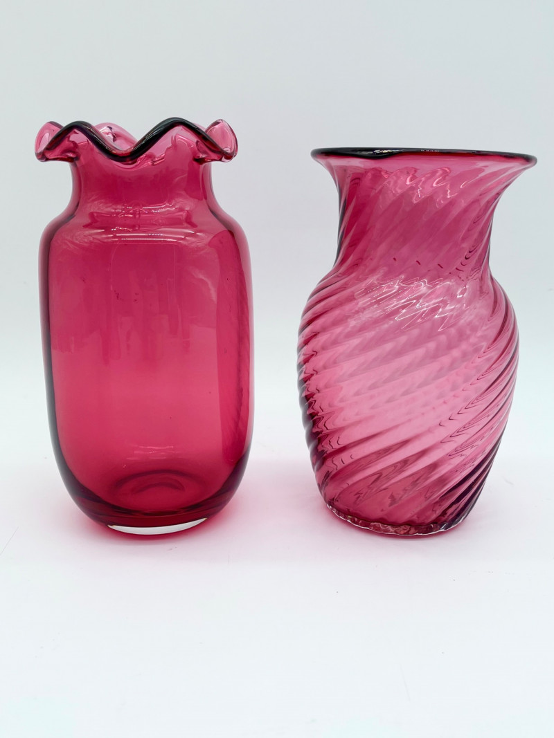 Cranberry Glass Lot Featuring Fenton Small Opalescent Hobnail Pitcher All pieces in this lot look to be in good condition with no cracks or chips. Center bowl in the first two photos is 8 1/2" wide and 4 1/2" tall. The tallest vase is just over 7" and the shortest is just under 6".