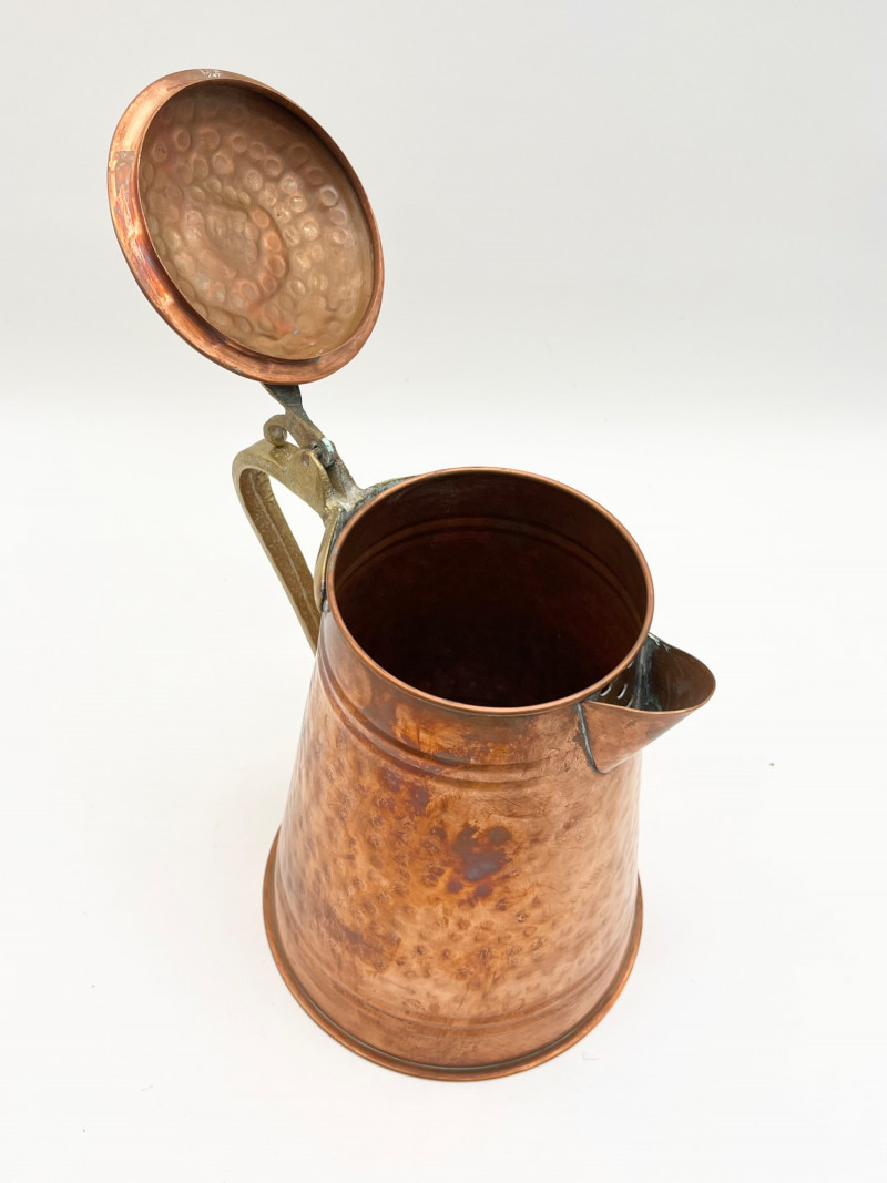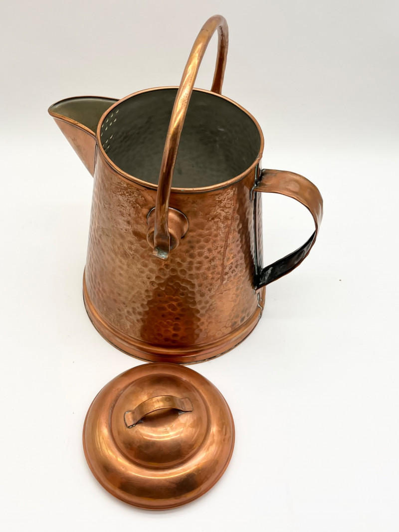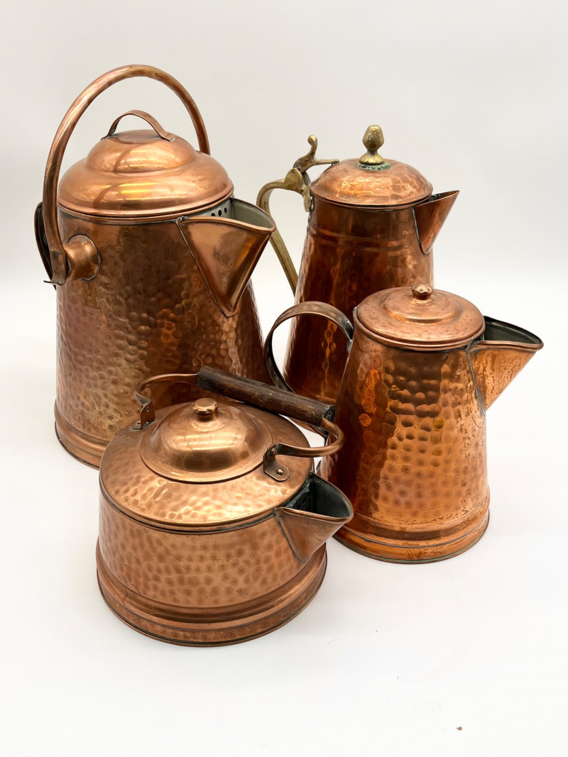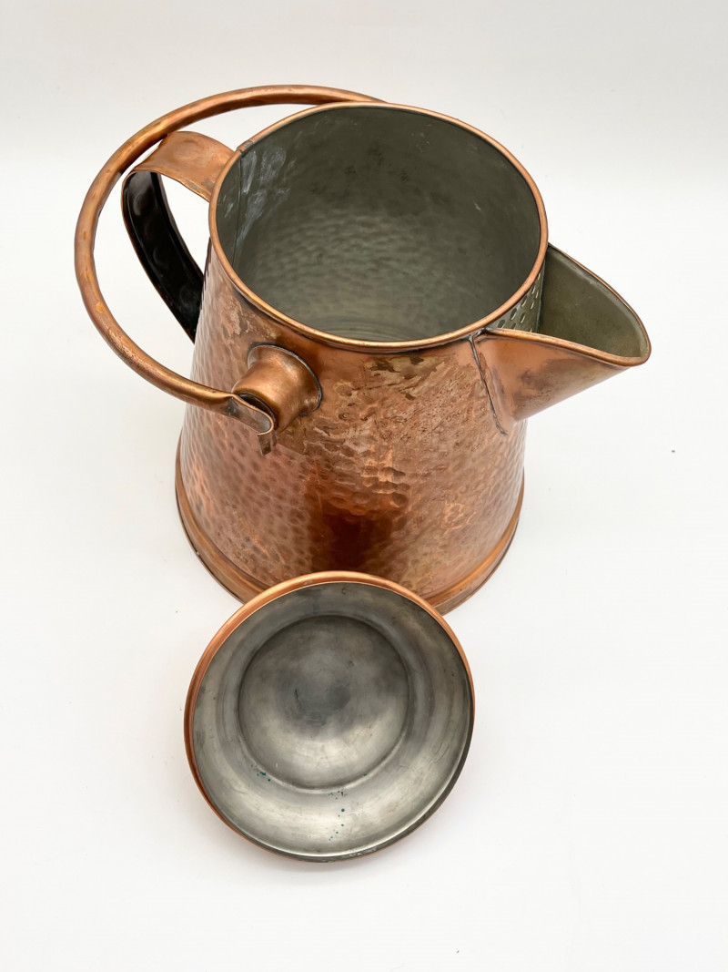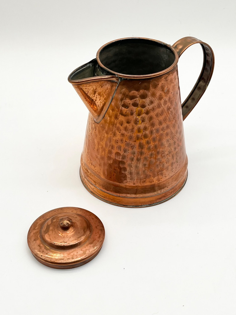 Hammered Copper Lot This lot includes two coffee pots, a teapot, and a jug with a hinged lid. I don't believe any of these pieces are solid copper but they are all in very nice vintage condition. The tallest is 12" tall to the top of the handle.