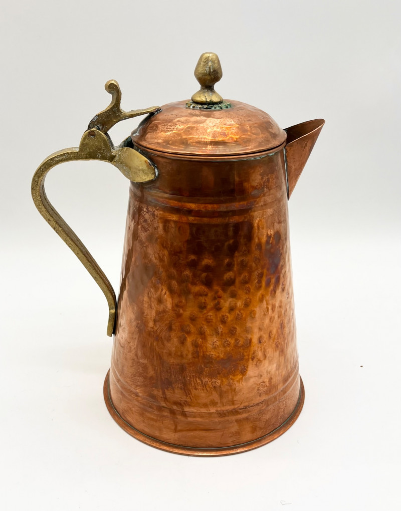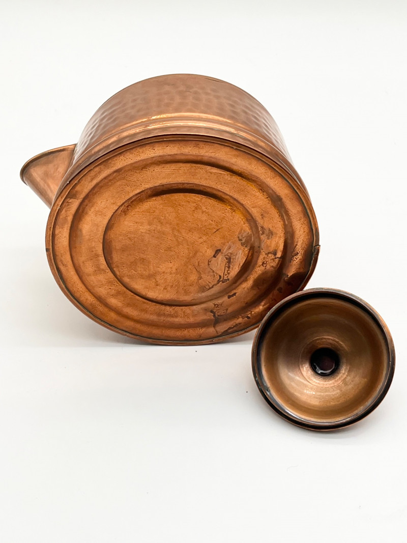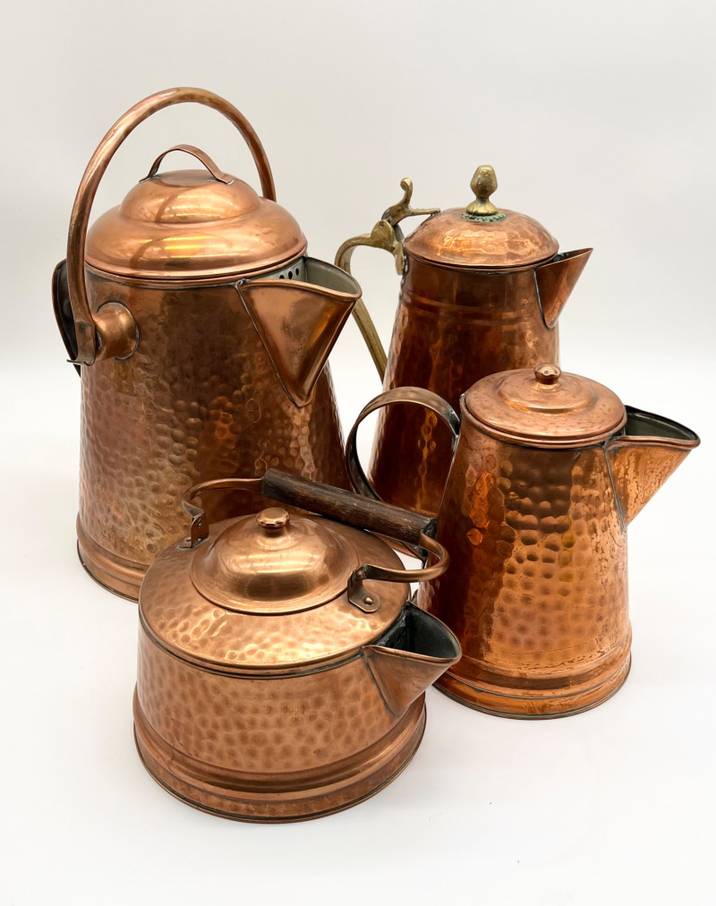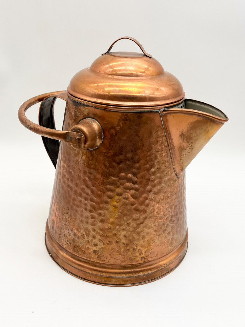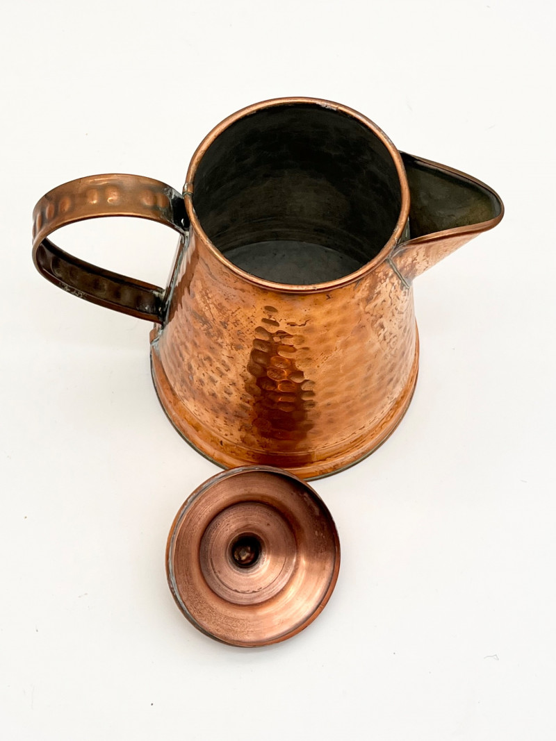 Hammered Copper Lot This lot includes two coffee pots, a teapot, and a jug with a hinged lid. I don't believe any of these pieces are solid copper but they are all in very nice vintage condition. The tallest is 12" tall to the top of the handle.