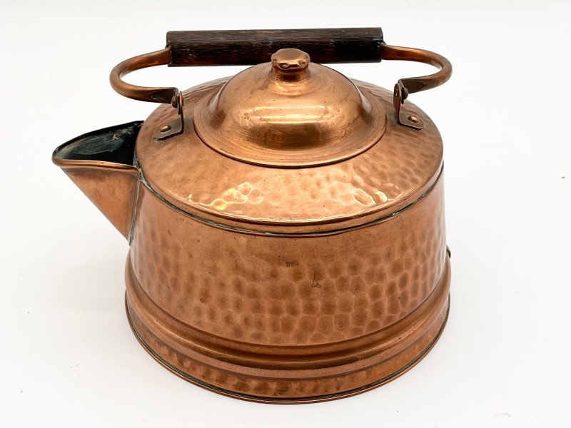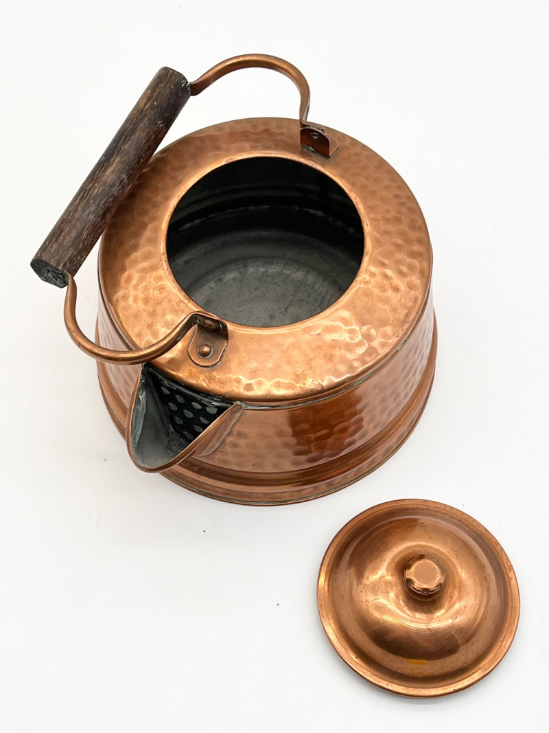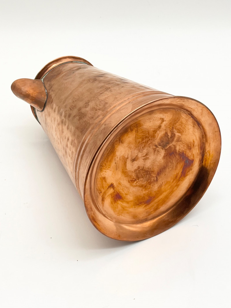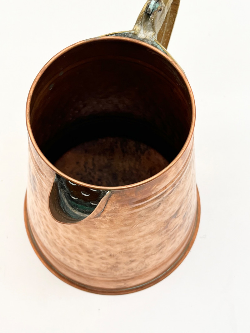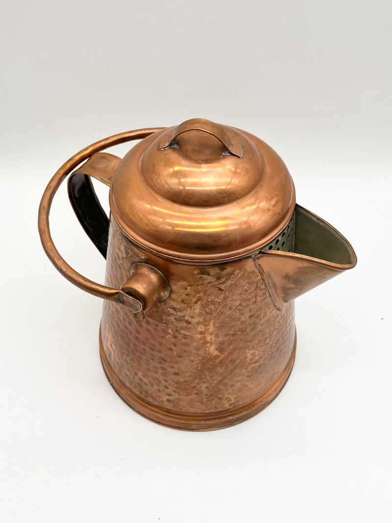 Hammered Copper Lot This lot includes two coffee pots, a teapot, and a jug with a hinged lid. I don't believe any of these pieces are solid copper but they are all in very nice vintage condition. The tallest is 12" tall to the top of the handle.