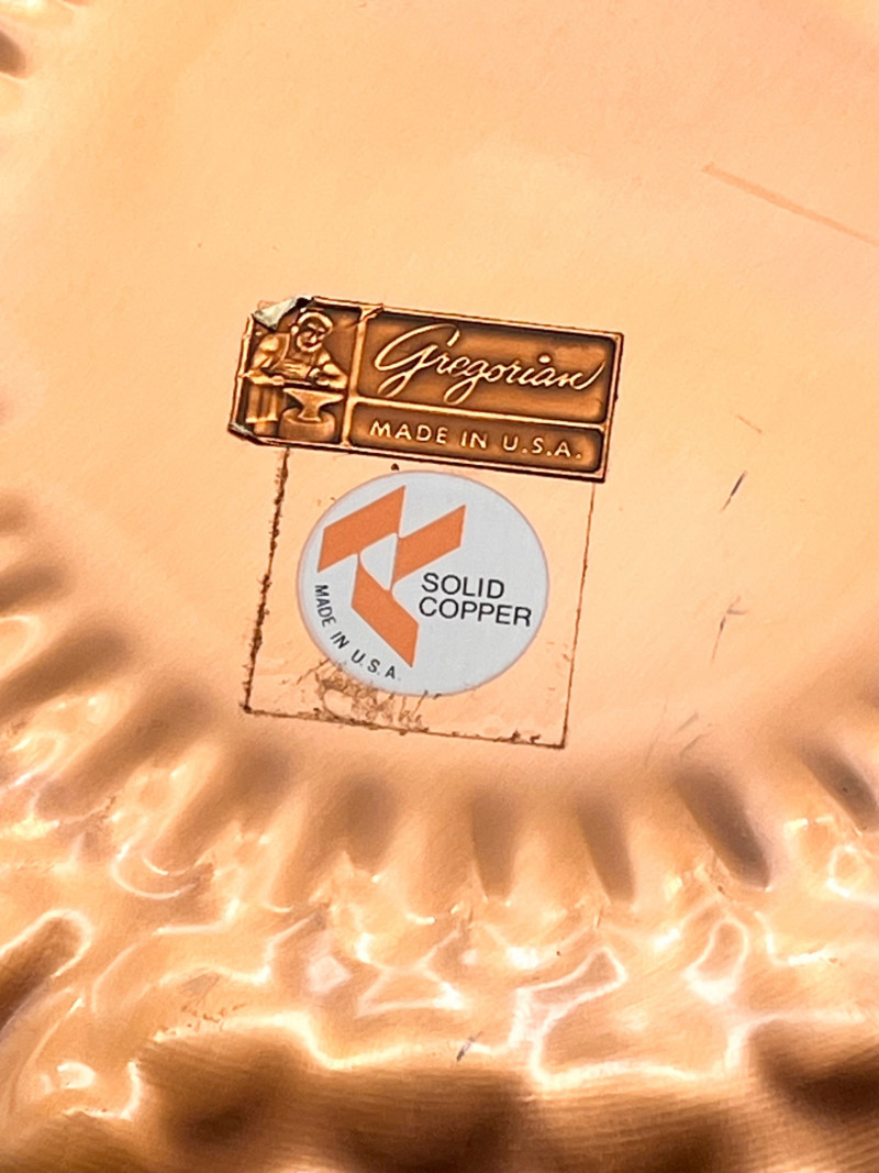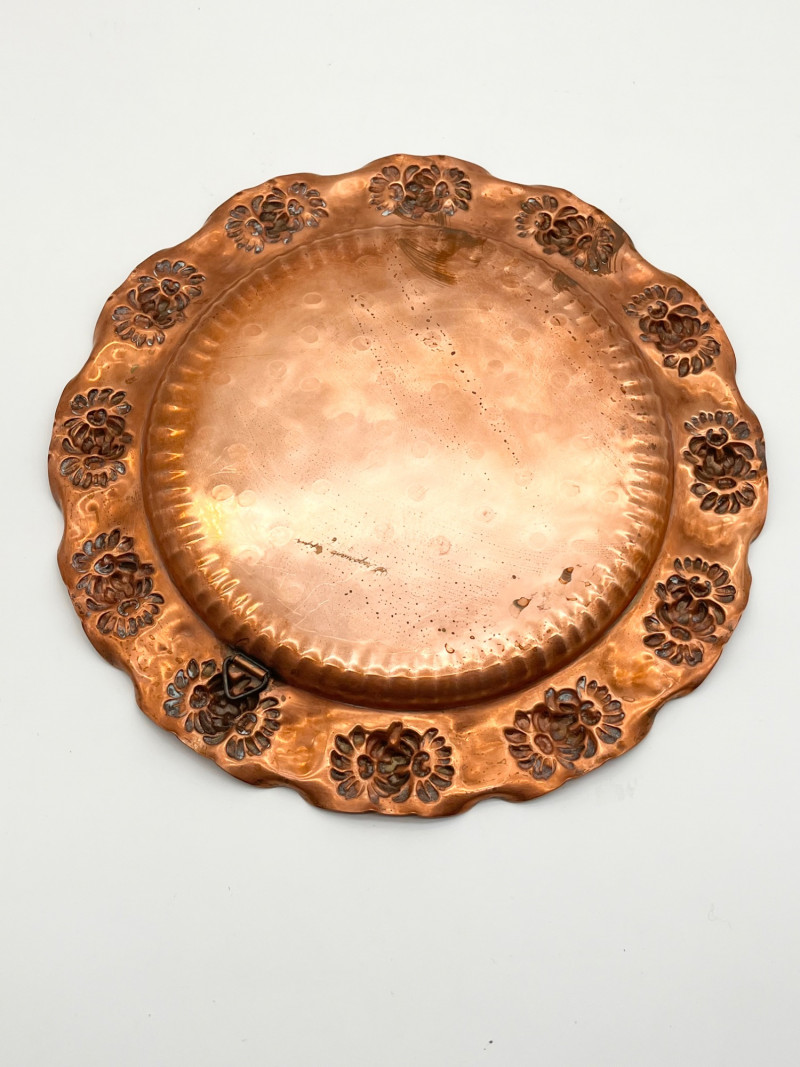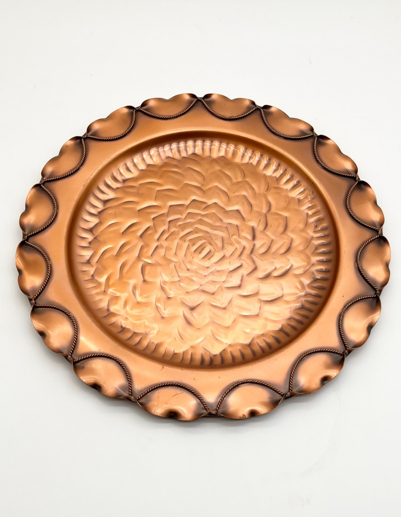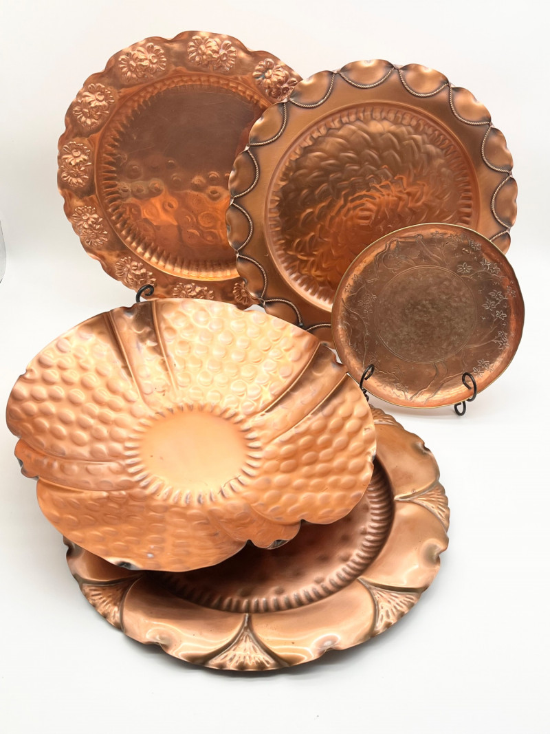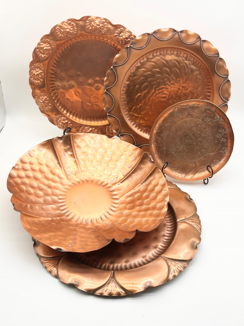 Copper Platters, Plate, and Large Bowl All pieces are in nice vintage condition. I believe these to all be solid copper. Widest plater is 15", smallest is 8 1/2"