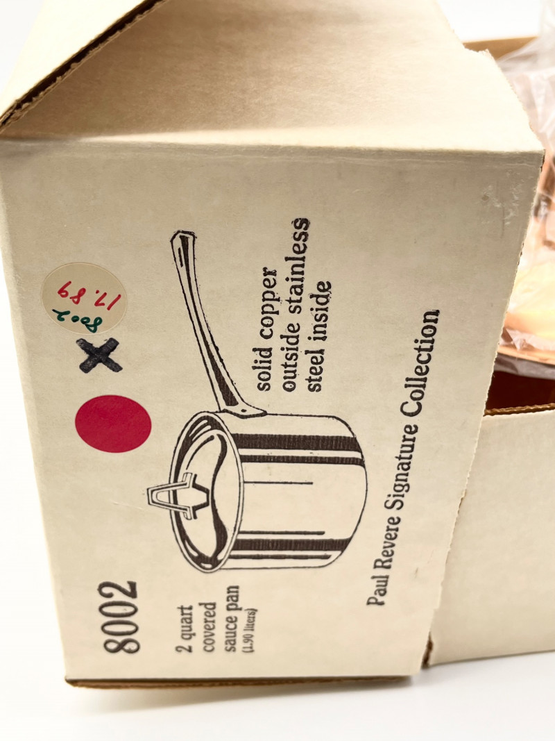 Copper Revere Ware 2 Skillets and 2 Sauce Pans New Old Stock in Boxes This lot includes: