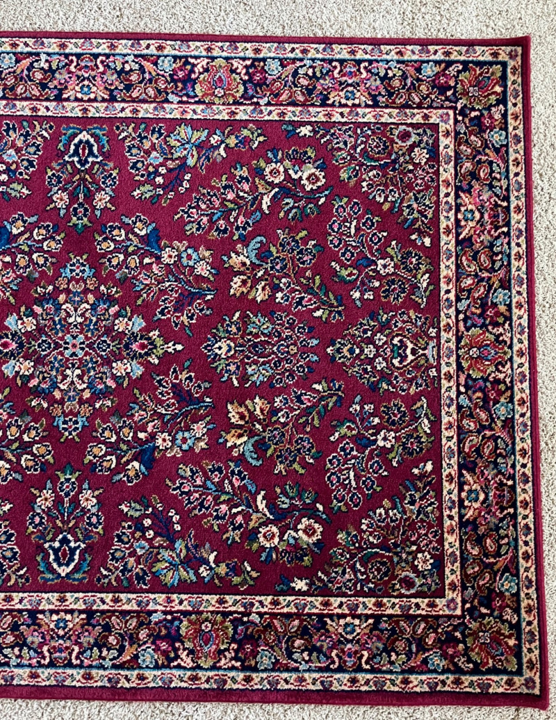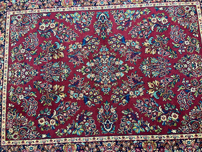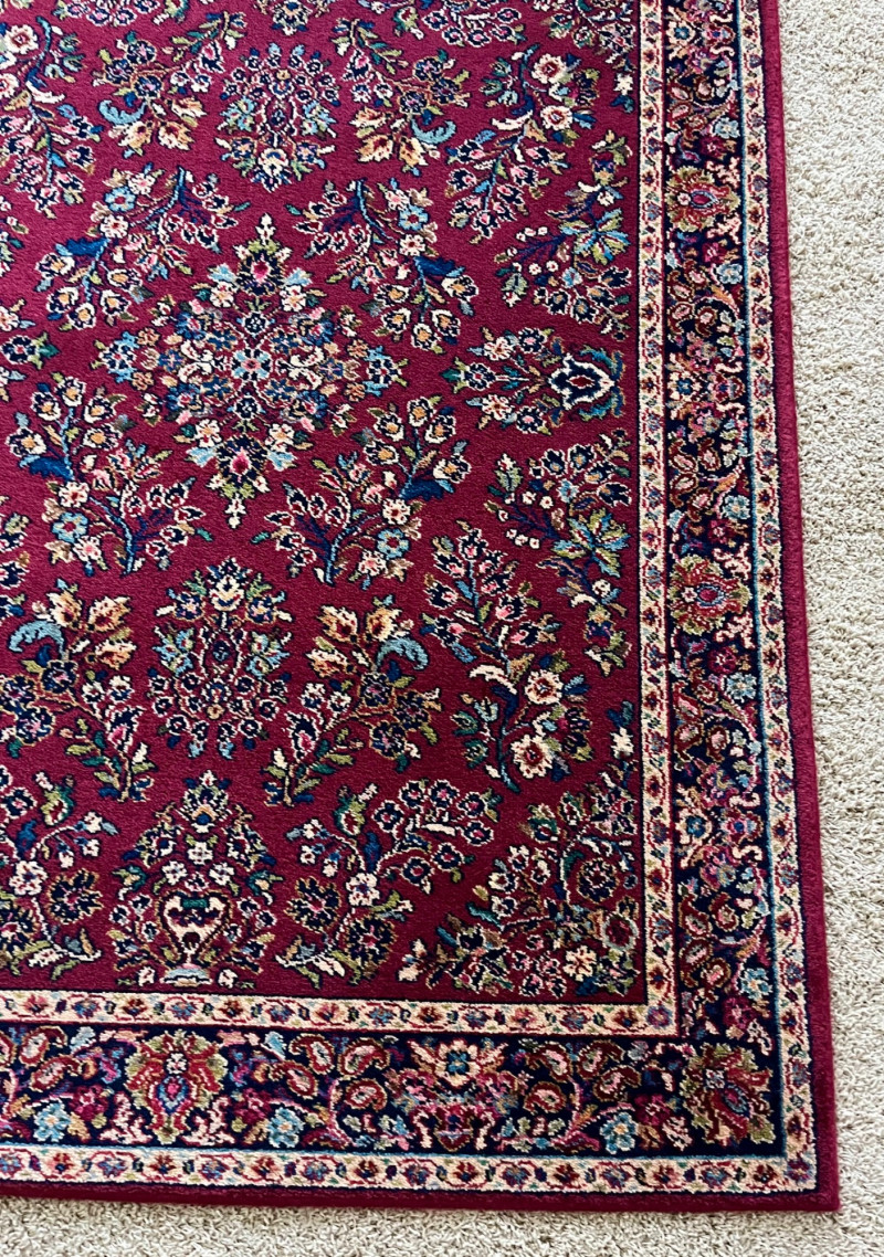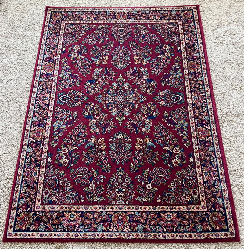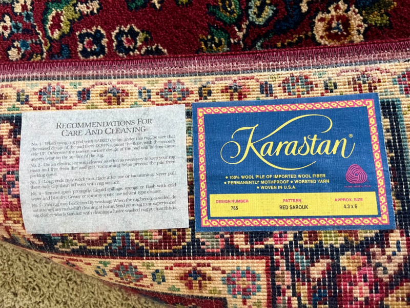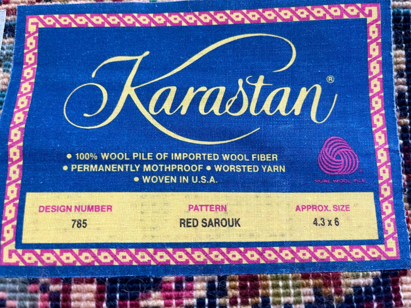 Karistan Red Sarouk 4.3’ x 6’ Wool Rug #1 This rug looks to be in very good condition with no stains that I see. There are no signs of wear such as threadbare, warping, or fading. There are two of these rugs in this auction. The other is in lot #203