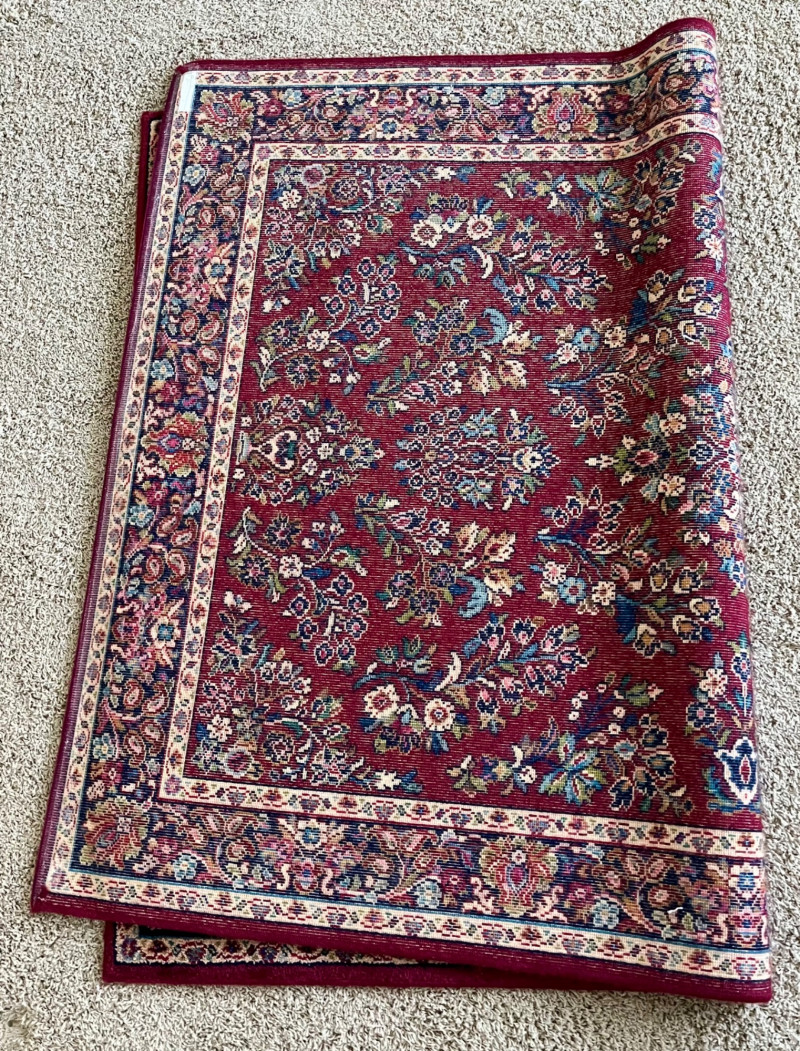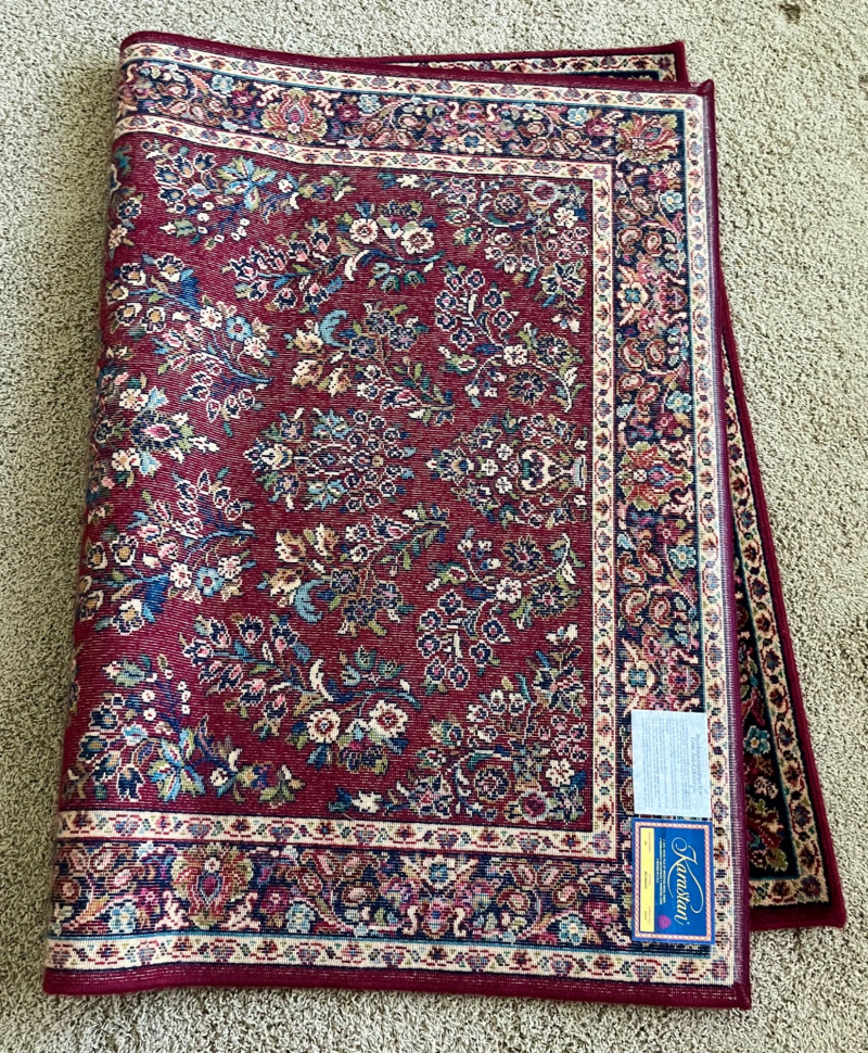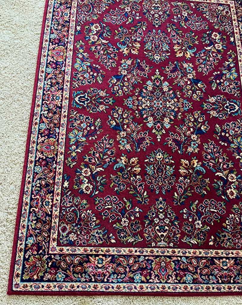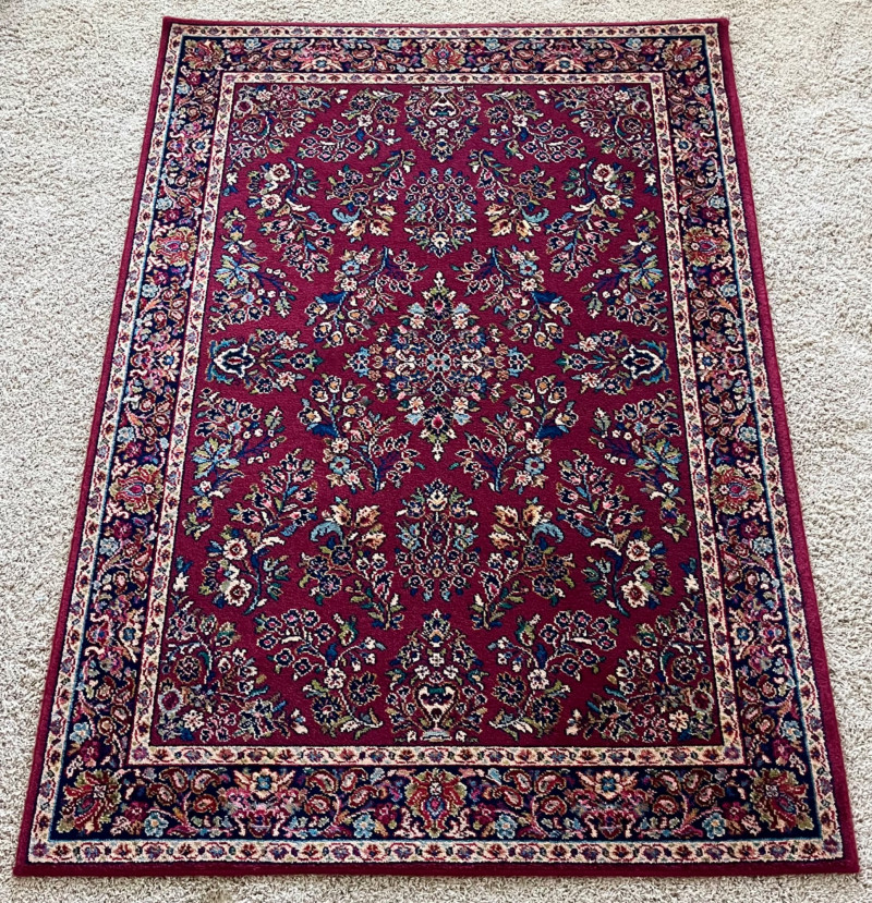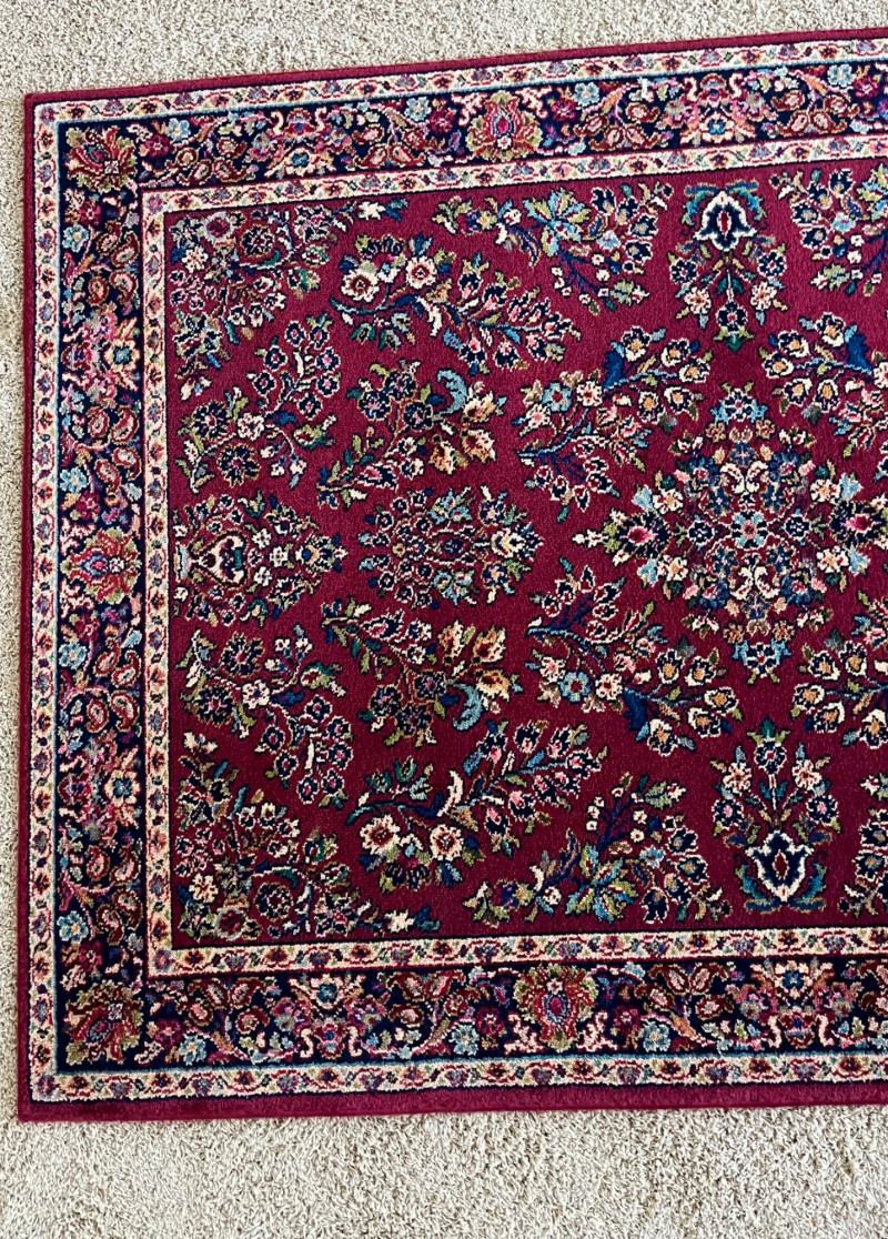 Karistan Red Sarouk 4.3’ x 6’ Wool Rug #1 This rug looks to be in very good condition with no stains that I see. There are no signs of wear such as threadbare, warping, or fading. There are two of these rugs in this auction. The other is in lot #203