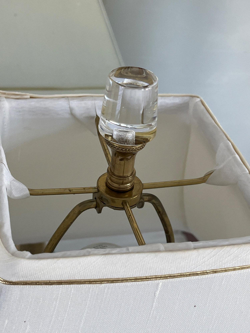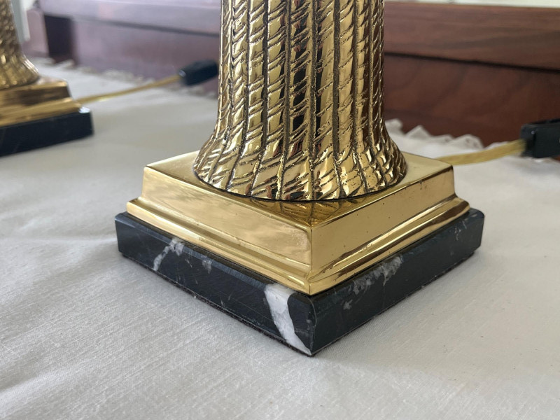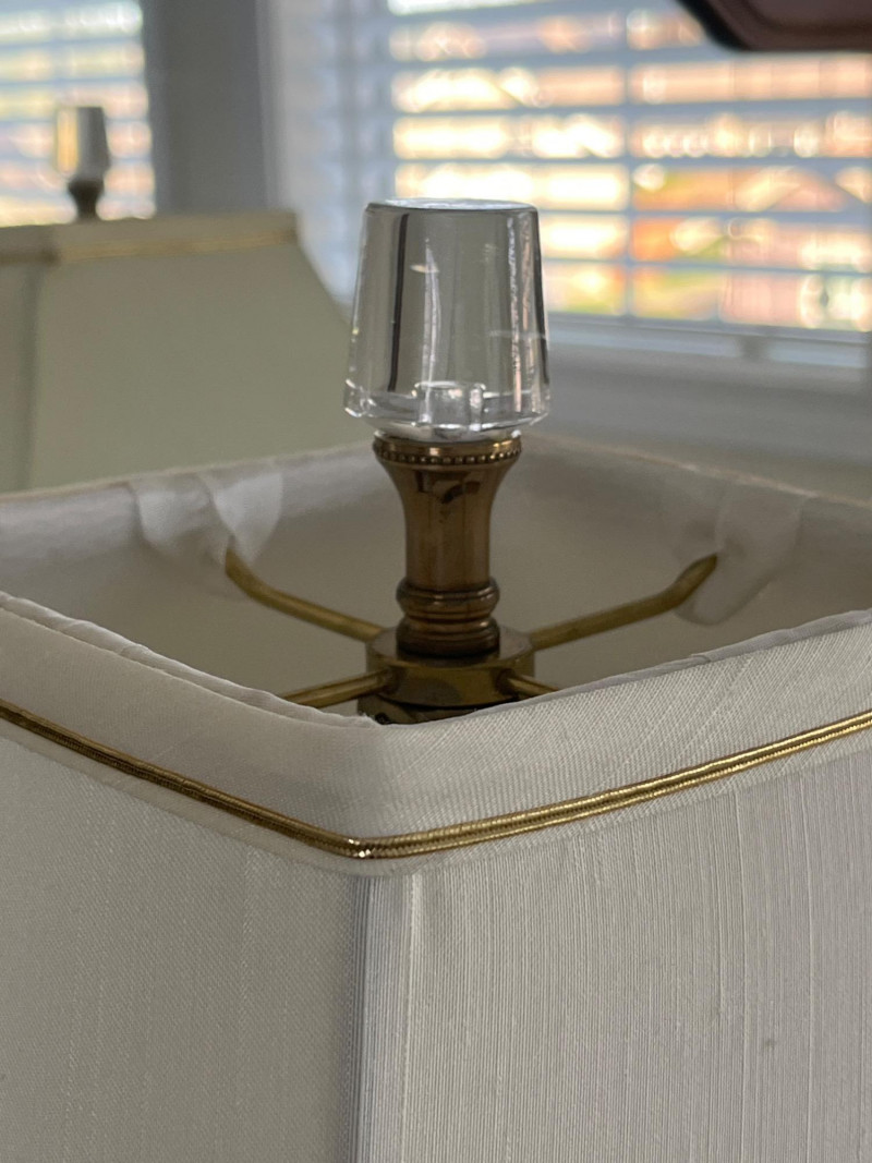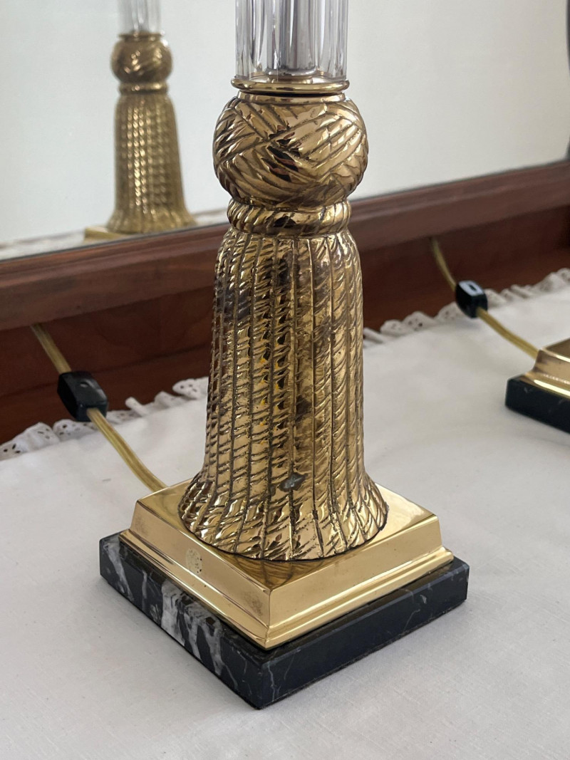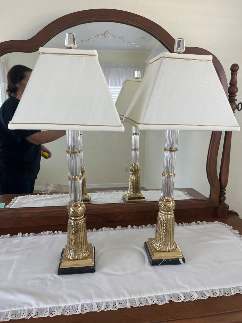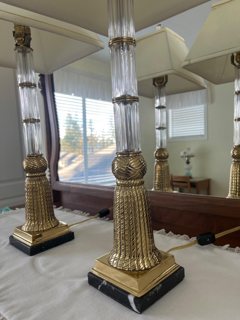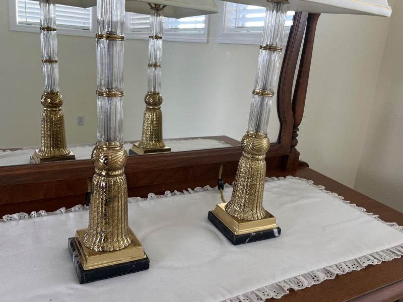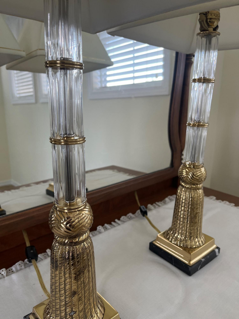 Two French Neoclassical Styled Glass & Brass Lamps w/ Crystal Finials These measure 26 1/2" tall to the top of the finials and are in very good condition. The marble bases add weight to the bottom keeping these bottom heavy to prevent tipping, a great feature to look for in lamps with a tall and narrow design. The shades have a delicate gold trim that compliment the French style of the lamps nicely.
