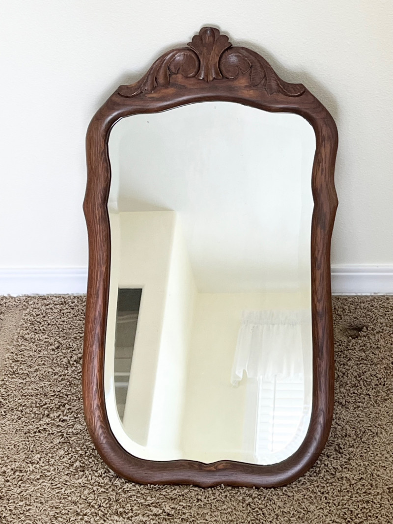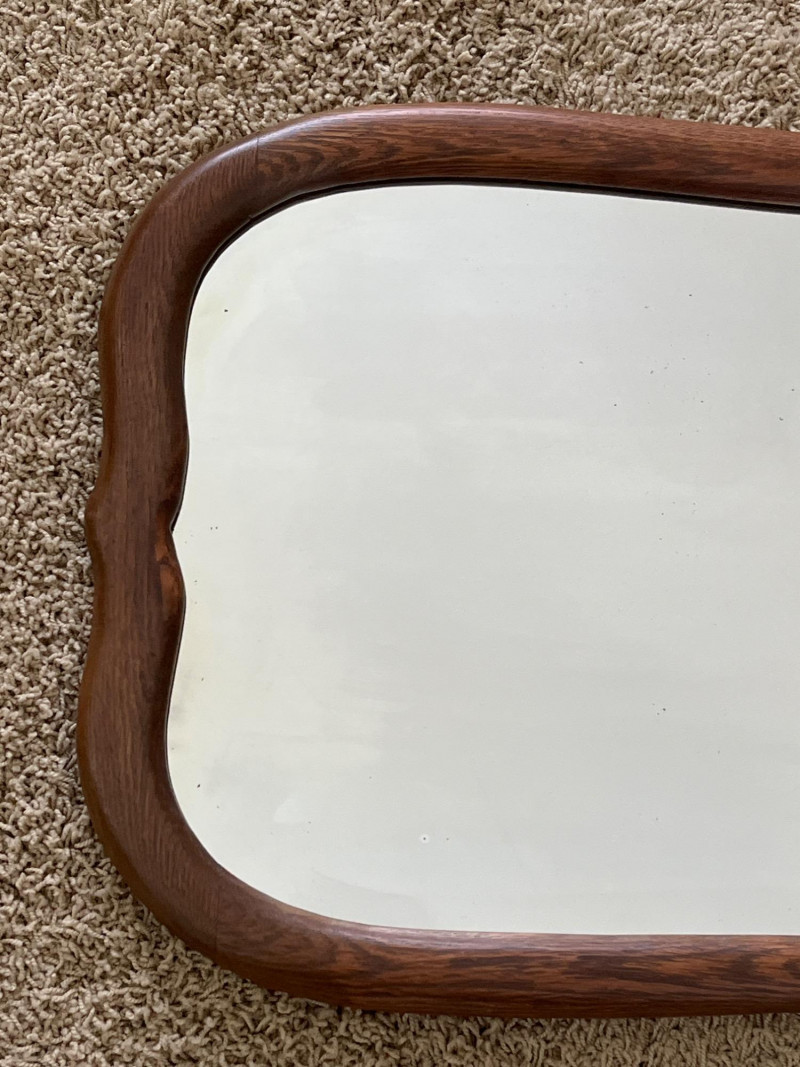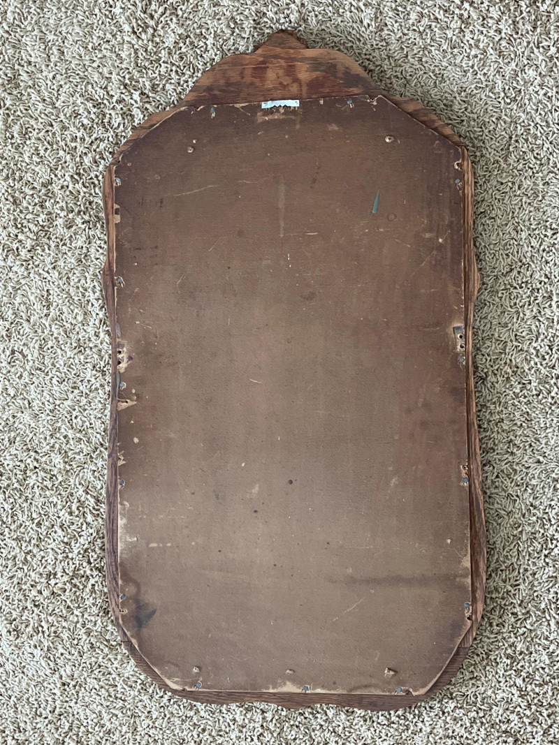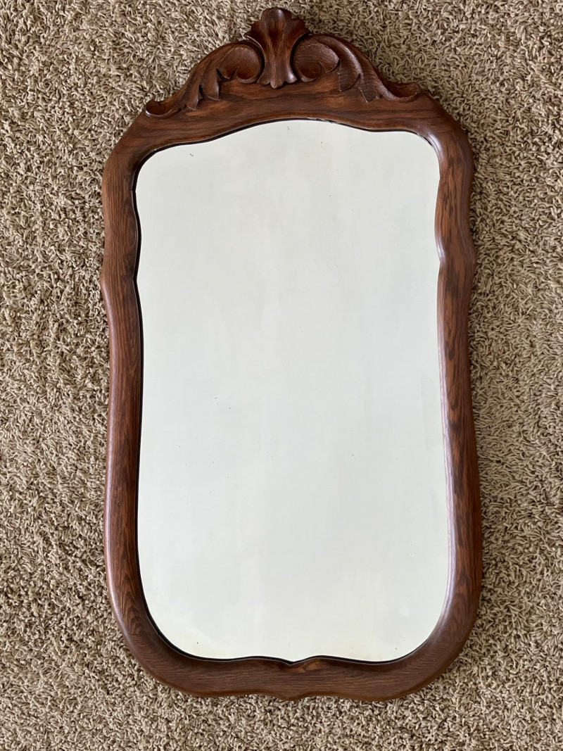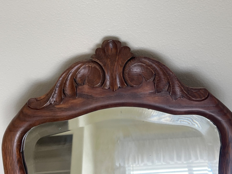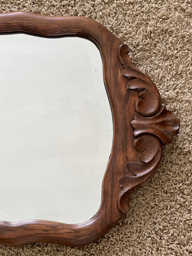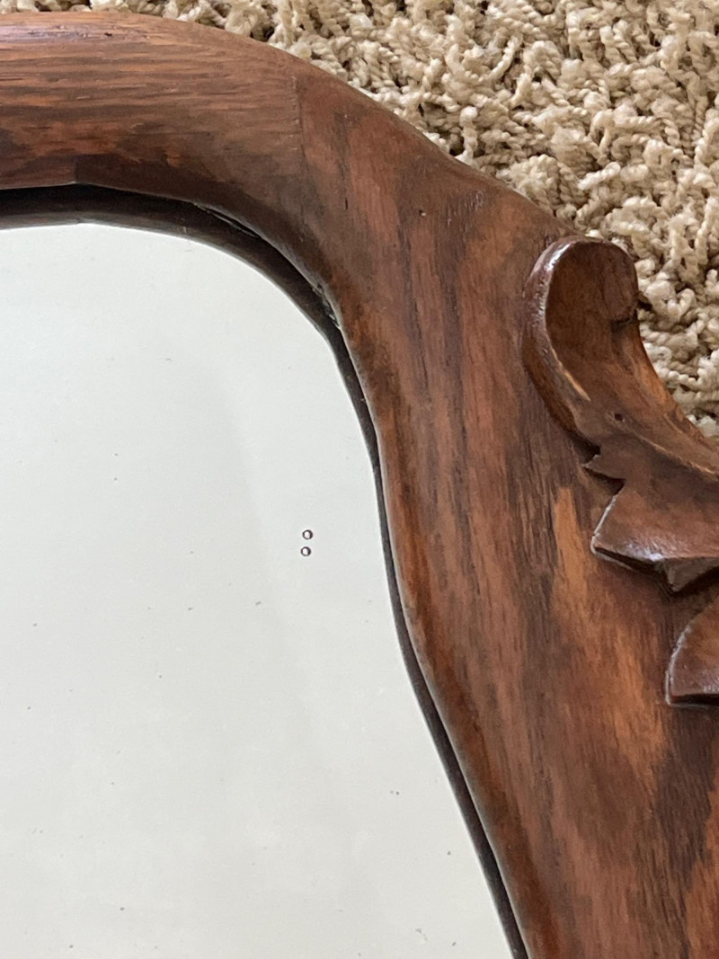 Antique Hand Carved Wood Framed Mirror This mirror measures 28 1/2" tall and 16" wide and is in good condition that is consistent with age.