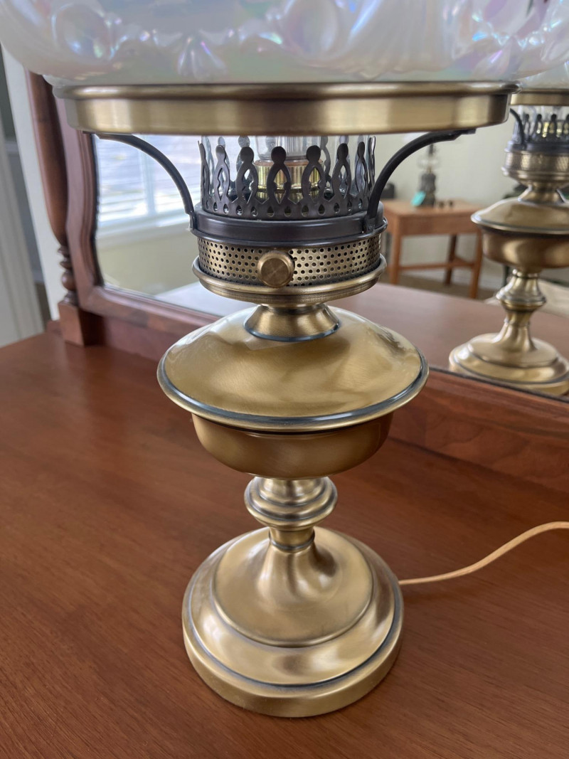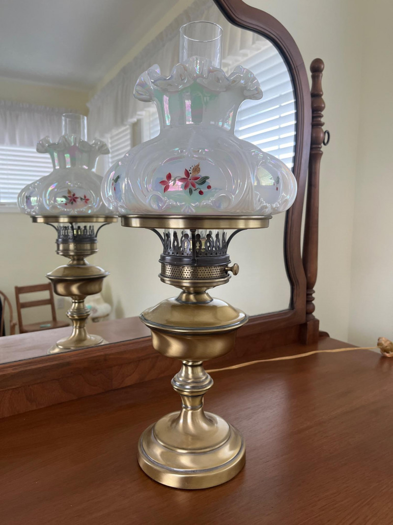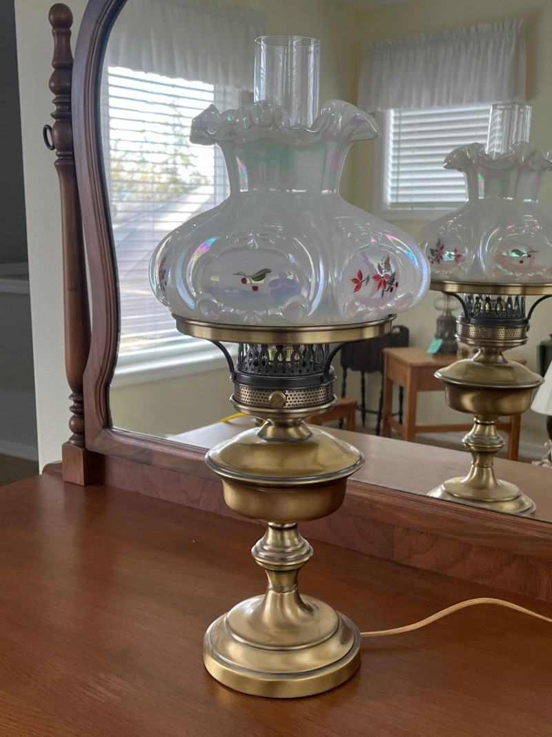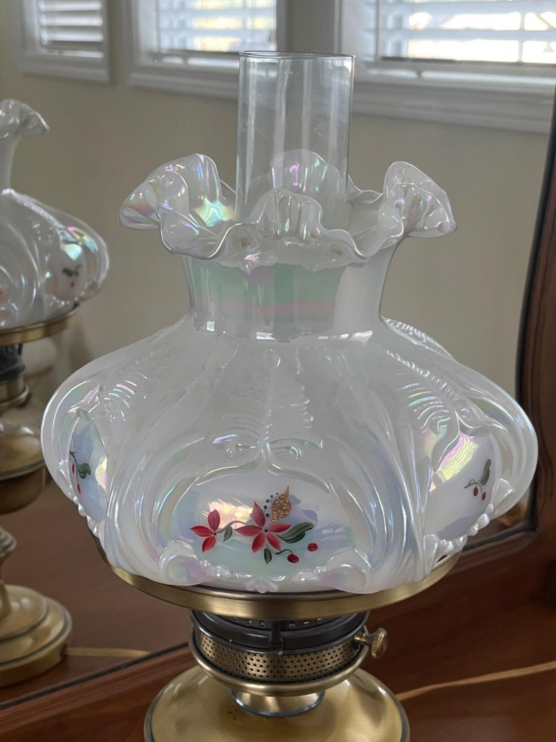Fenton Hand Painted Iridescent Shade Hurricane Lamp Signed by Artist This one or a kind lamp measures 18 1/2" to the top of the clear glass chimney. The milk glass shade has an iridescent finish and was hand painted by a Fenton company artist, J. Watson. The body of the lamp is brushed brass with an antique finish. All pieces look to be in good condition and the lamp is in working order.
