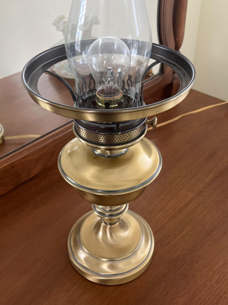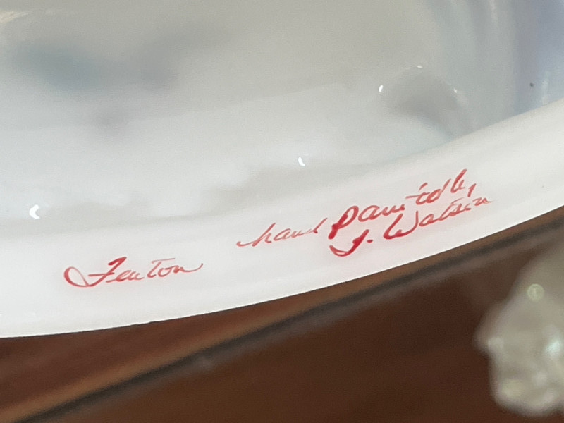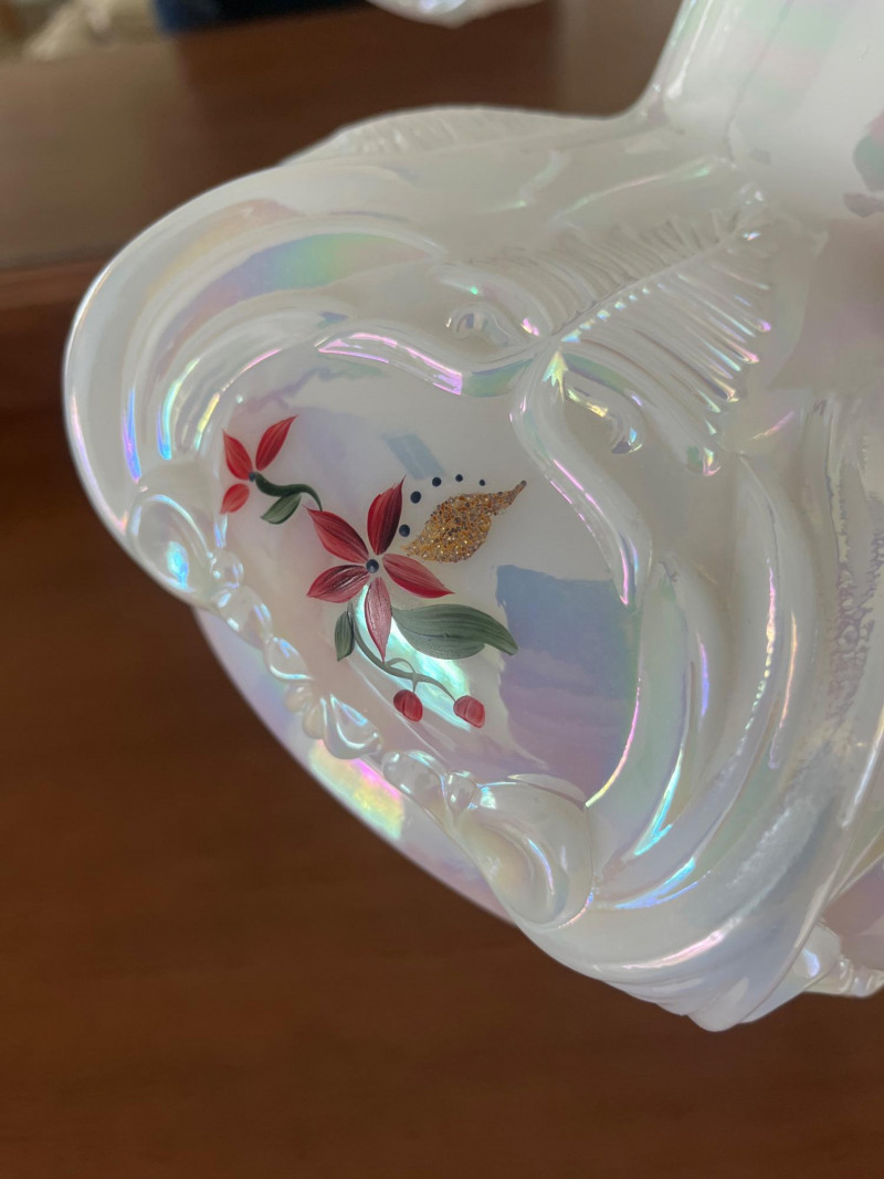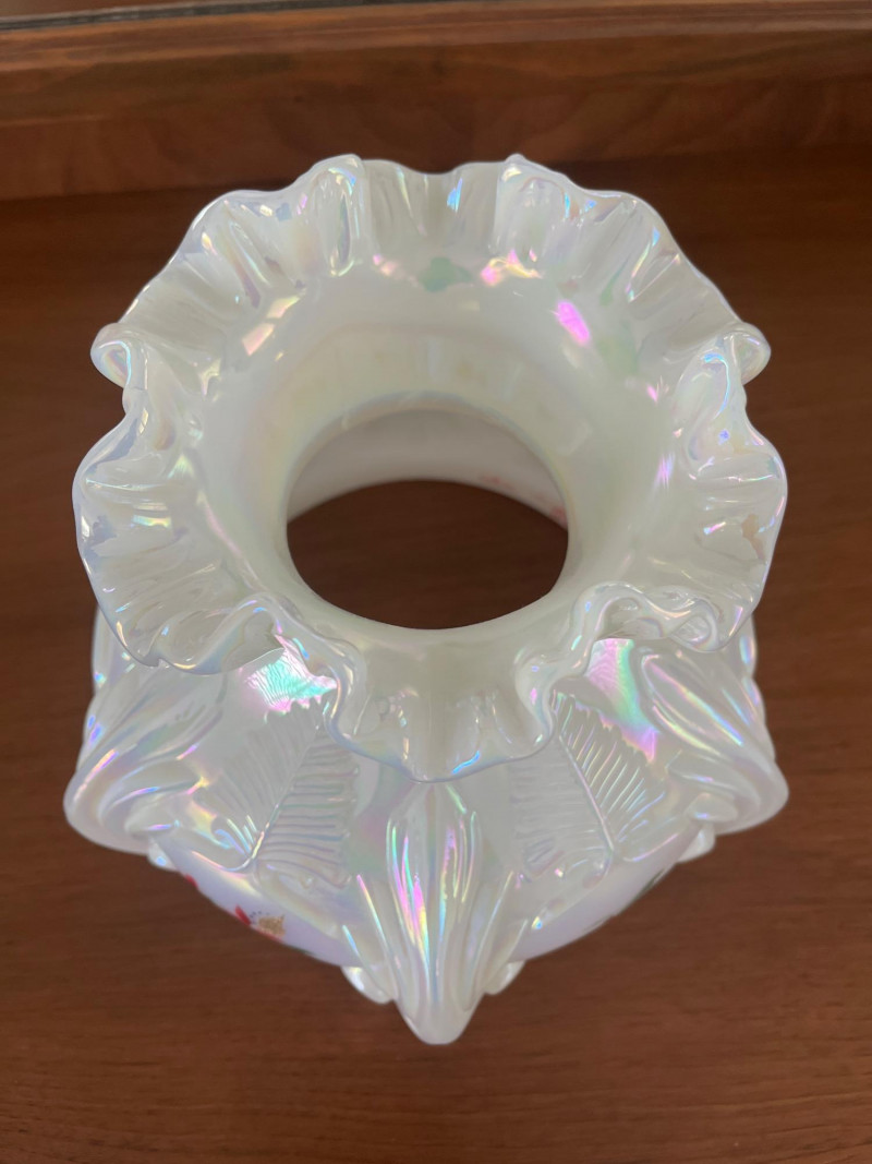Fenton Hand Painted Iridescent Shade Hurricane Lamp Signed by Artist This one or a kind lamp measures 18 1/2" to the top of the clear glass chimney. The milk glass shade has an iridescent finish and was hand painted by a Fenton company artist, J. Watson. The body of the lamp is brushed brass with an antique finish. All pieces look to be in good condition and the lamp is in working order.
