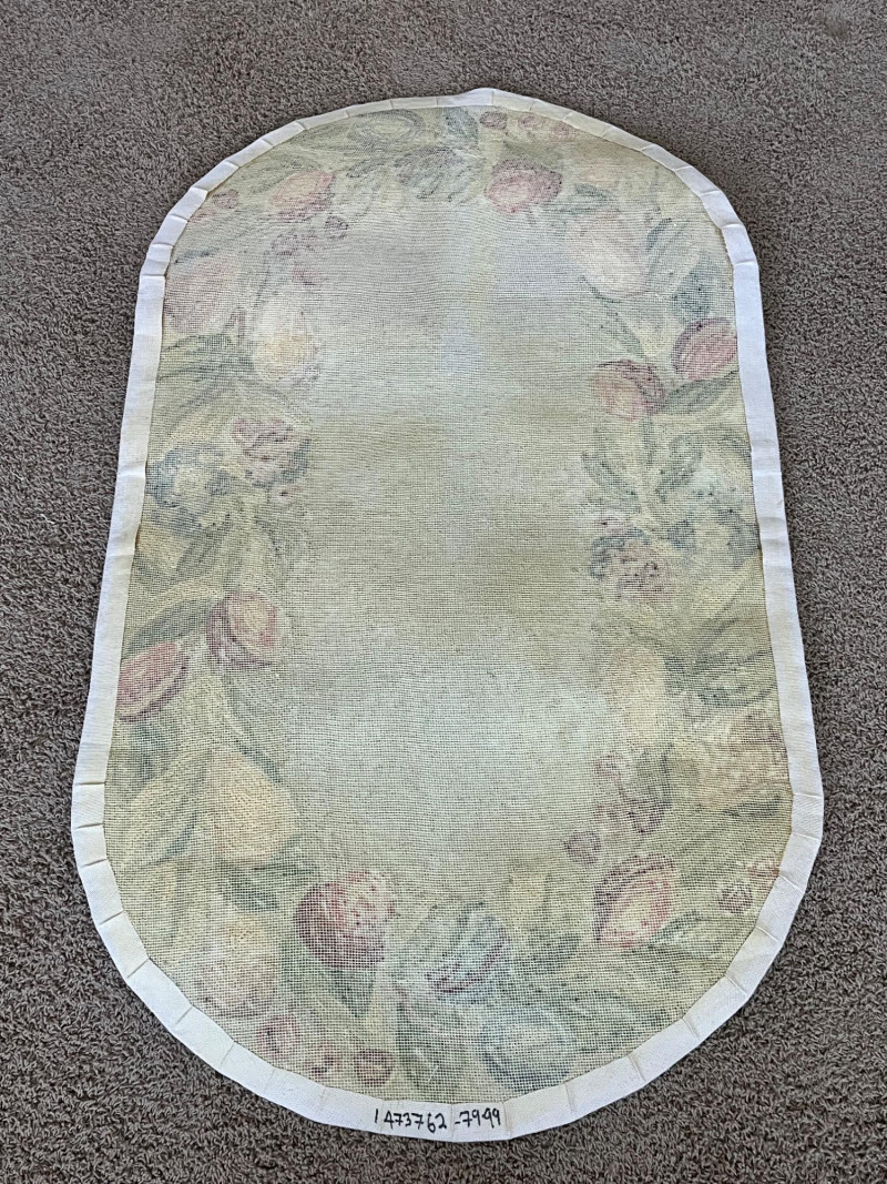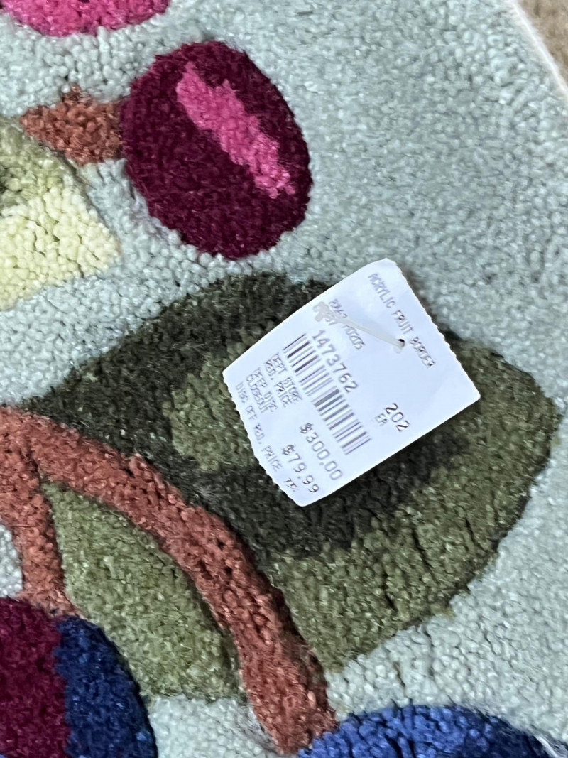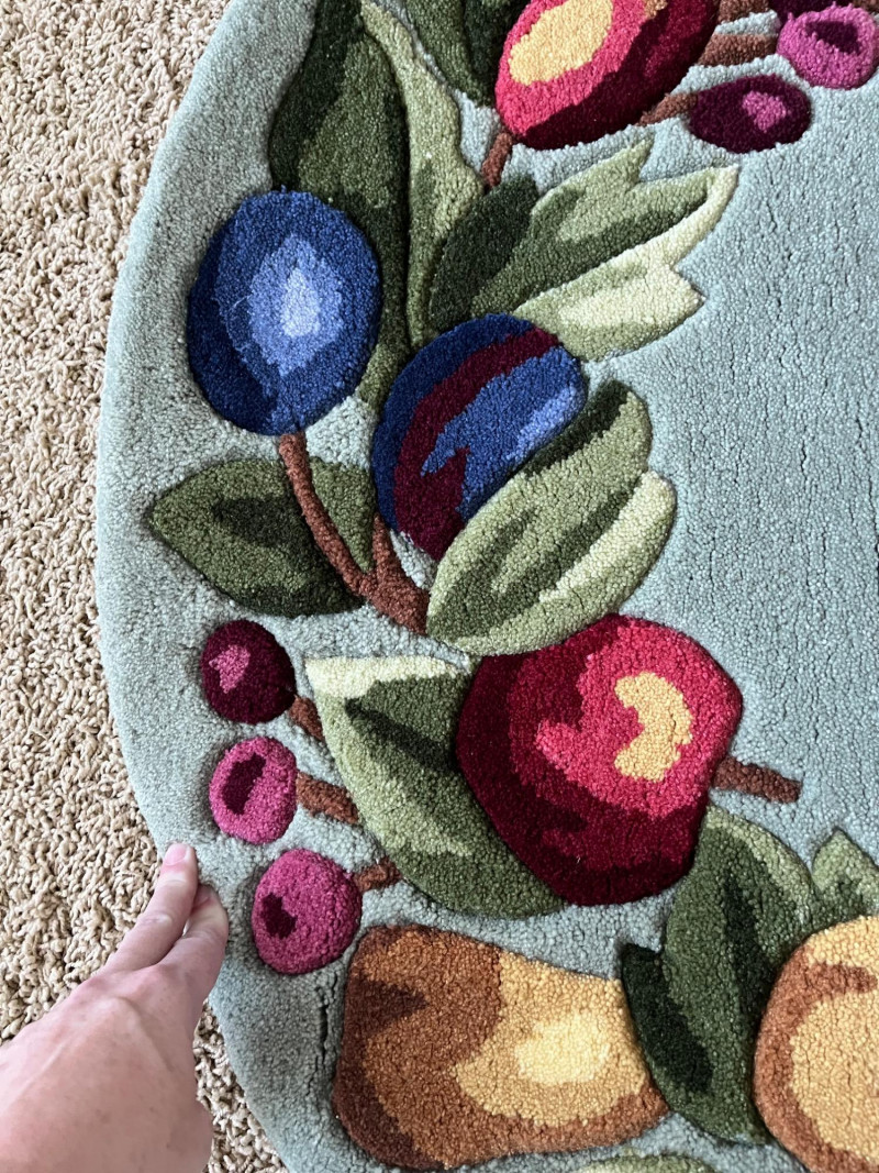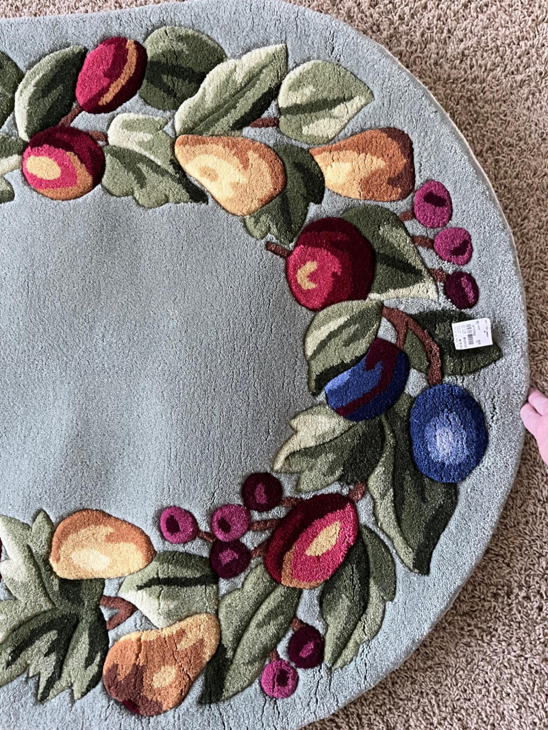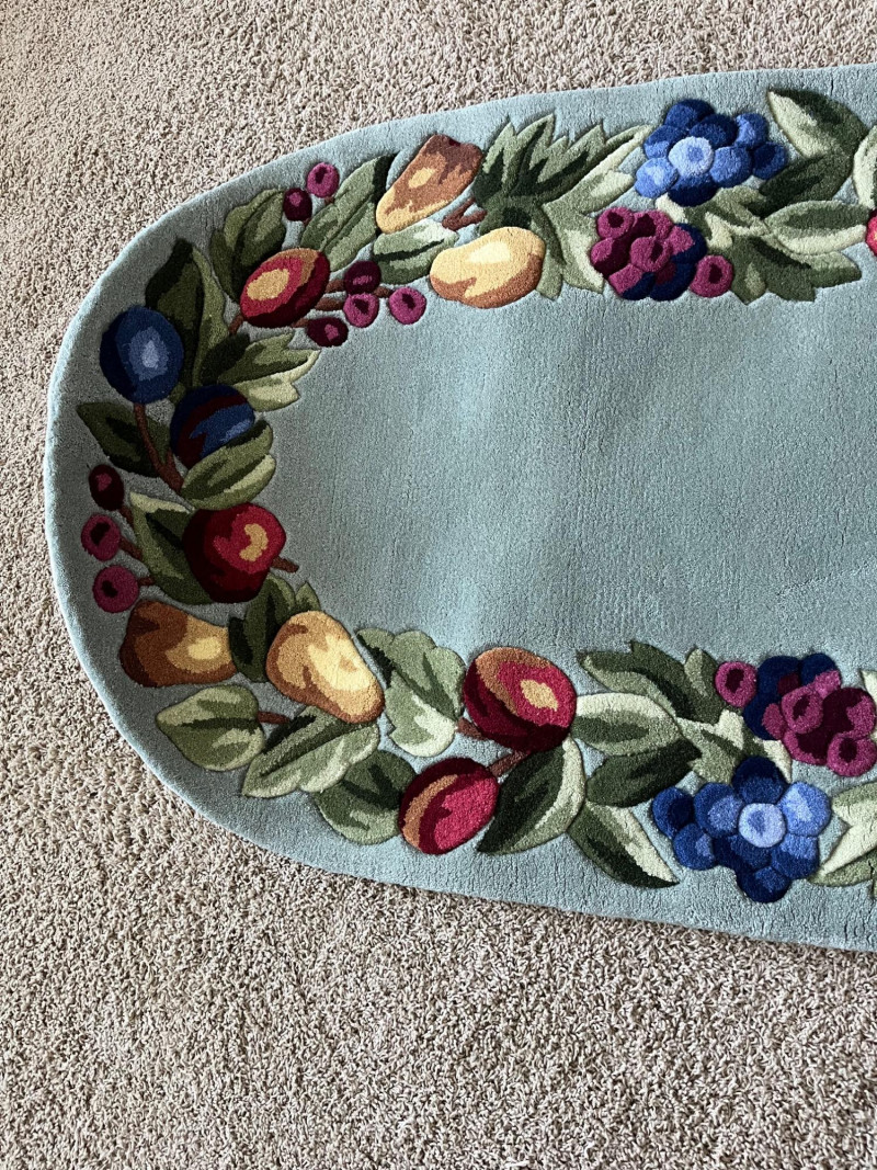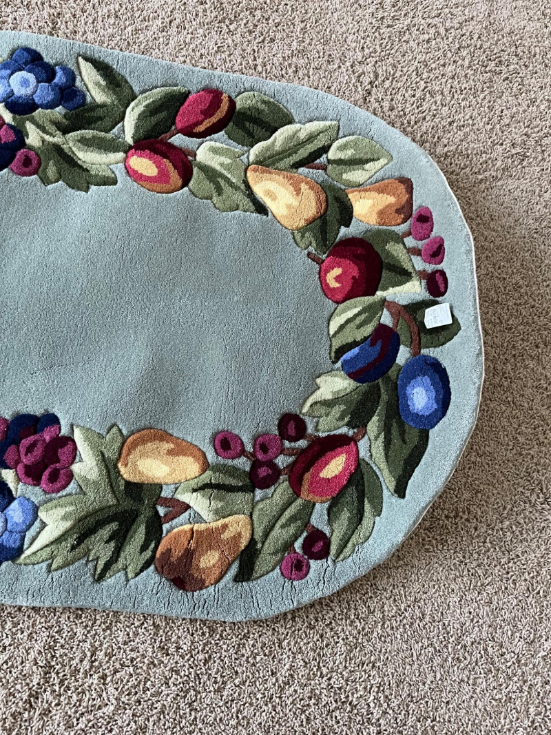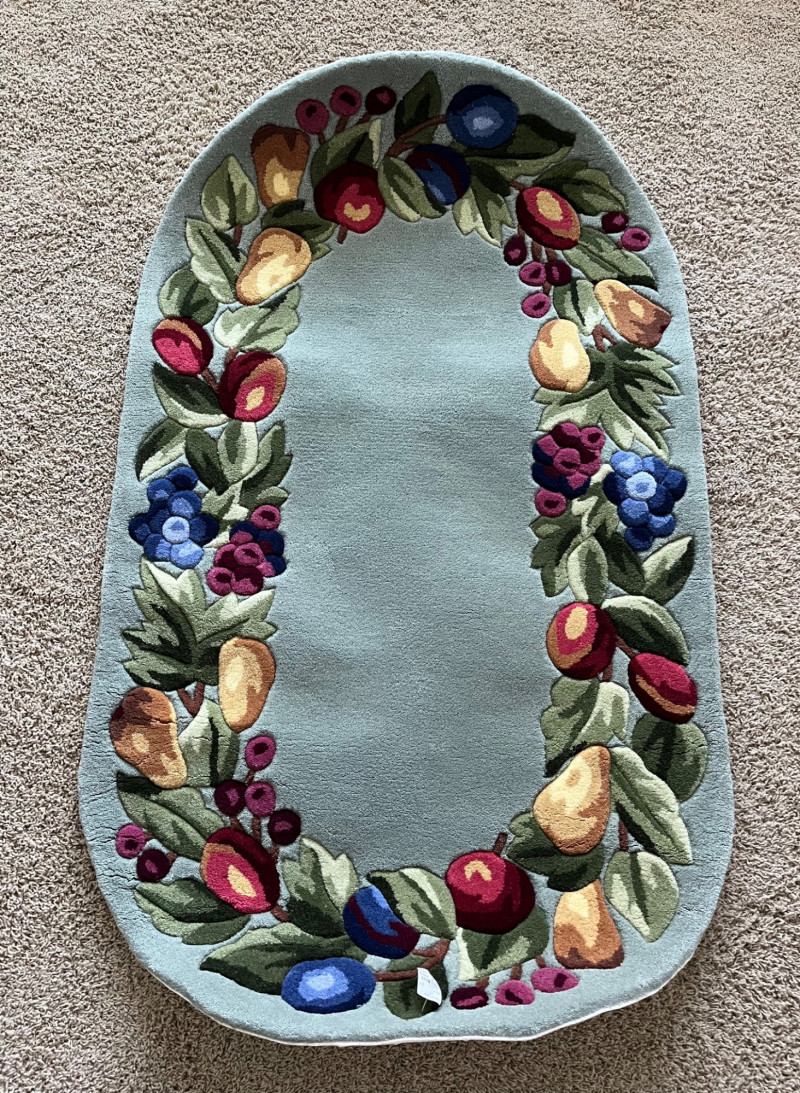 Sage Green Oval Rug with a Fruit Themed Border This rug measures approximately 2 1/2' x 5' and has never been used. The backing has slightly stiffened as the material has aged, rolled up in storage and just needs to be flattened. The original price tag is still attached.