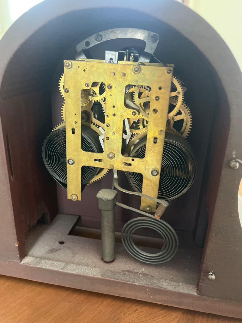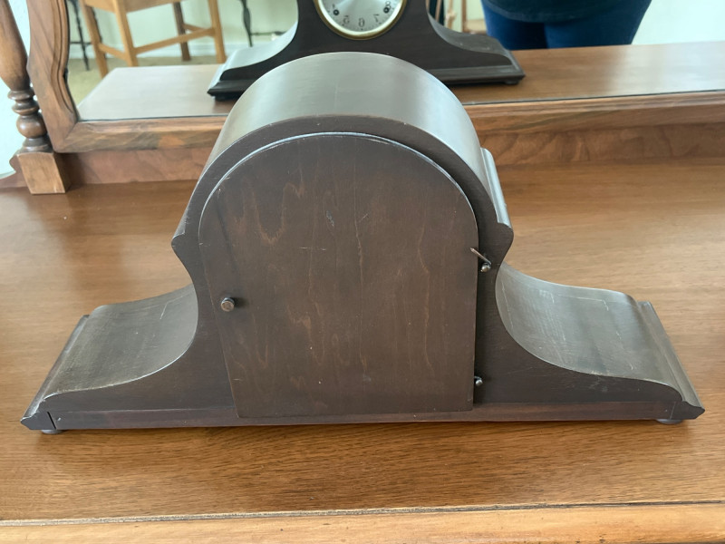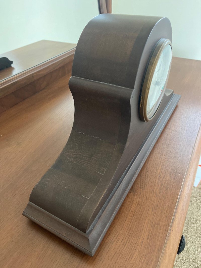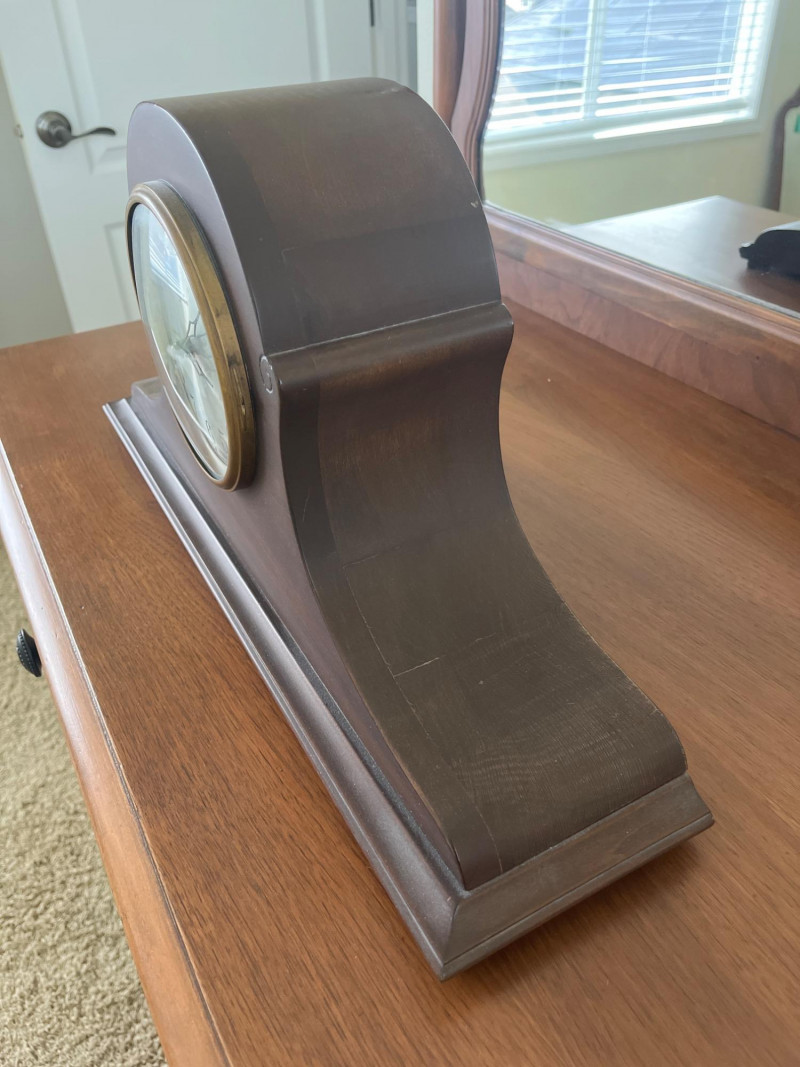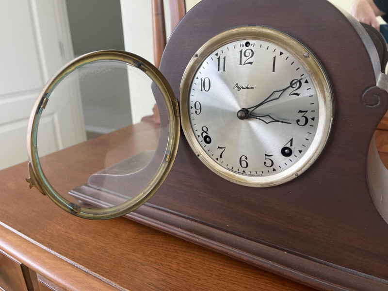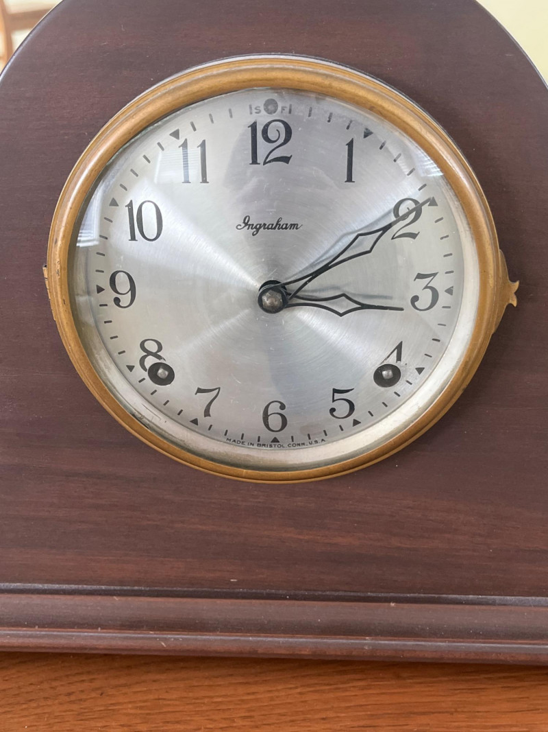 Antique Ingraham Mantle Clock - Not Working Measures 20 1/2" long and 10 1/4" tall. All components look to be intact, including the glass front. The back door comes off very easily and must be handled carefully. This is meant as either a decorative or for-parts piece.