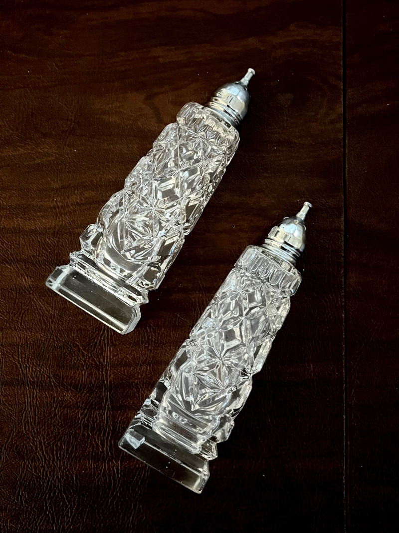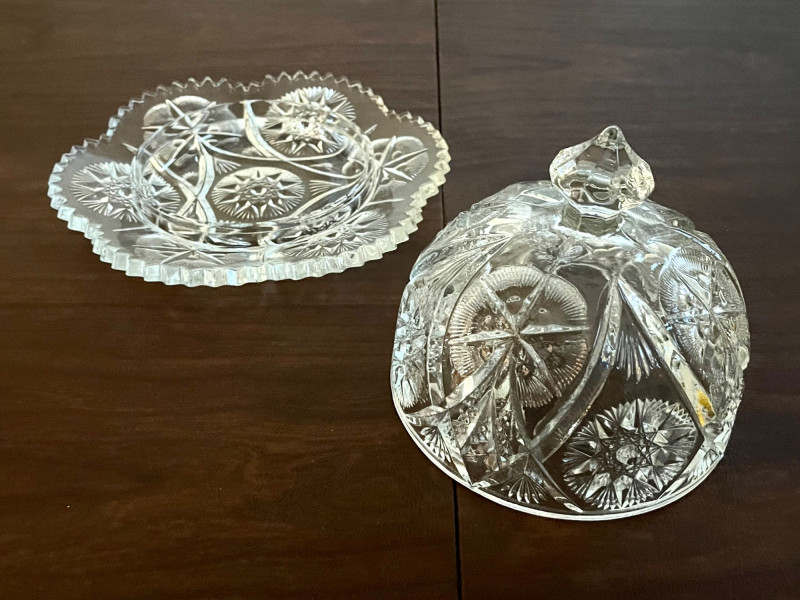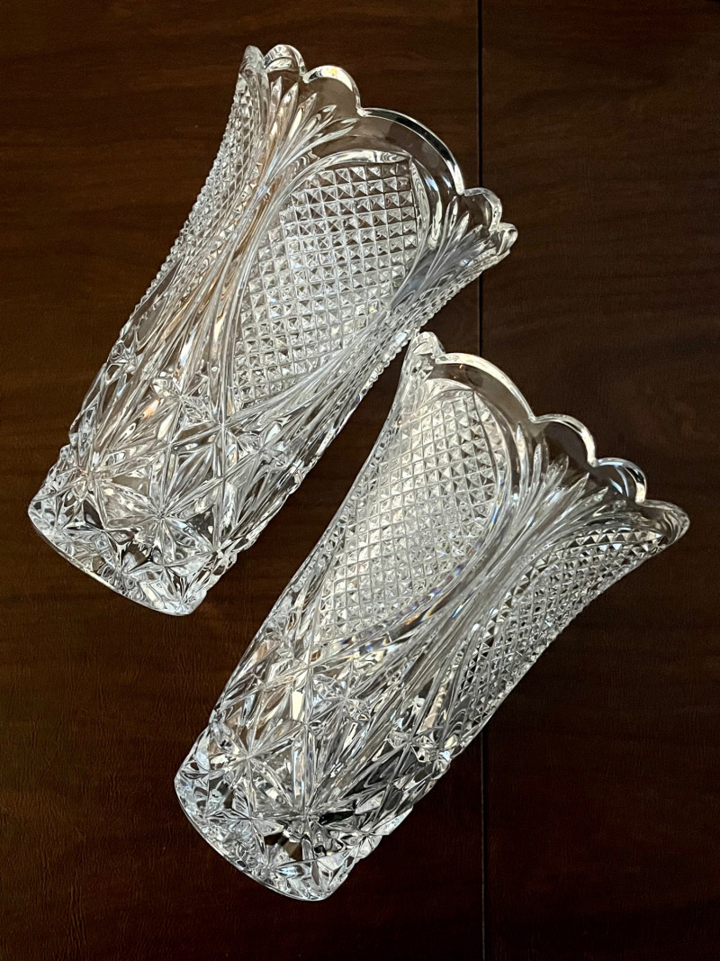 Elegant Crystal and Vintage Pressed Glass Lot This is an elegant variety of antique pressed glass and polished lead crystal. The lot includes Two identical pressed glass vases, an old fashioned round butter dish with lid, a salt and pepper shaker set, and three elegant bowls in a variety of sizes and designs. For perspective, the vases in the back are 8" tall.