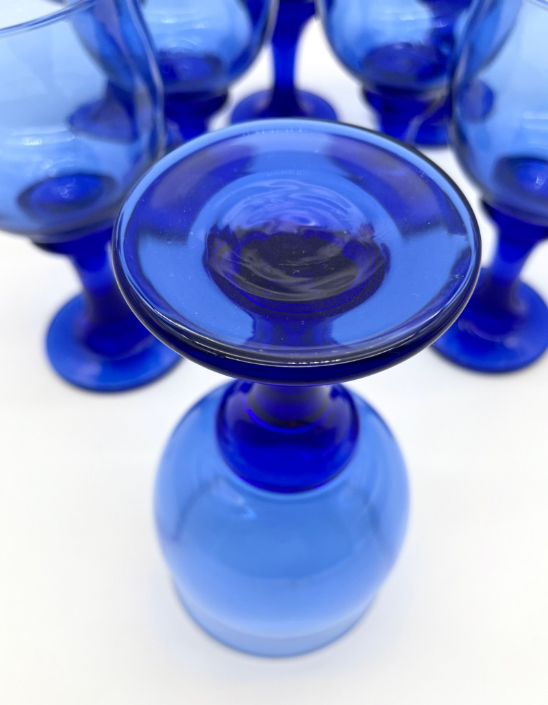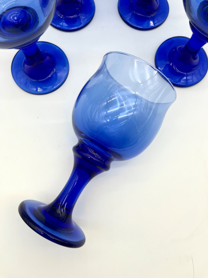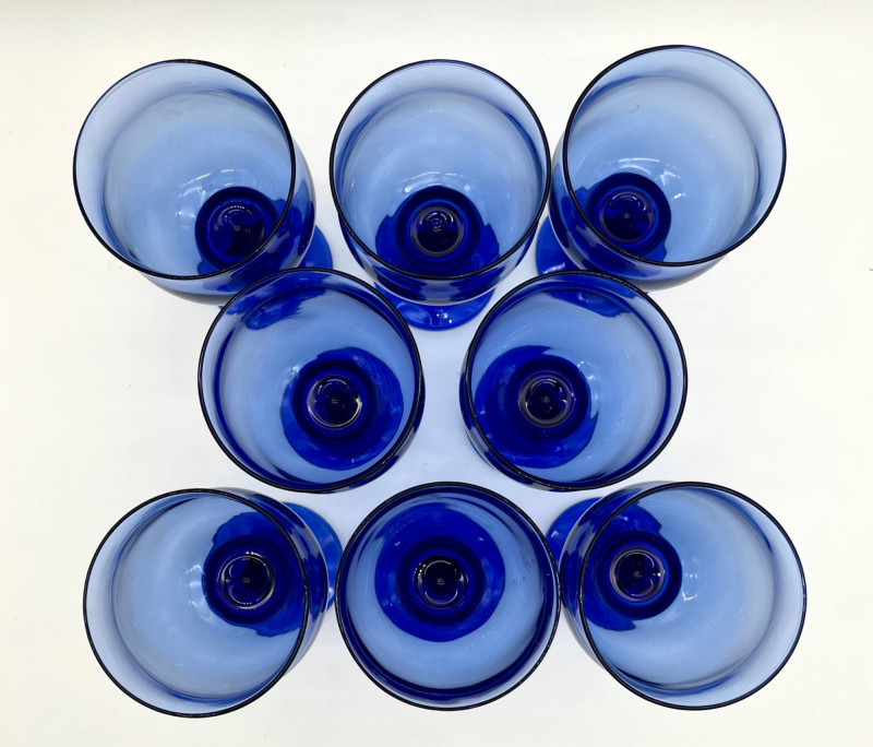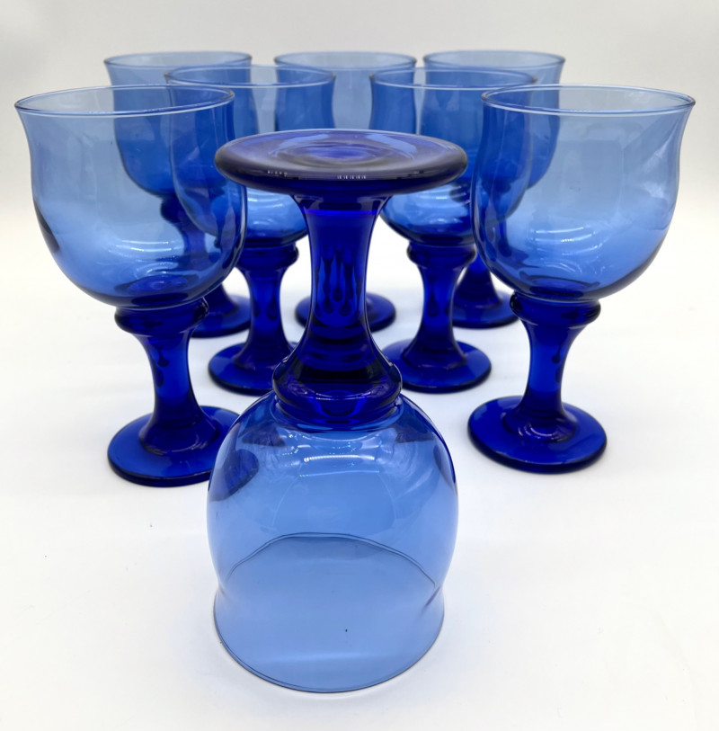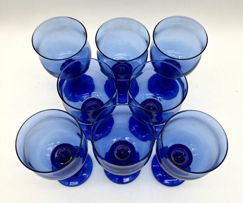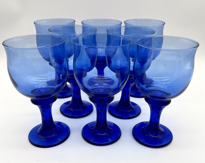 Set of 8 Libbey Clarion Cobalt Blue Water Goblets All eight glasses are in good condition with no cracks or chips. These are just under 7" tall.
