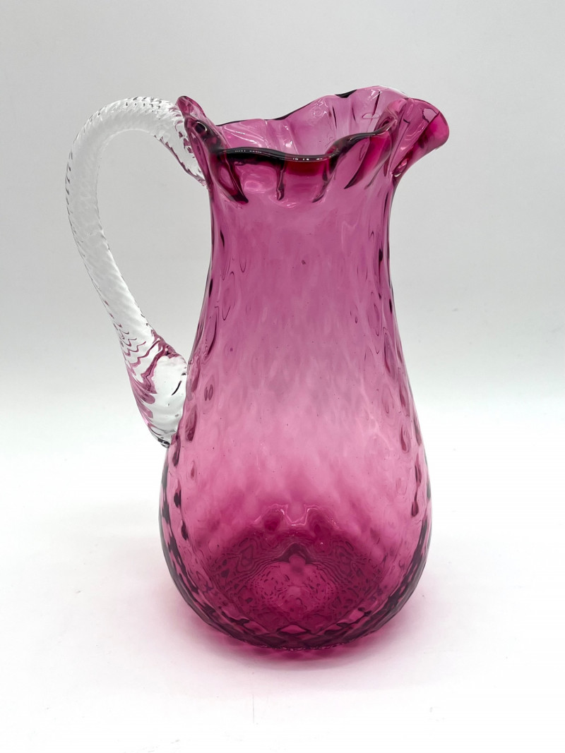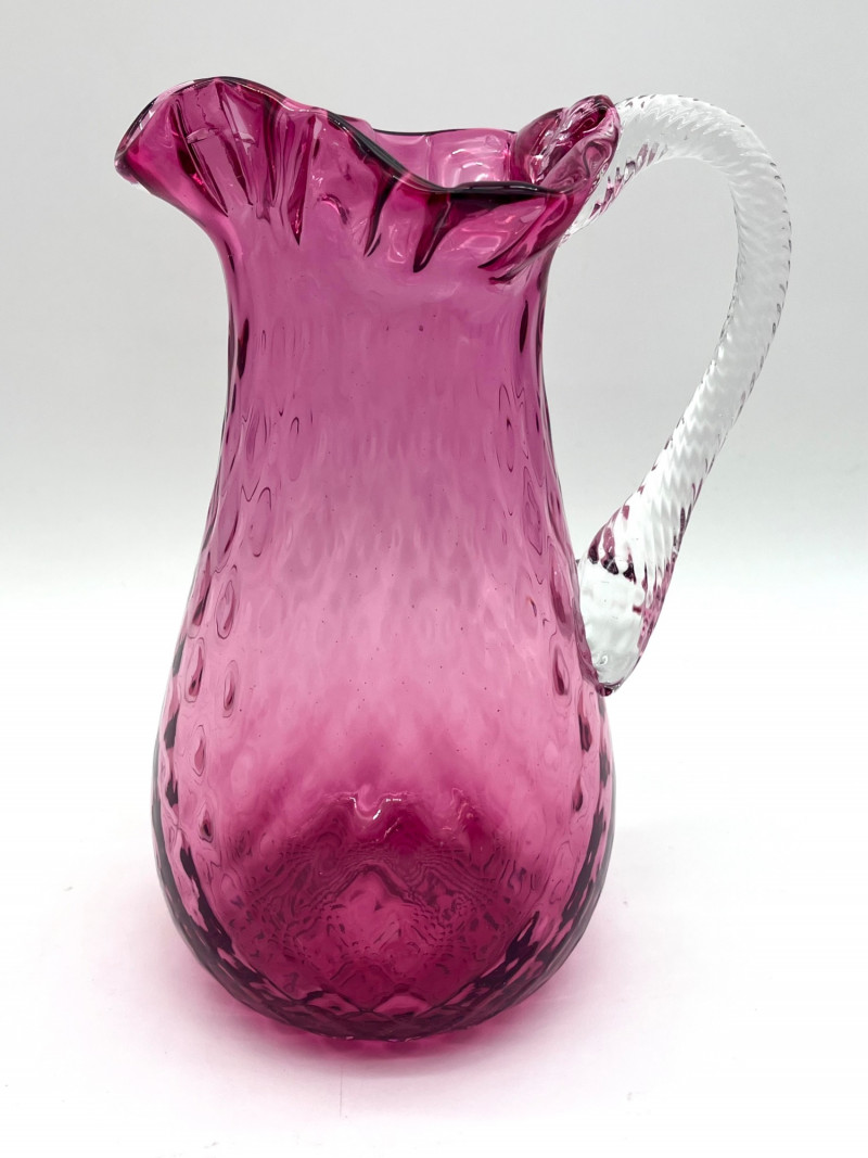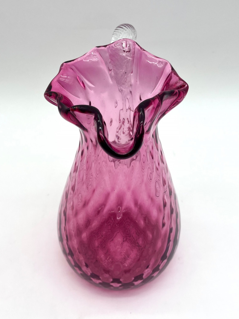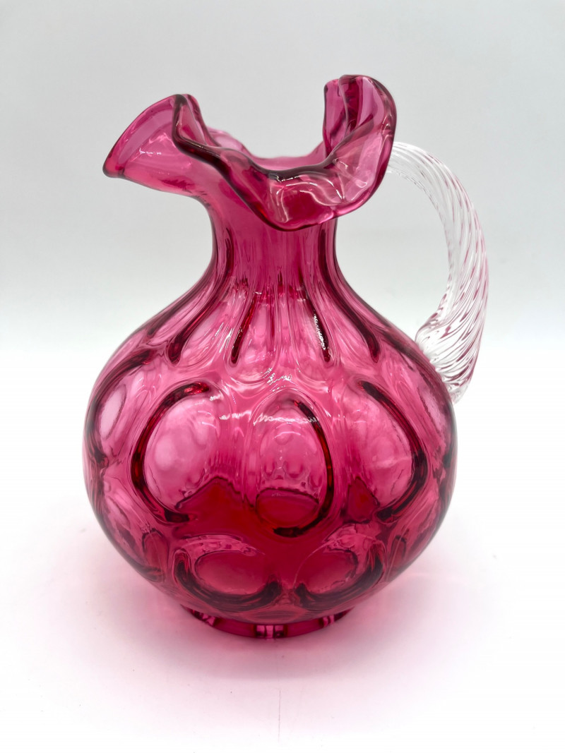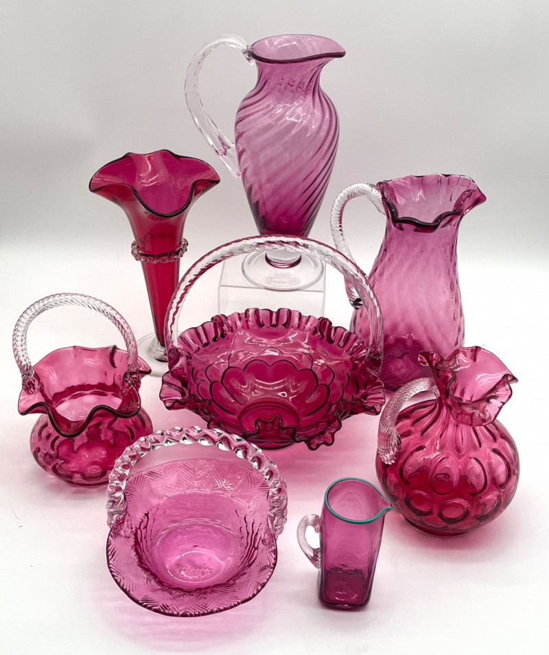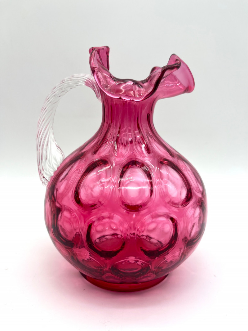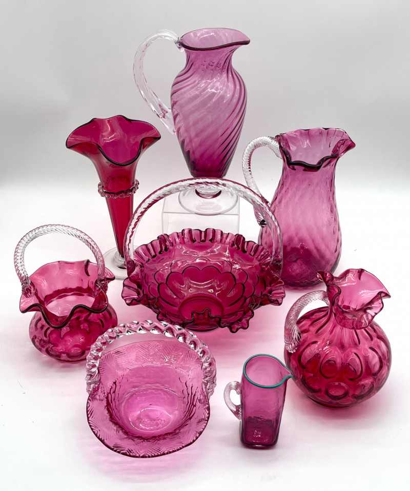 Cranberry Glass Lot Featuring Multiple Fenton Pieces The tallest piece, the footed pitcher, is 10 3/4" talland the smallest piece is 4 1/4" tall. All pieces are in good condition with no cracks or chips.