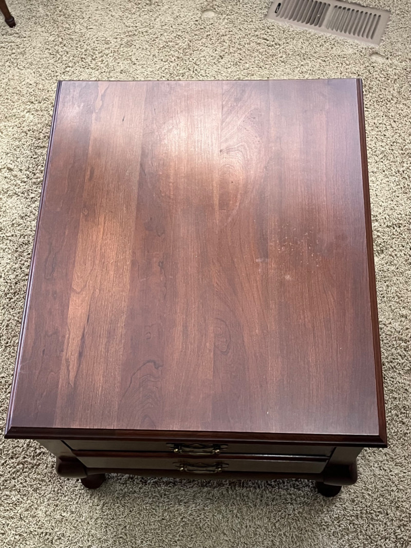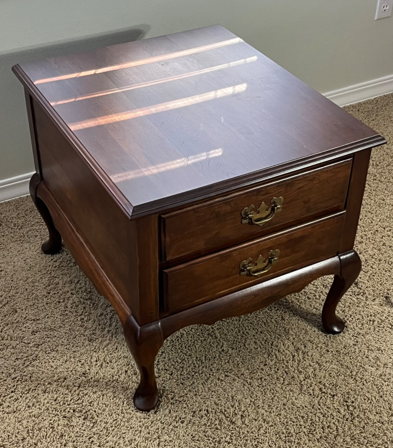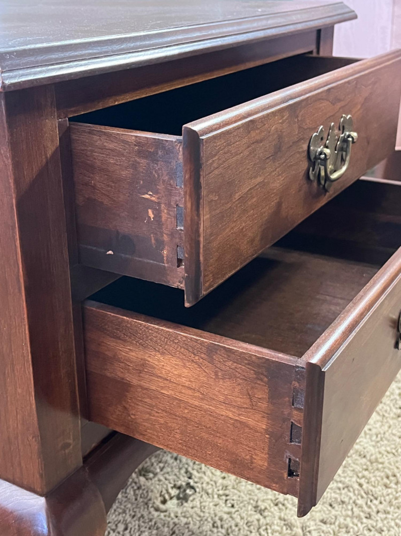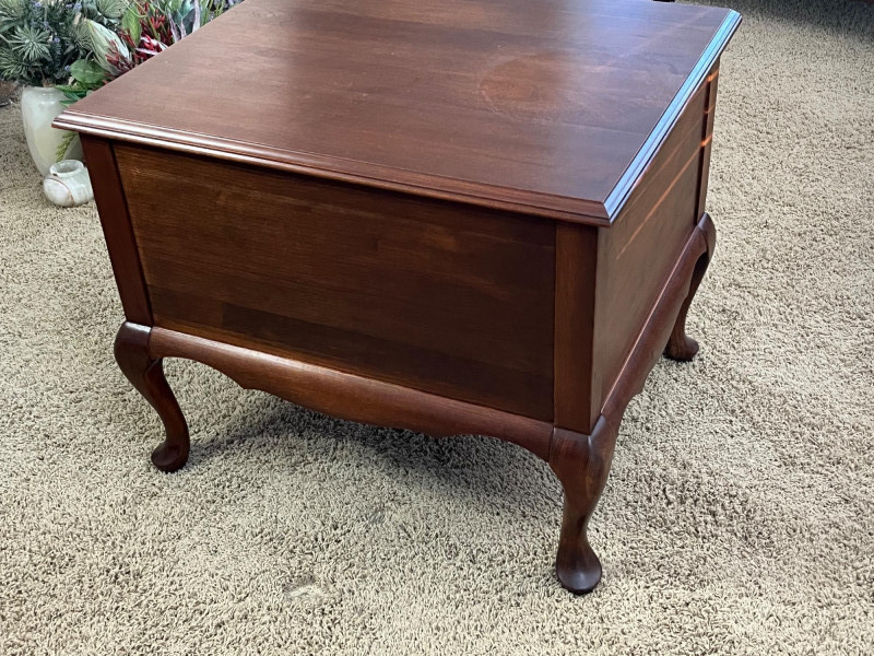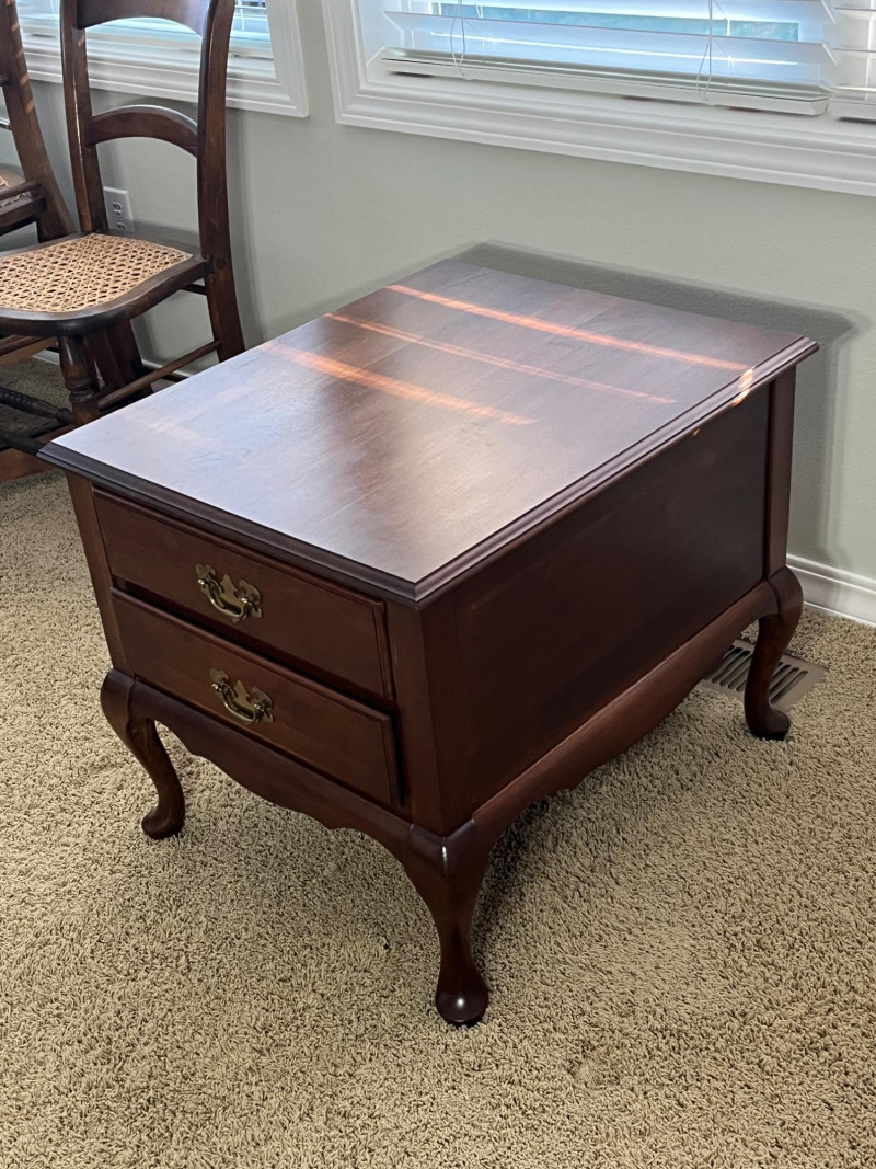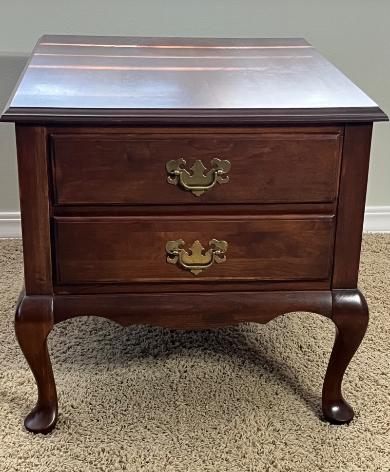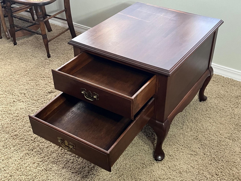 Solid Wood Queen Anne Styled End Table with Two Drawers This table is in very good vintage condition with just a few little flaws on the top that can be minimized in appearance by a good quality wax. Measurements: 21" tall, 21" wide, and 25" deep (front to back).