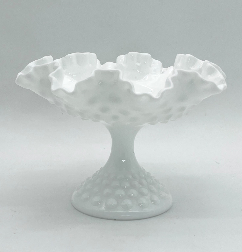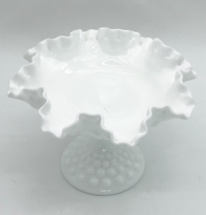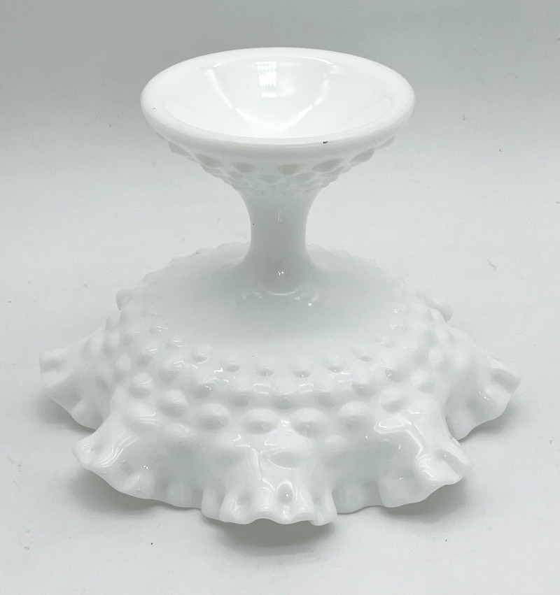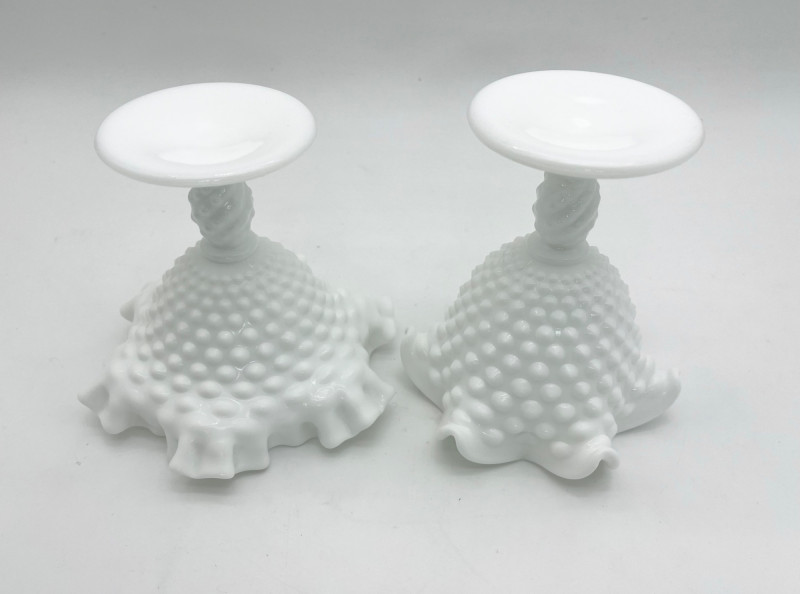 Fenton Hobnail Milk Glass Lot The tallest of these pieces is the lidded candy dish which is about 7" tall, followed by the 6" tall candlestick holders. All pieces are in good vintage condition with minimal wear.