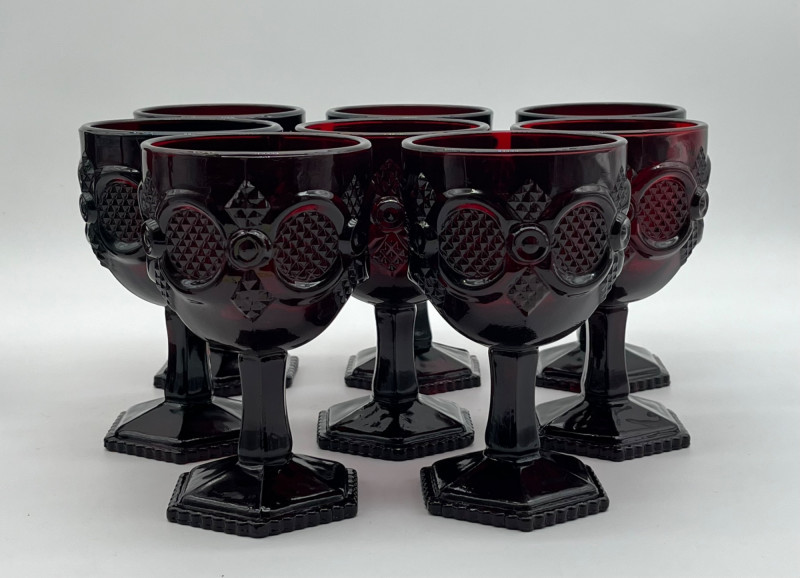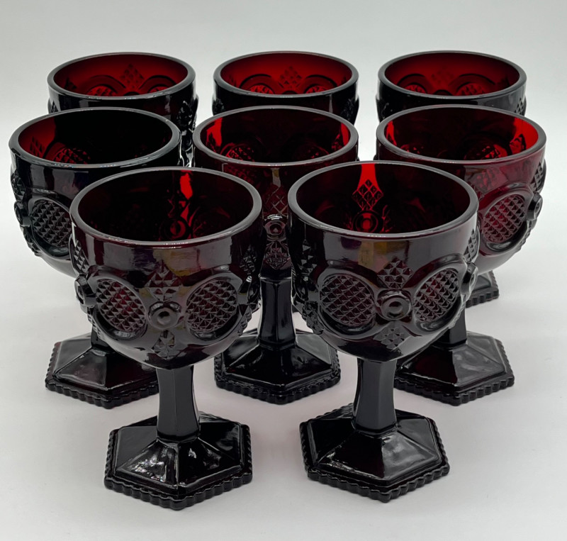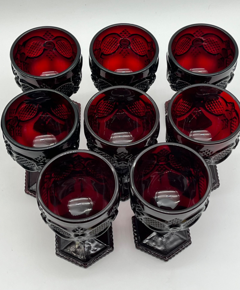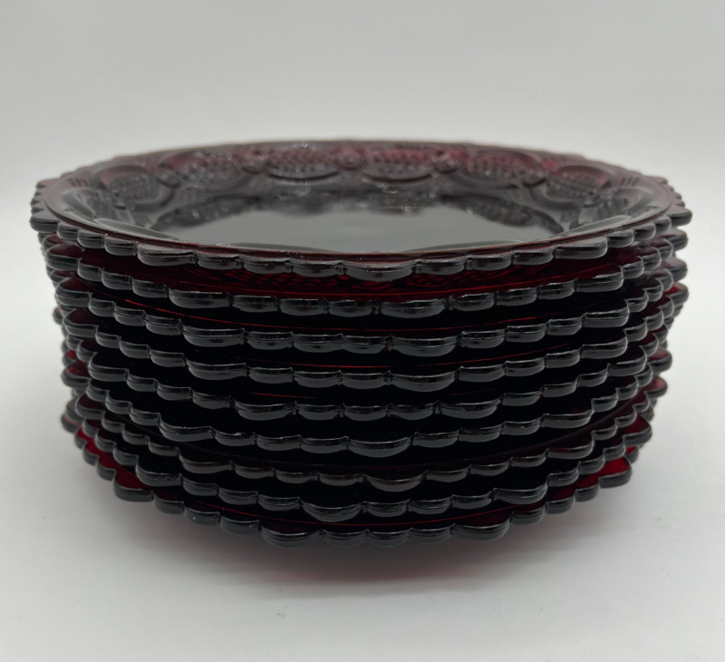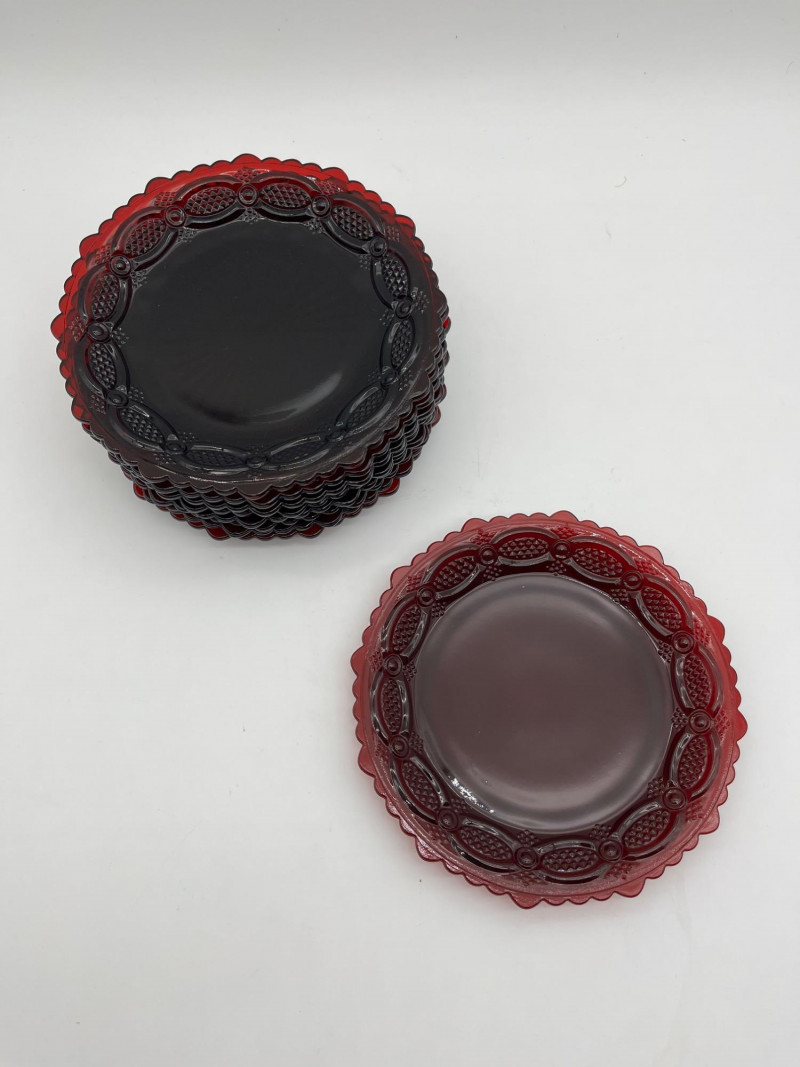 Cape Code Red Glass Plates, Wine Glasses and Bell by Avon This lot includes: