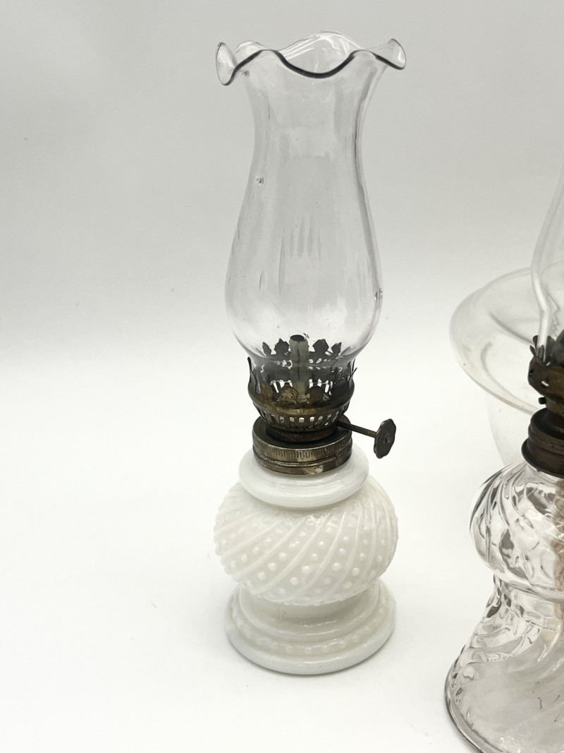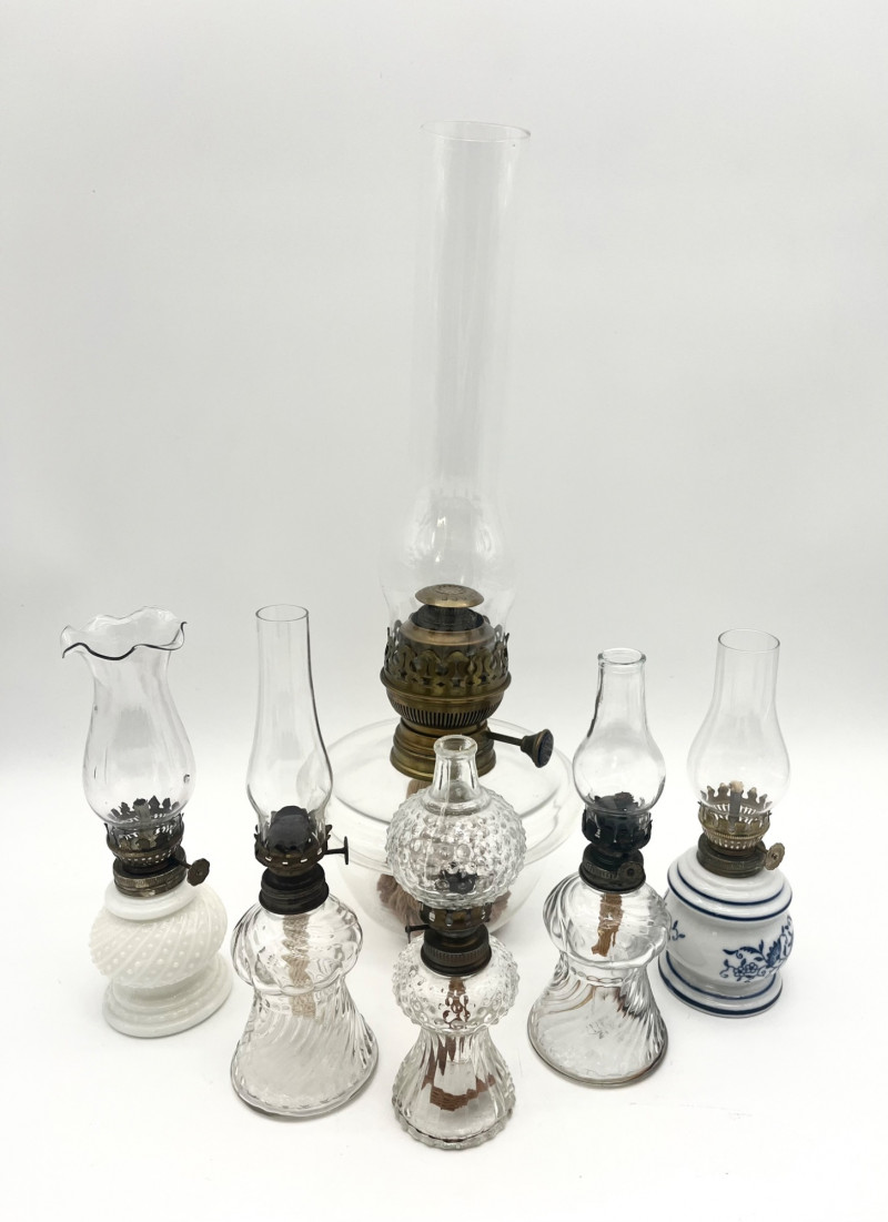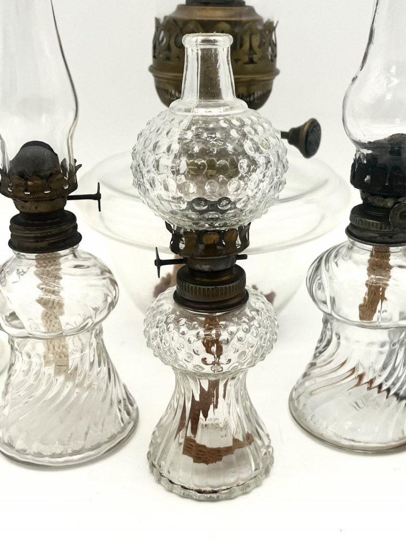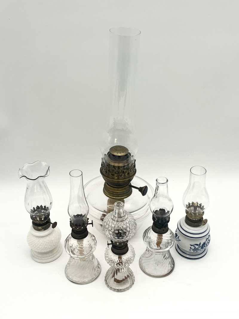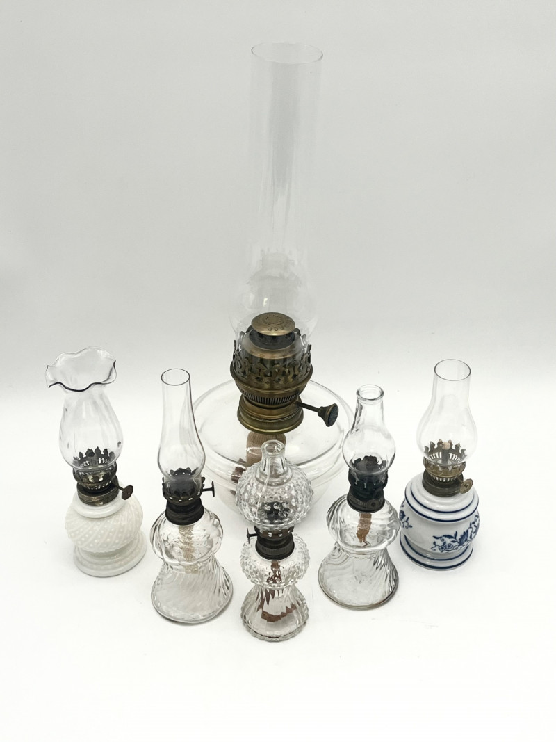 Five Miniature and One Standard Size Kerosene Lamps The tiniest of these is only 8" tall while the standard sized one is 16" tall. The large lamp is an Ideal Brenner and meant to fit into a hanging bracket. The miniatures are all between 8" and 10" tall and include wicks.