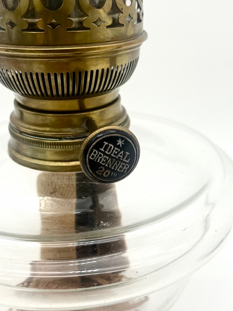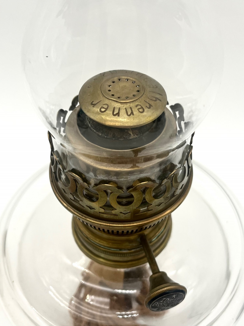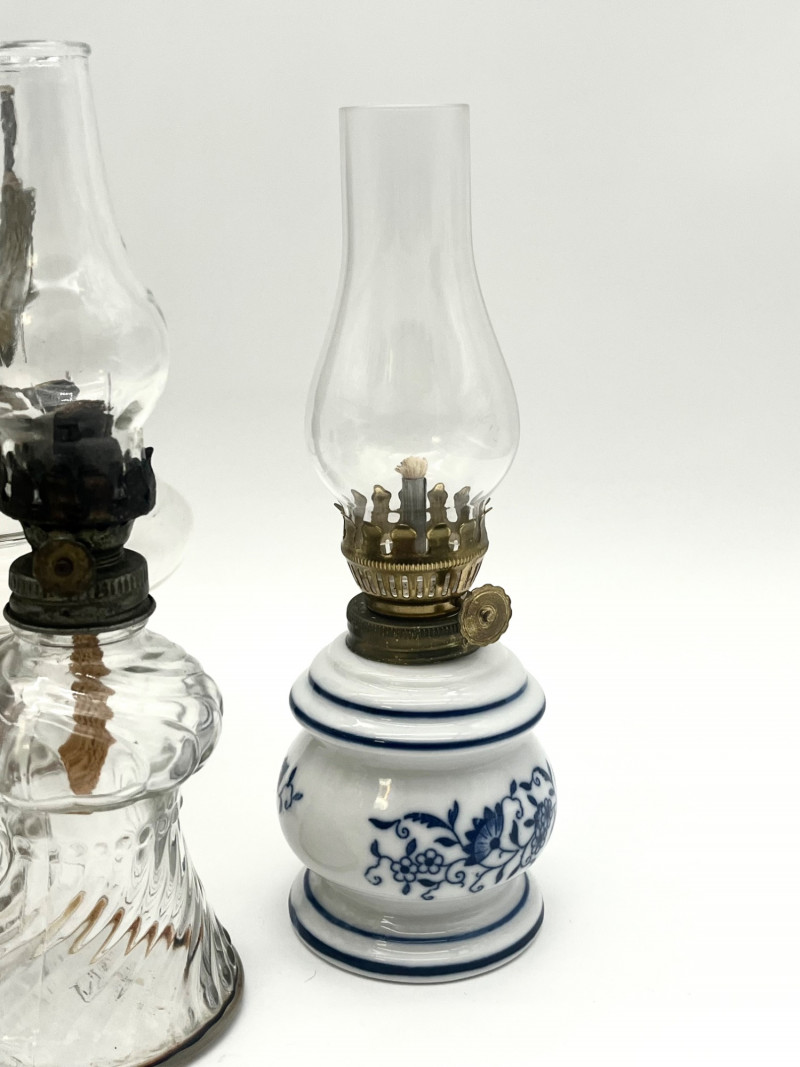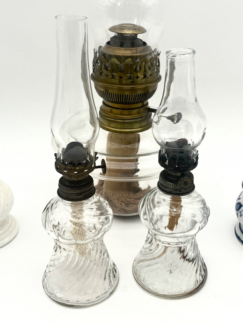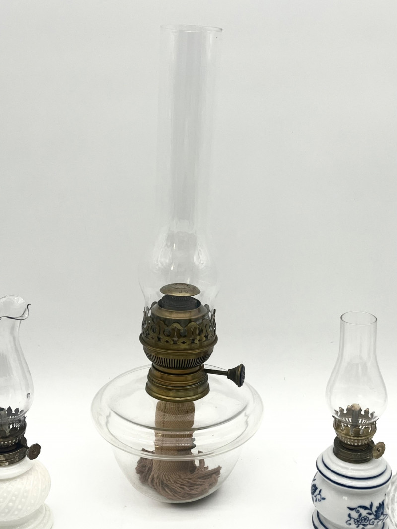 Five Miniature and One Standard Size Kerosene Lamps The tiniest of these is only 8" tall while the standard sized one is 16" tall. The large lamp is an Ideal Brenner and meant to fit into a hanging bracket. The miniatures are all between 8" and 10" tall and include wicks.