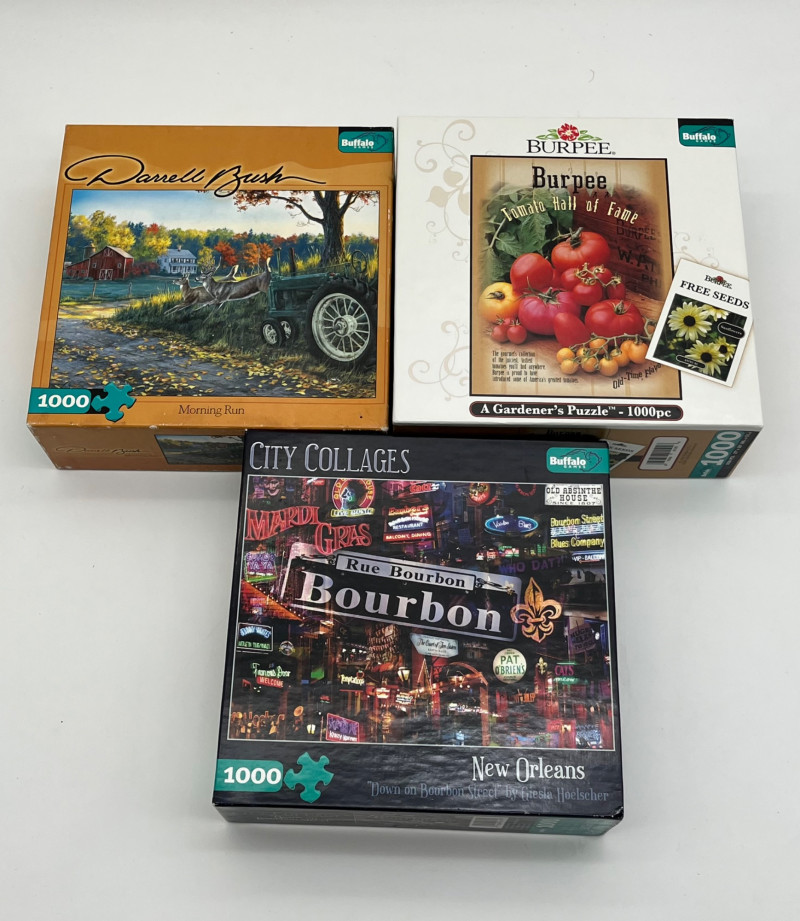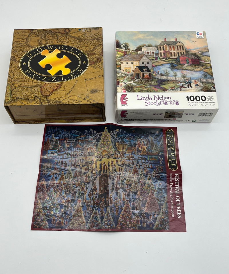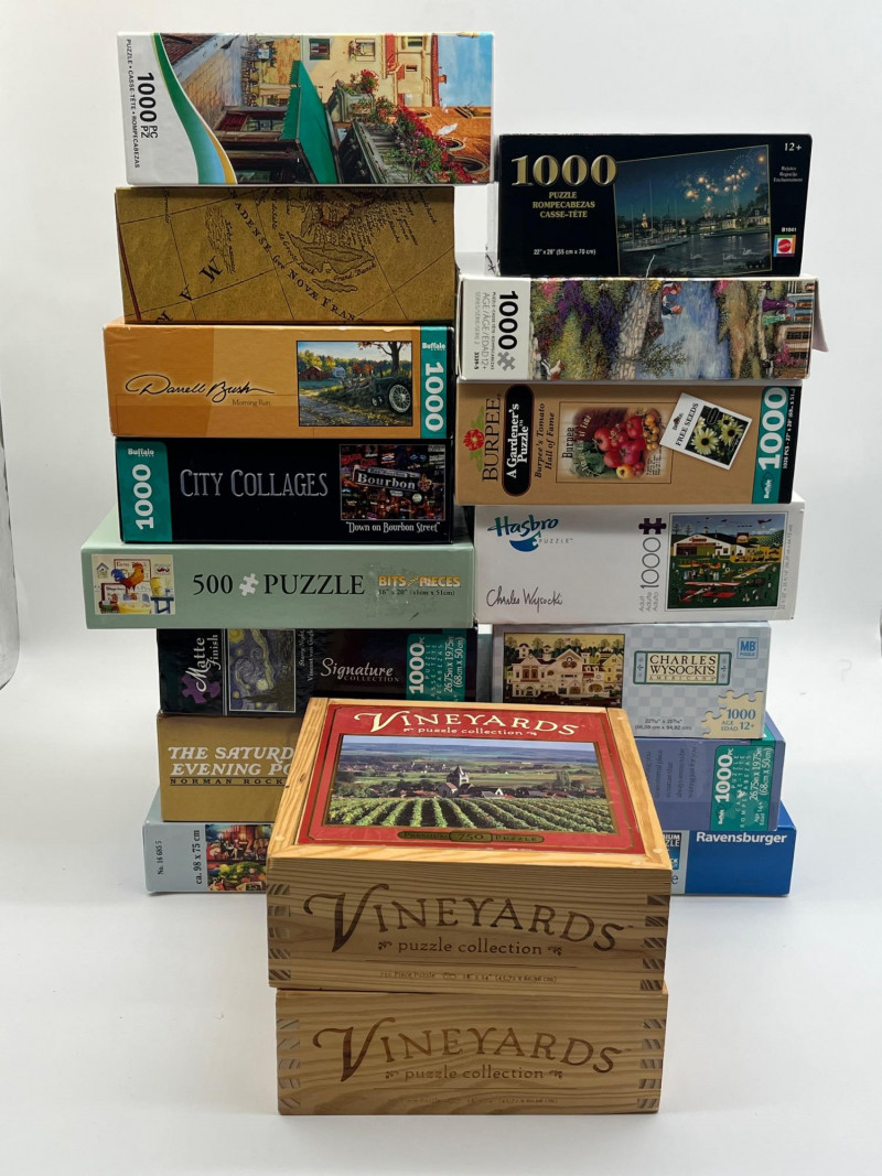 Lot of Sixteen 500-2000 Piece Puzzles This is the ultimate collection for the puzzle lover in your life! All puzzles look to have never been opened or have been carefully recollected after having been assembled.