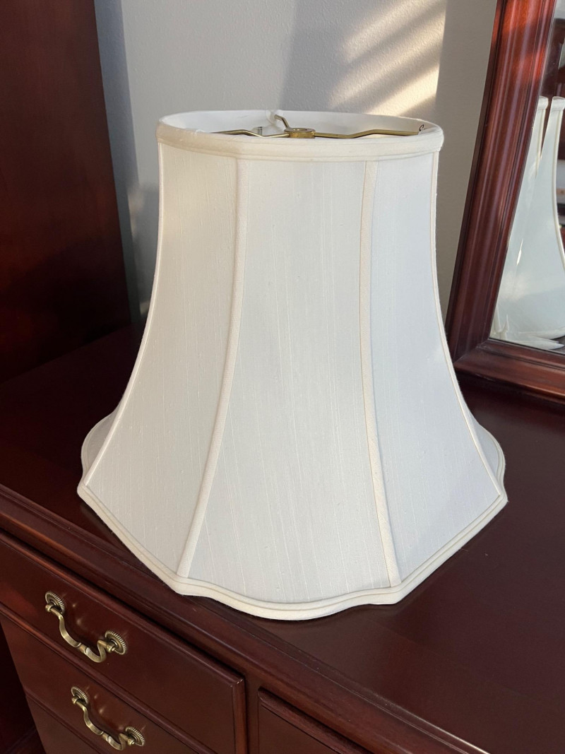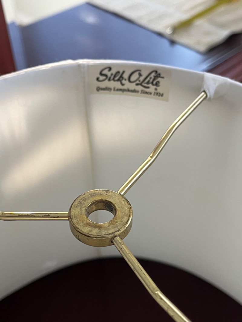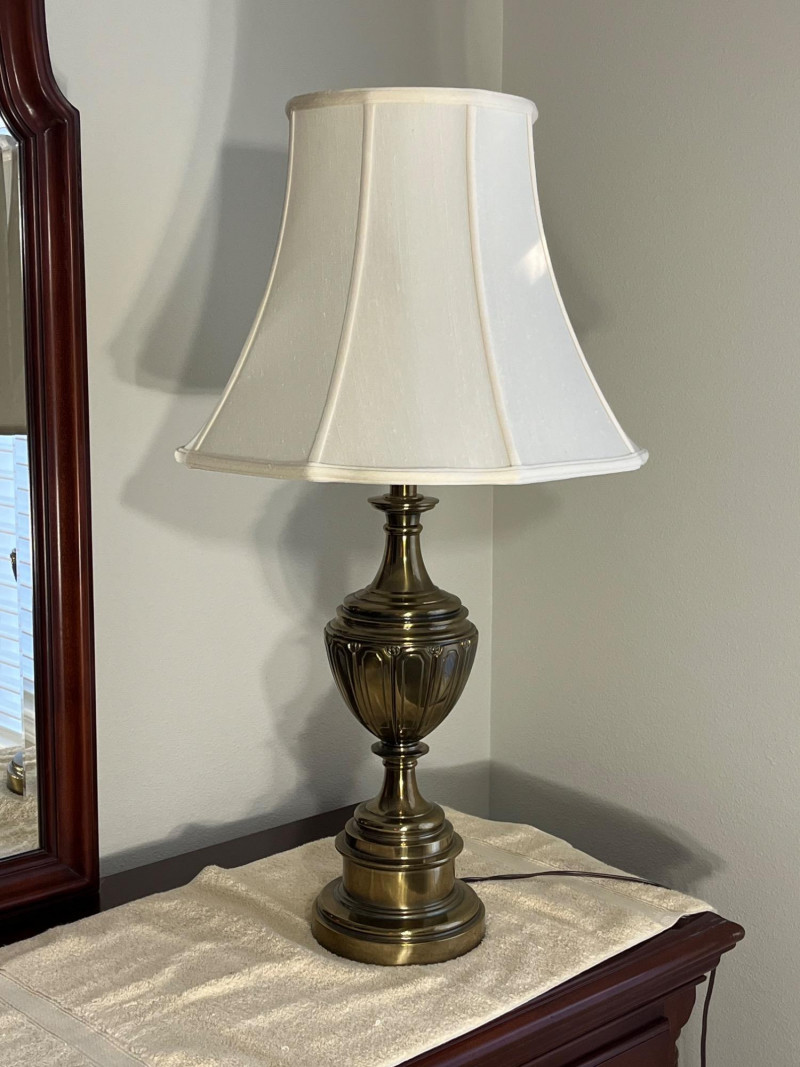 Large Stiffel Brass Hollywood Regency Styled Lamp Stands 30 1/2" tall to the top of the finial. This lamp is in very good condition with no dents or major scratches. The shade is not the original but a high quality silk, also in good condition.