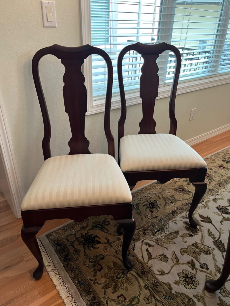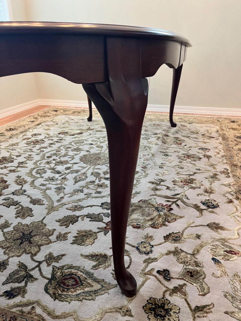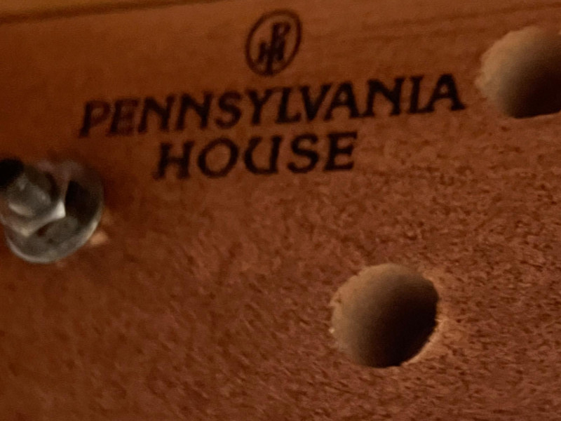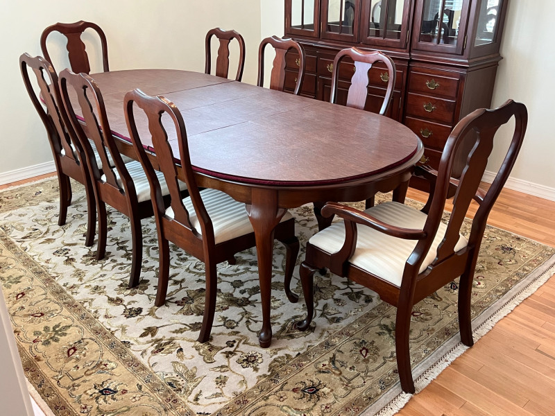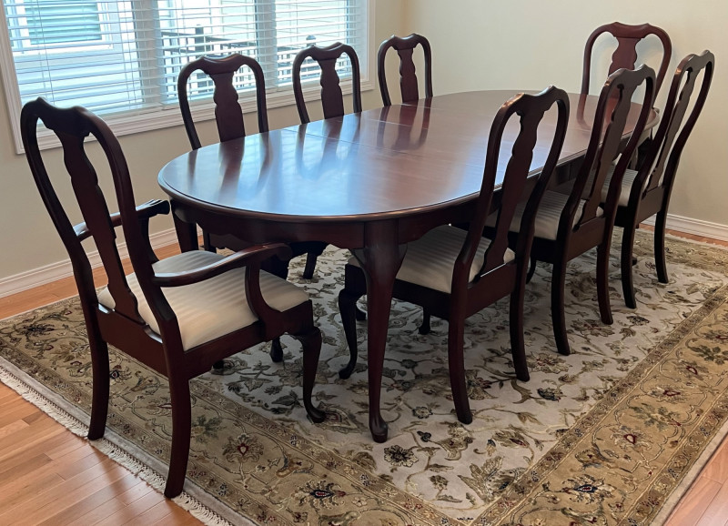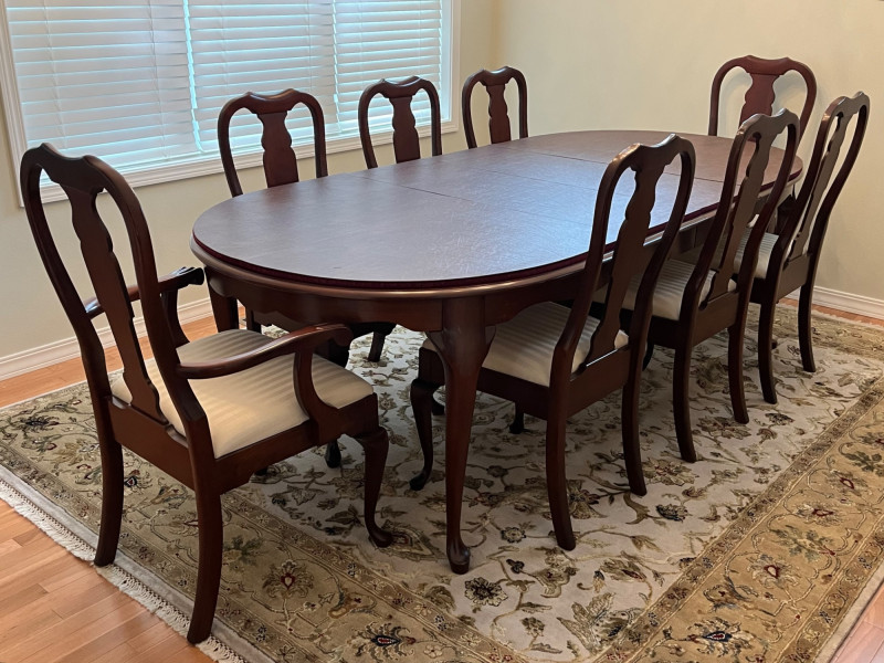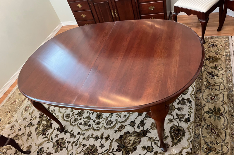 Pennsylvania House Solid Wood Table and 8 Matching Chairs Table is shown with and without its two, 15" leaves. Max length: 96" (8 feet) Min length: 66" (5 1/2 feet) Width: 42" The table pad is multiple pieces that are velvet on the bottom and faux leather on the top and customer to this specific table so it fits perfectly. The chairs are not from the same manufacturer but an excellent match in color, shape, and size. All of the chairs match each other and there are 6 regular and 2 arm chairs. The manufacturer of the chairs is unknown but the construction is of the same quality and the wood of the similar weight.