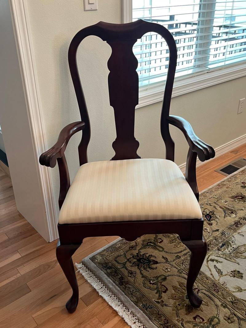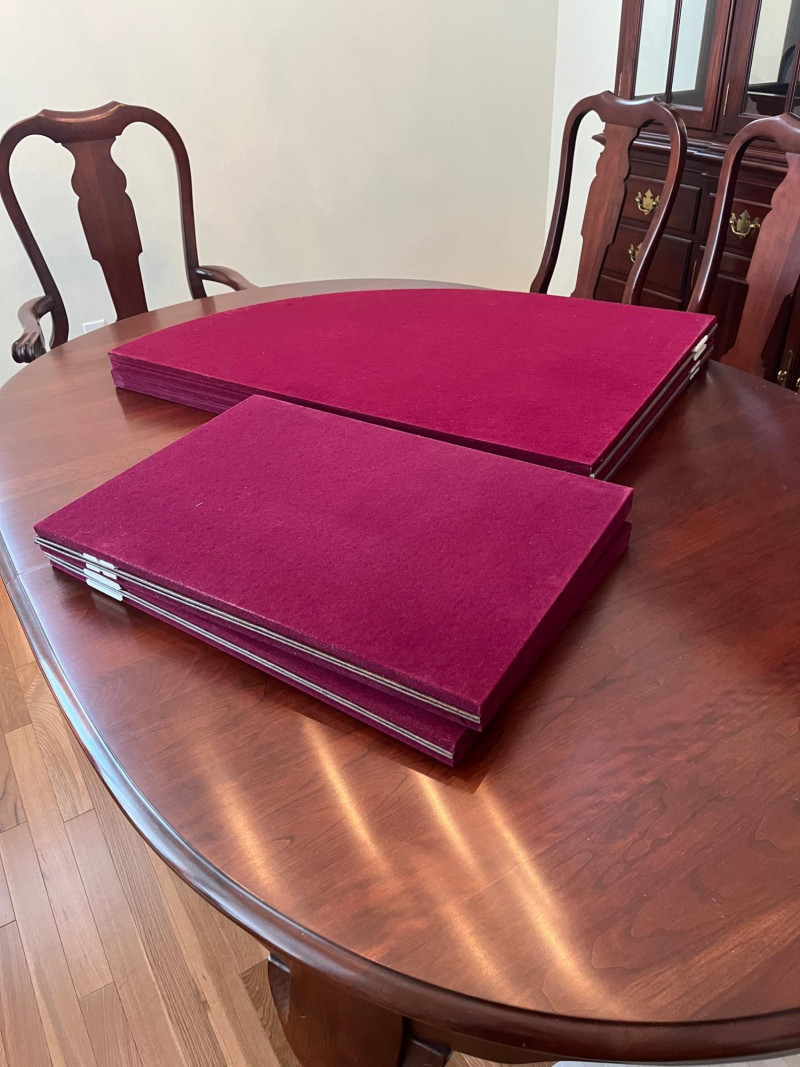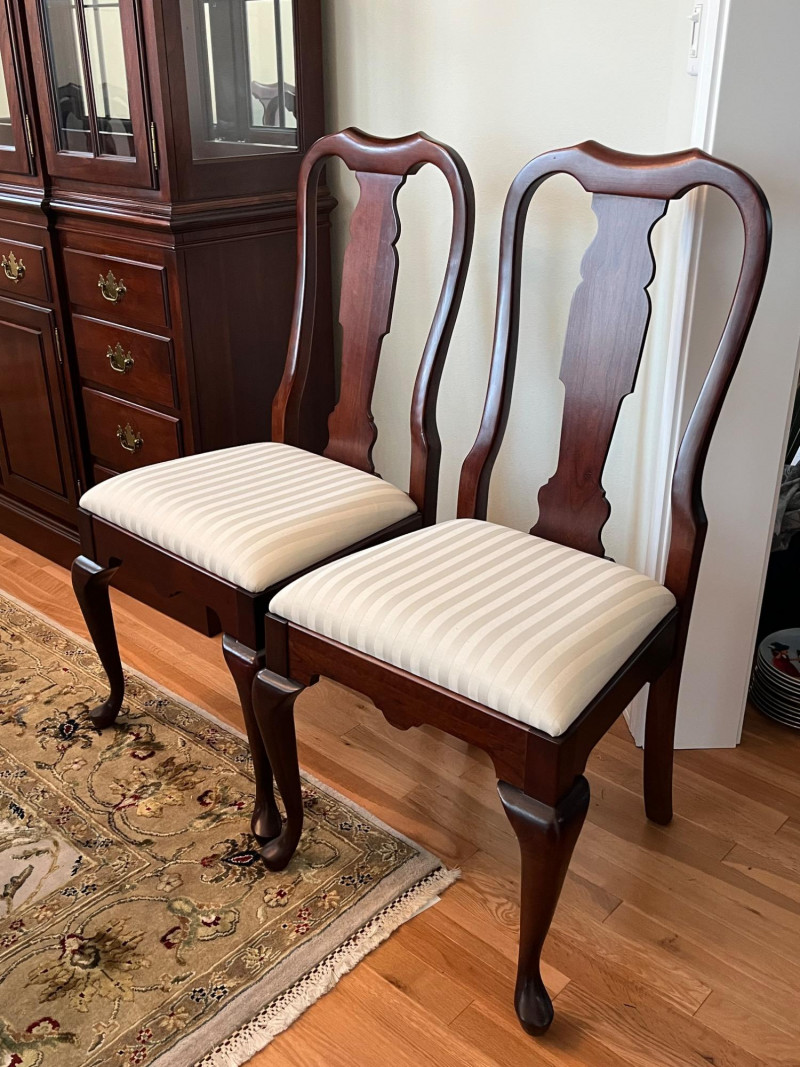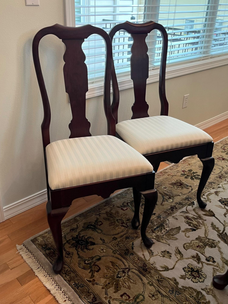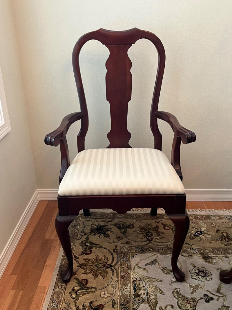 Pennsylvania House Solid Wood Table and 8 Matching Chairs Table is shown with and without its two, 15" leaves. Max length: 96" (8 feet) Min length: 66" (5 1/2 feet) Width: 42" The table pad is multiple pieces that are velvet on the bottom and faux leather on the top and customer to this specific table so it fits perfectly. The chairs are not from the same manufacturer but an excellent match in color, shape, and size. All of the chairs match each other and there are 6 regular and 2 arm chairs. The manufacturer of the chairs is unknown but the construction is of the same quality and the wood of the similar weight.