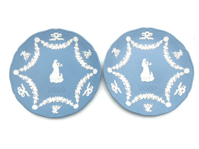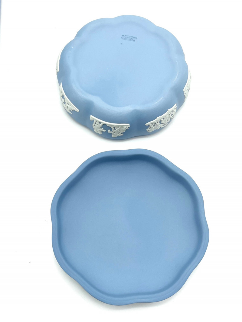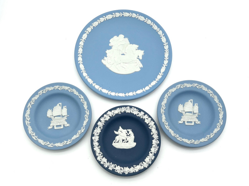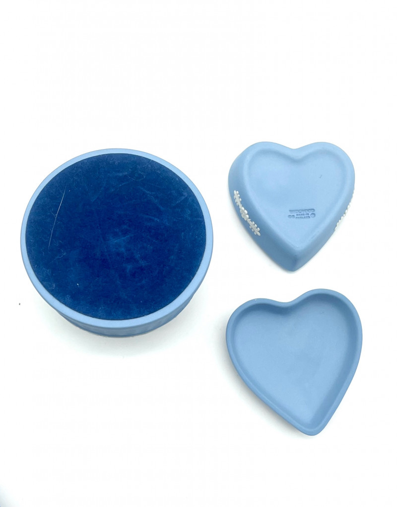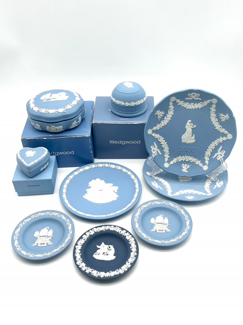 Variety of Small Wedgwood Jasperware Pieces This is a variety of commemorative and vanity pieces and all are in good condition with no cracks or chips. The two larger plates are 6 3/4" wide while the three smaller plates are 4 1/4" wide. The lot also includes a paperweight, a heart shaped dish with lid and round dish with lid.