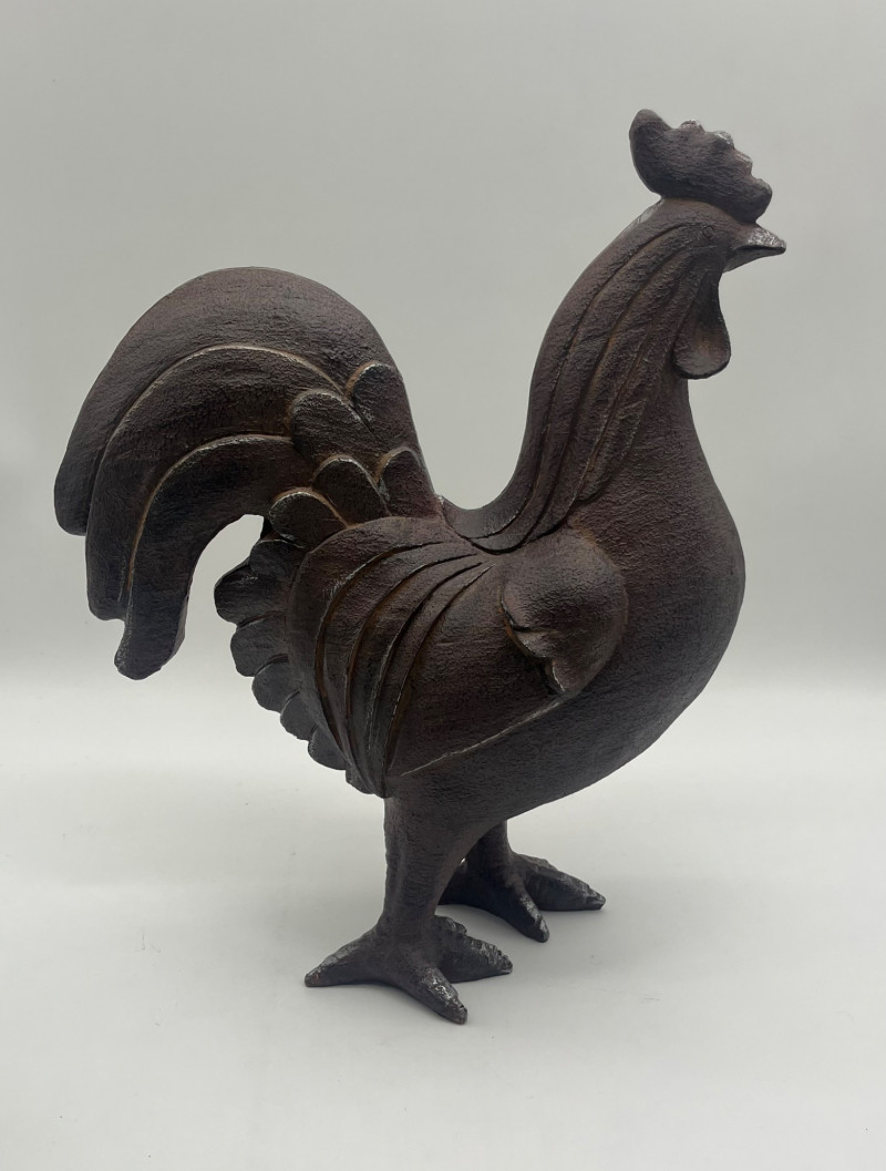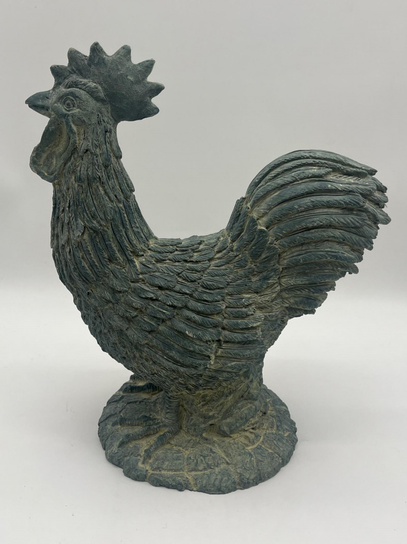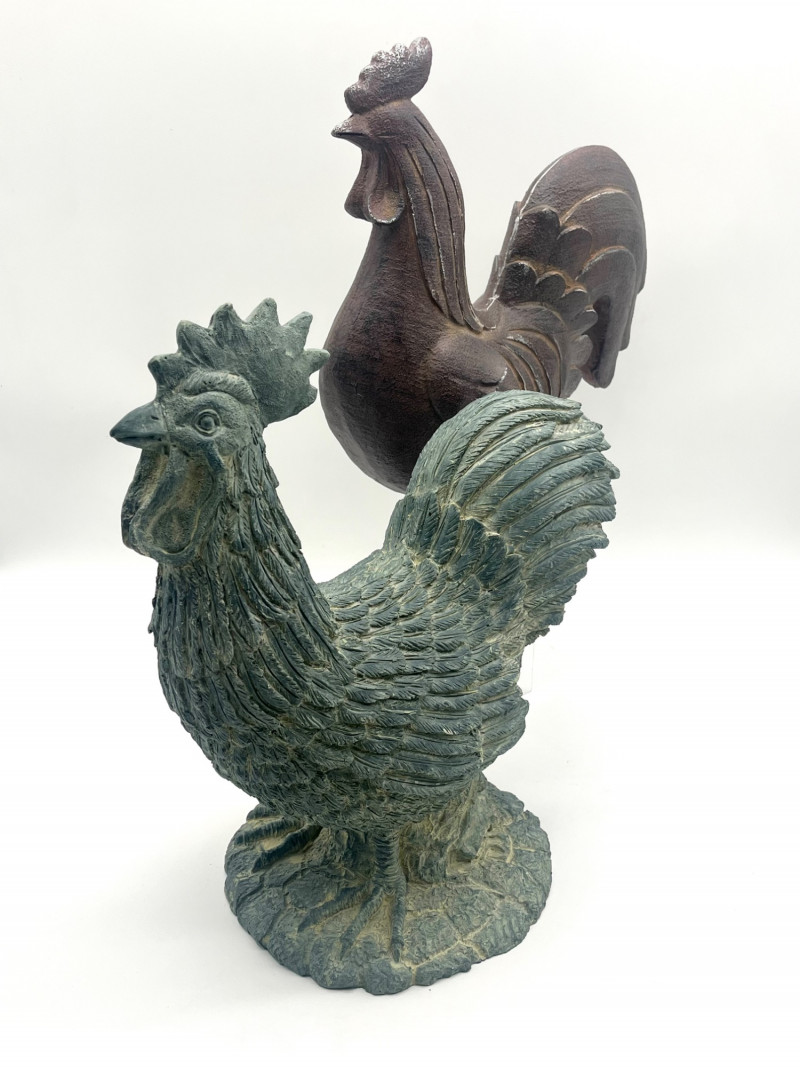 Two Rustic Styled Roosters These are 12" and 14" tall and made of lightweight resin. They are both in like-new condition with little to no signs of wear.