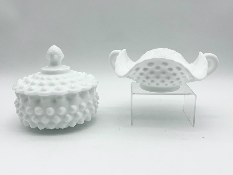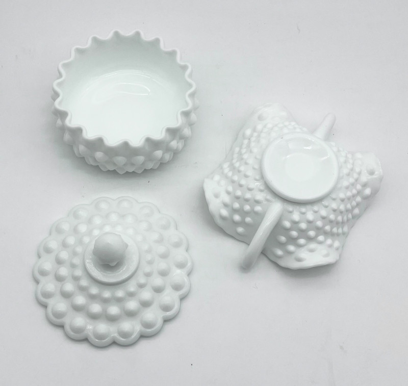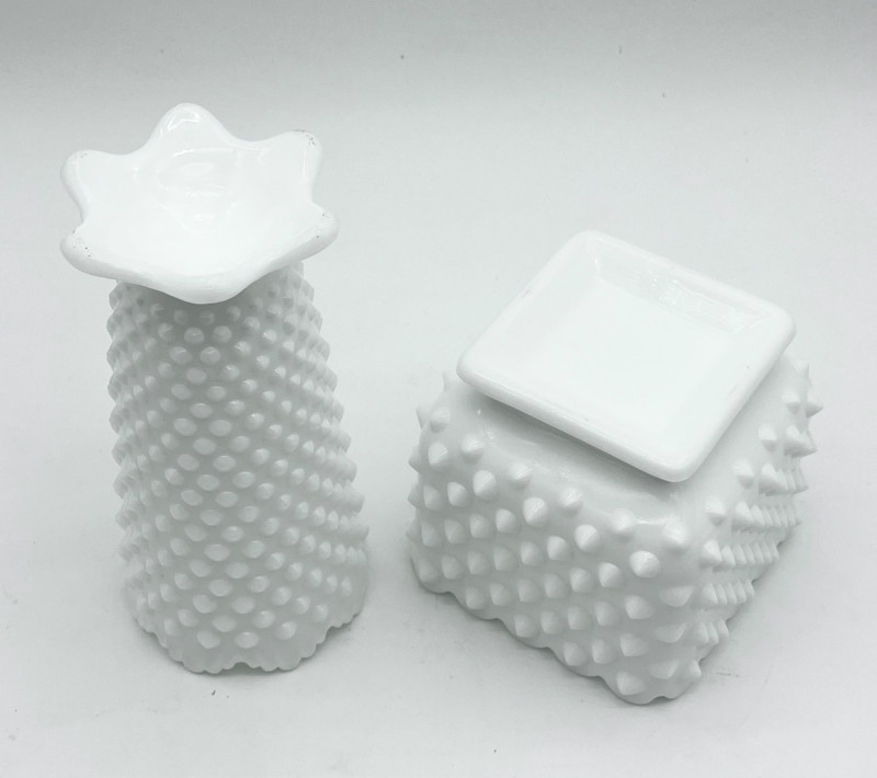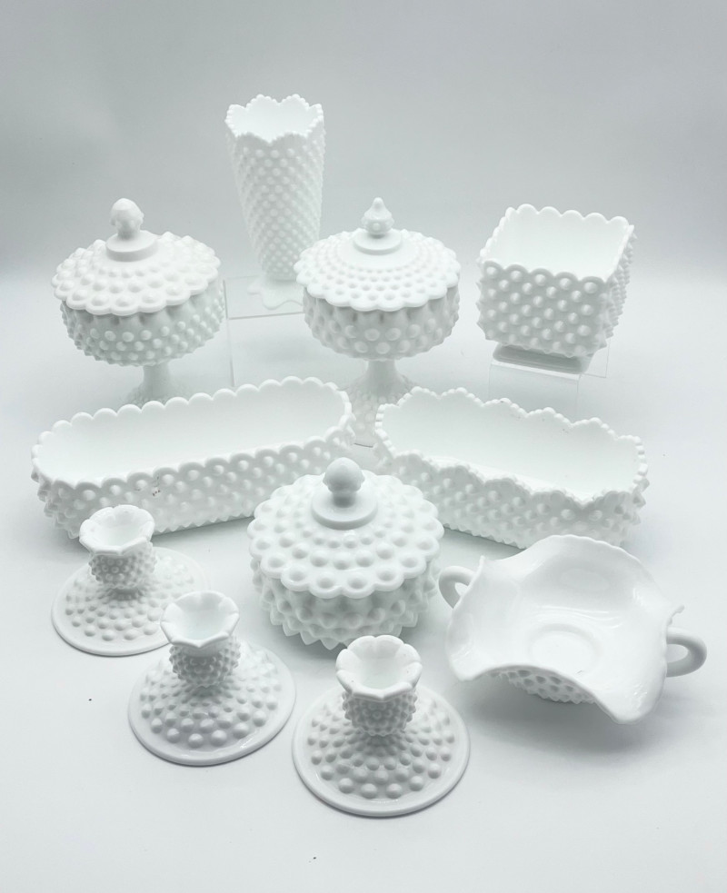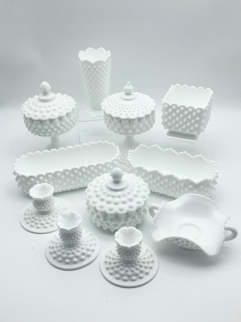 11 Piece Hobnail Milk Glass Lot This lot includes all pieces shown and is a mix of manufacturers. Most pieces are in very good condition but a few have some minor flaws, mainly chipped hobnails but no major cracks or breaks. See photos for details.