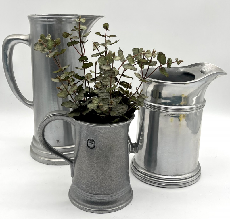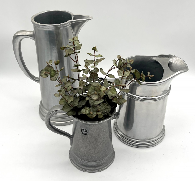 Set of 3 Pewter Pitchers These are all from different manufacturers. They are all in good condition and the tallest pitcher is 12" tall while the shortest is 6 1/4" tall.
