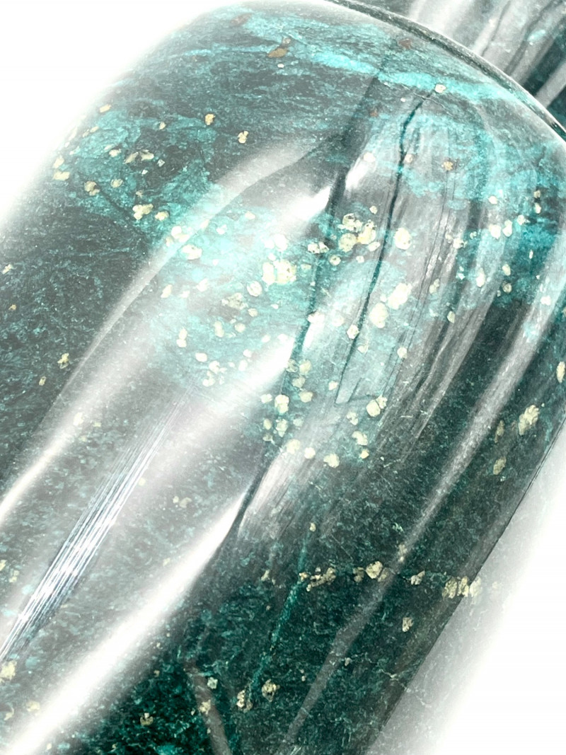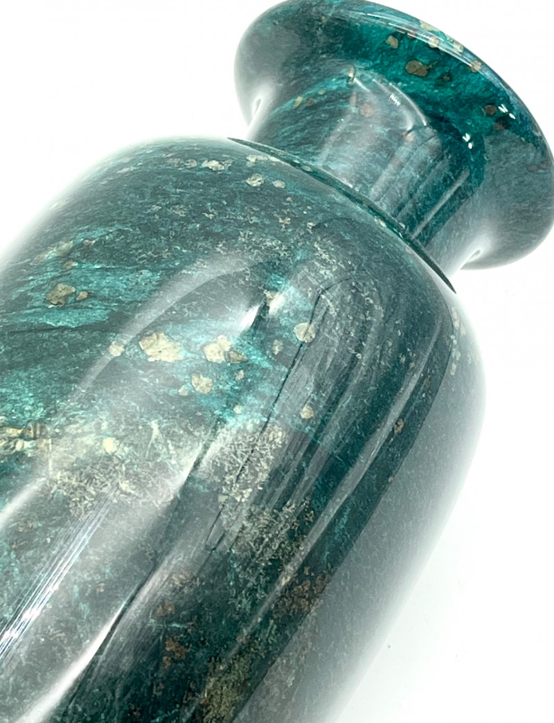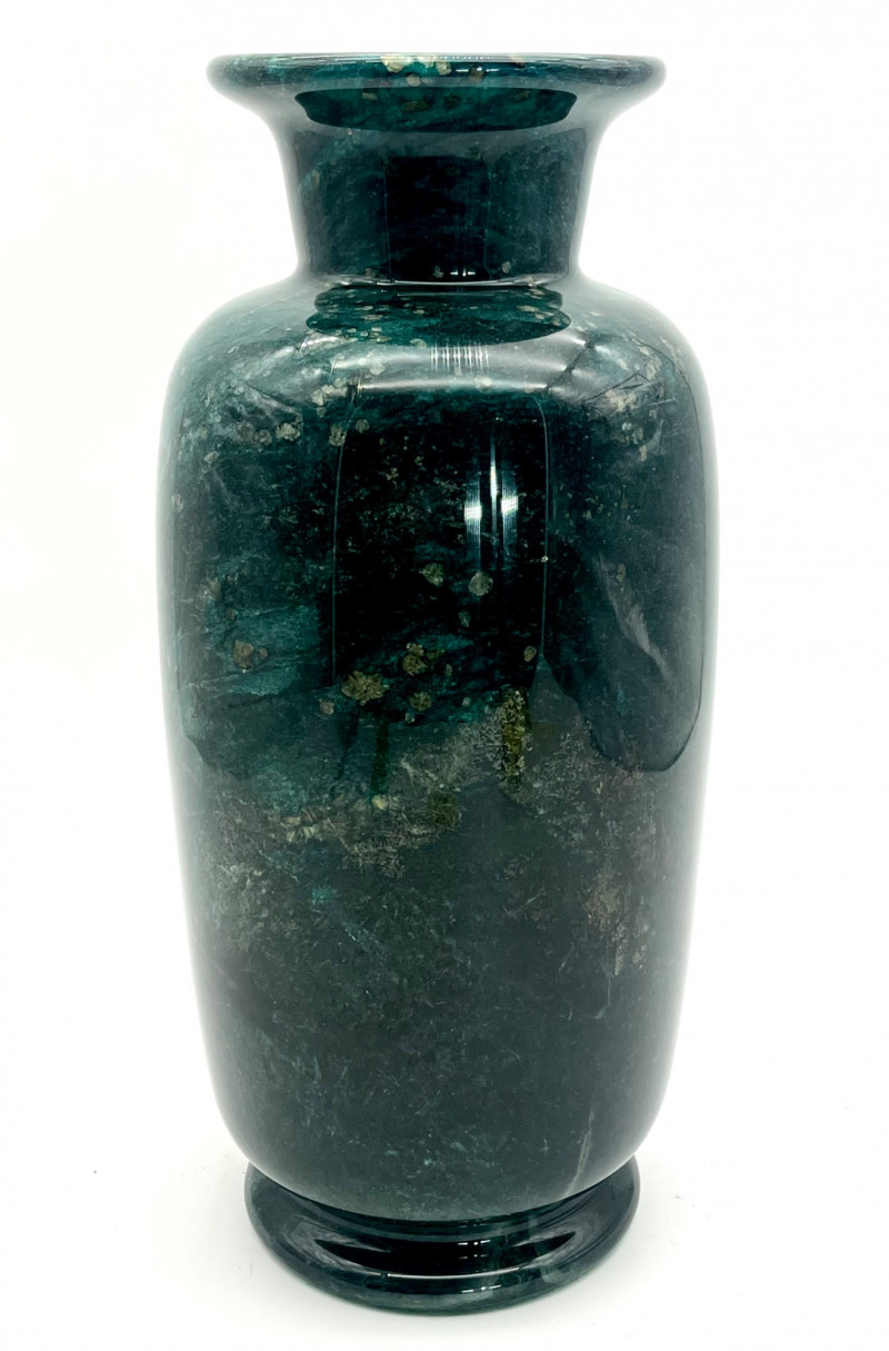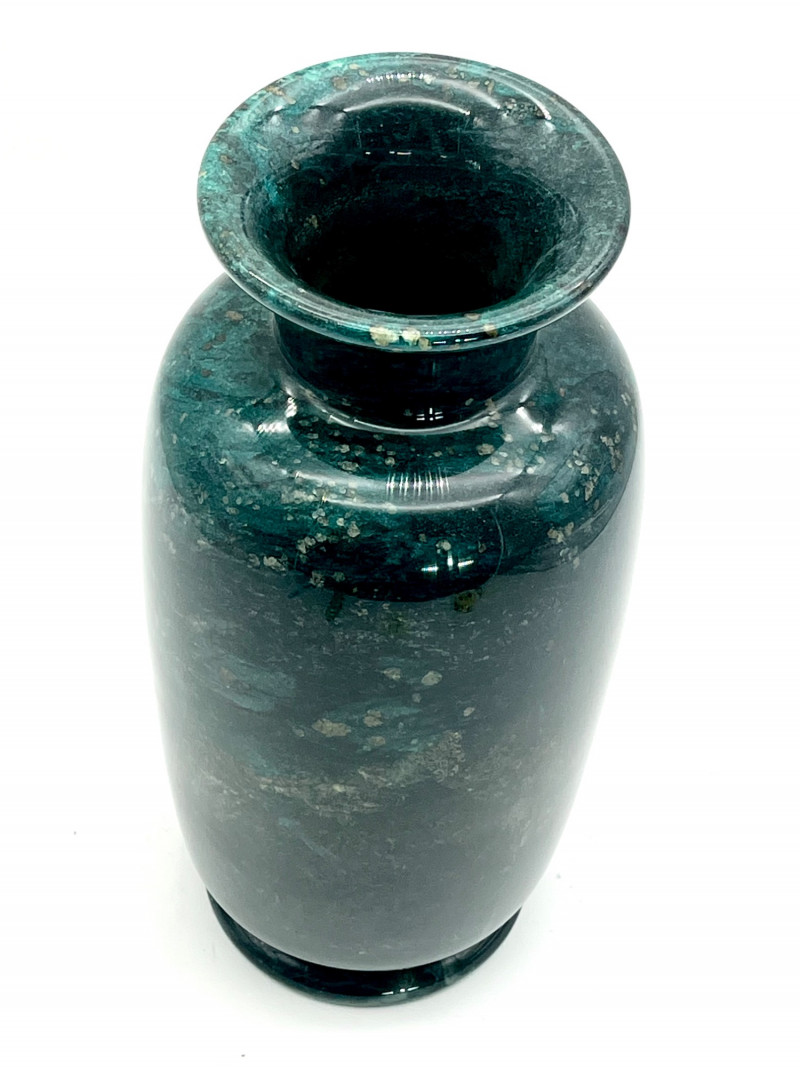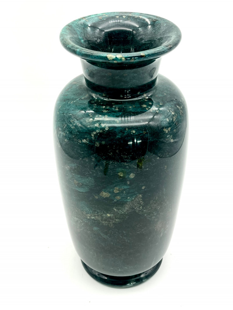 Marble Vase for Dried Flower Arrangements READ DESCRIPTION This is in very nice condition and measures 13 1/2" tall. After I got to taking photos of it, I noticed that there is a hole in the bottom so please note that this does not hold water for fresh flowers. The surface is very shiny which actually made it more difficult to photograph as it reflected so much light that it was hard to capture the true color. This is a dark green, darker than malachite, with gold flecks. I believe this is a synthetic marble but beautiful all the same.