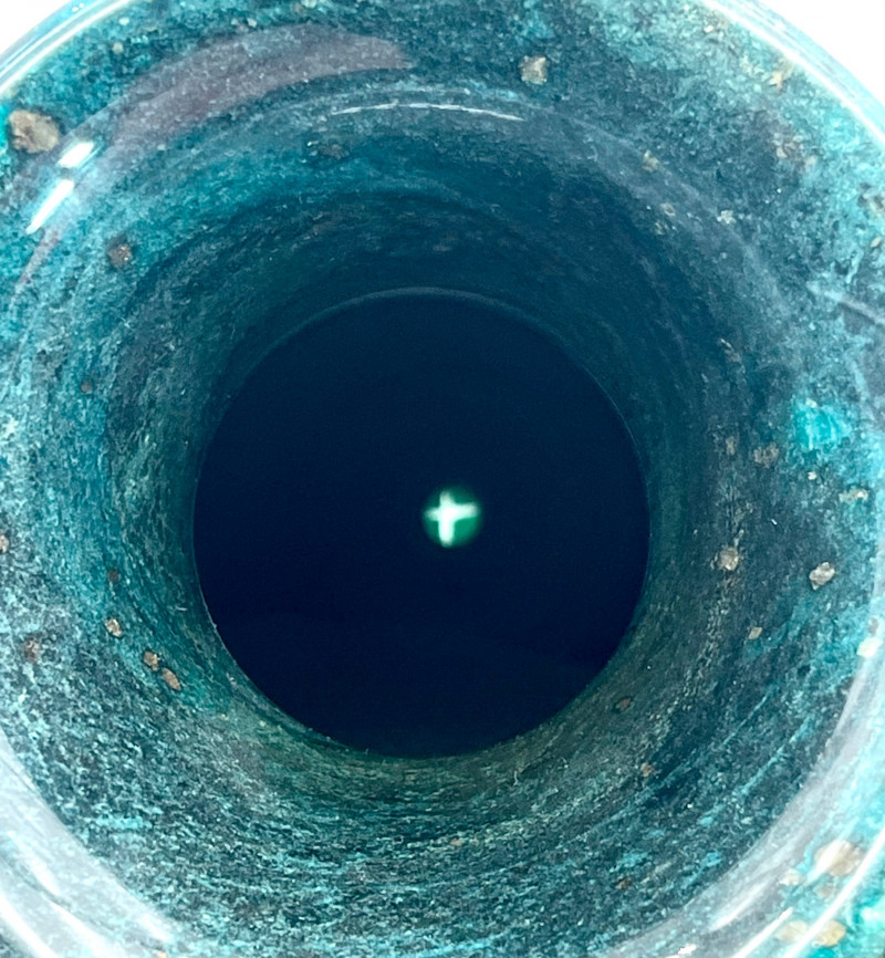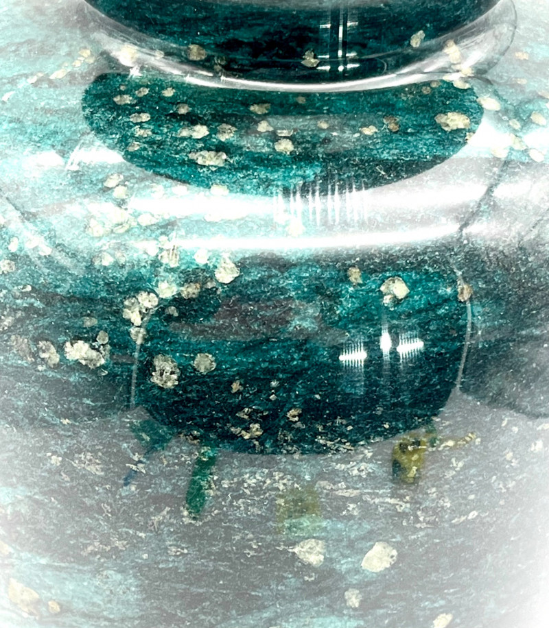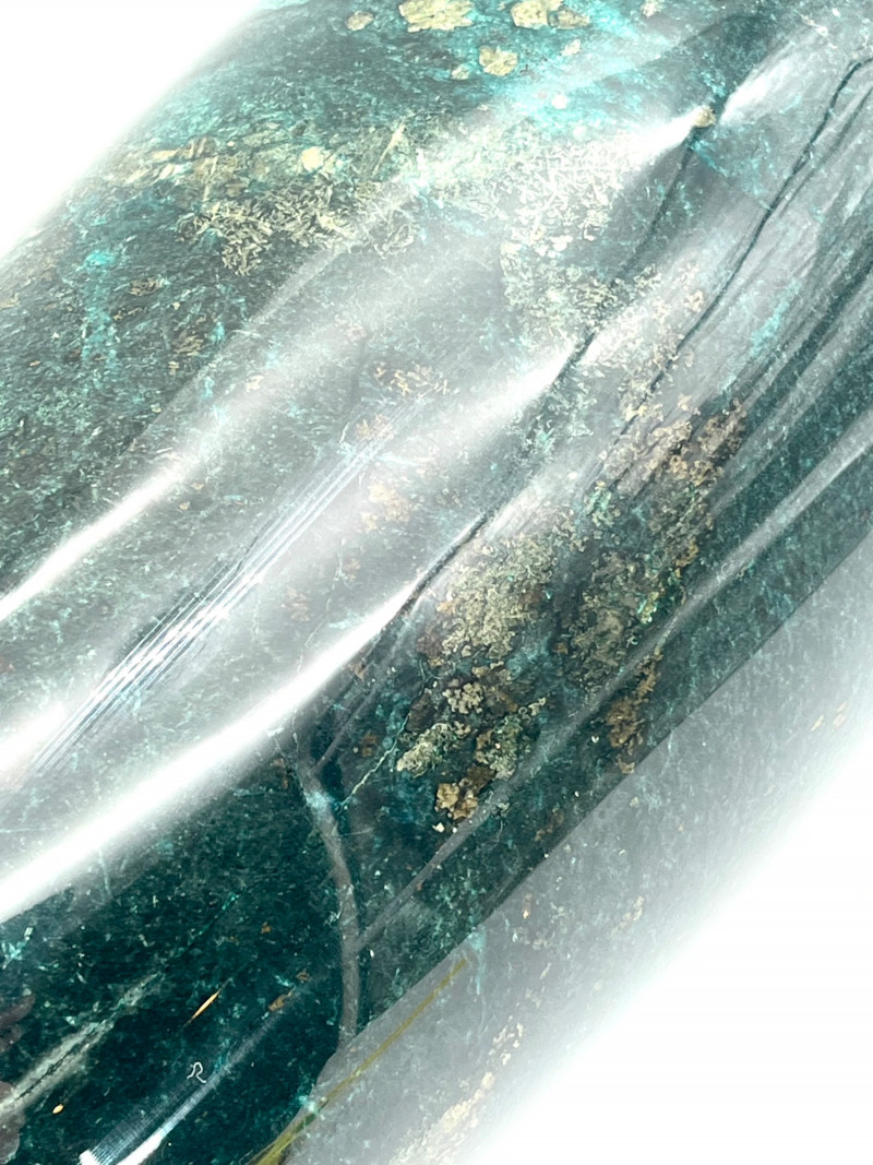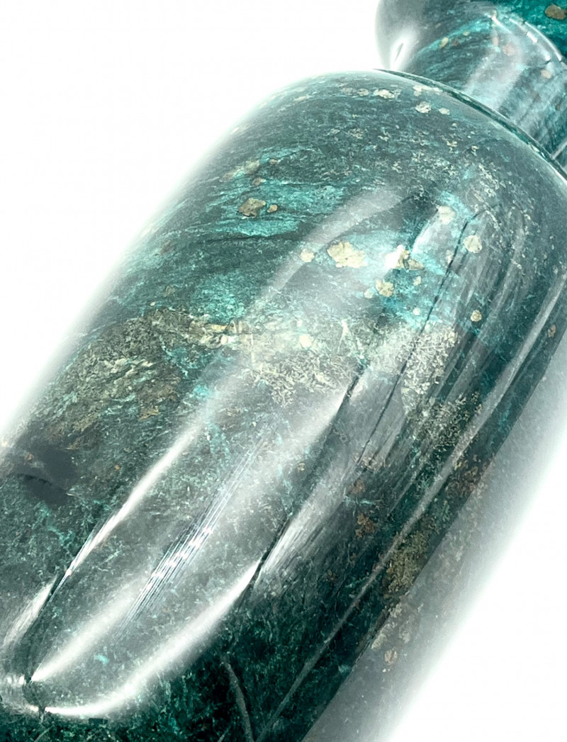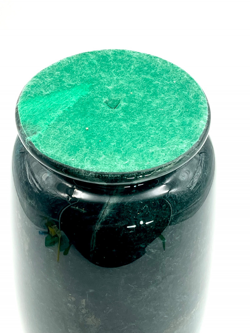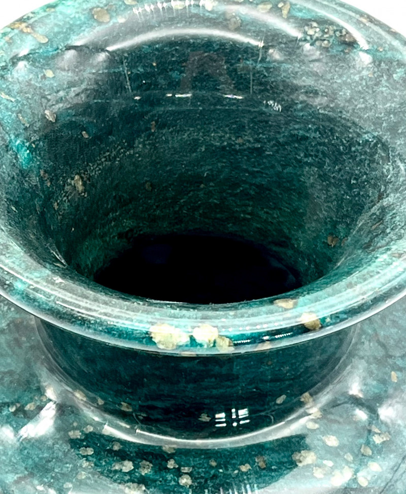 Marble Vase for Dried Flower Arrangements READ DESCRIPTION This is in very nice condition and measures 13 1/2" tall. After I got to taking photos of it, I noticed that there is a hole in the bottom so please note that this does not hold water for fresh flowers. The surface is very shiny which actually made it more difficult to photograph as it reflected so much light that it was hard to capture the true color. This is a dark green, darker than malachite, with gold flecks. I believe this is a synthetic marble but beautiful all the same.