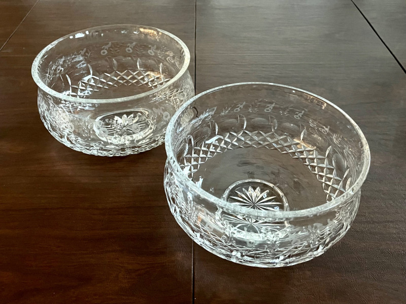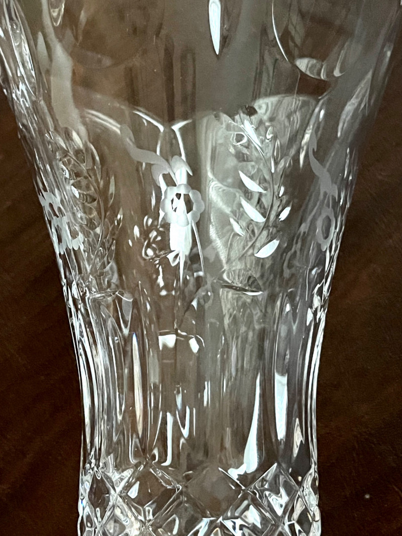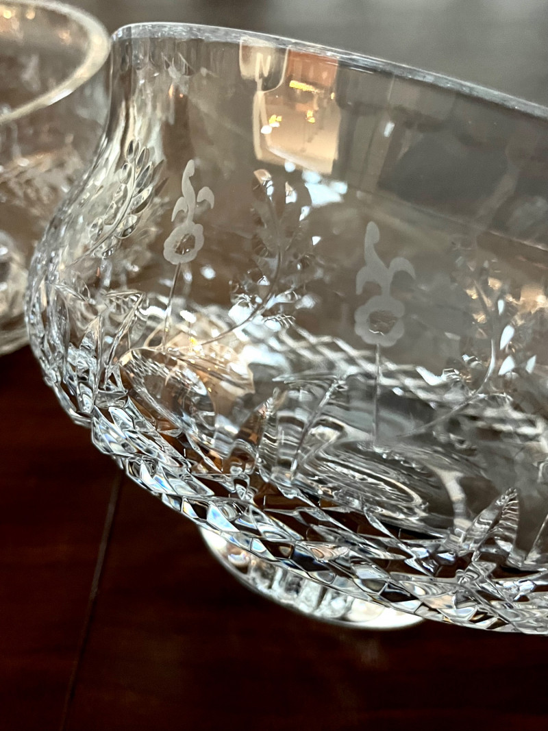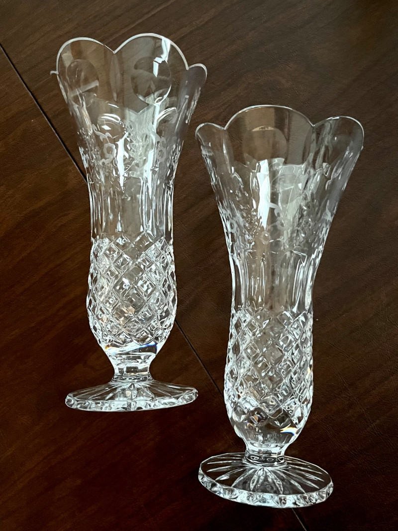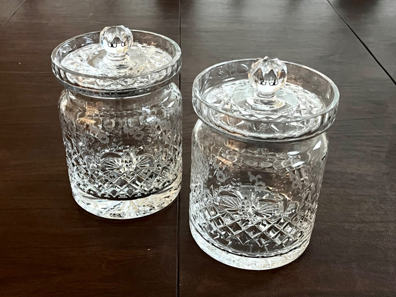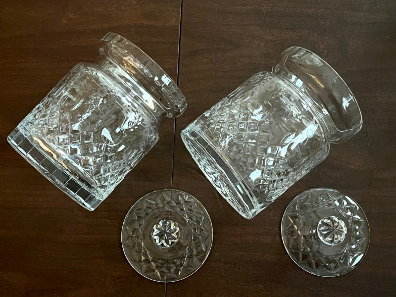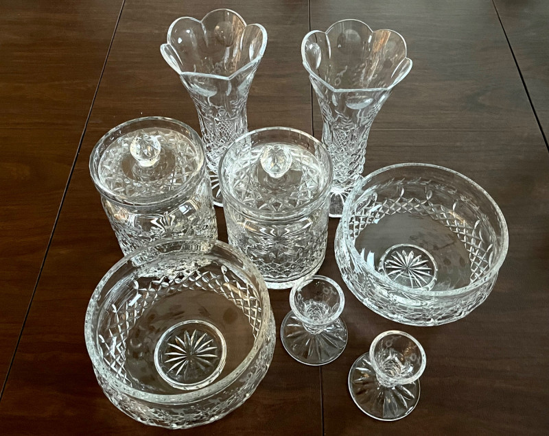 Rogaska Gallia Lead Crystal 8 Piece Lot Gallia is one Rogaska's most popular crystal patterns as it features the sparkle of a crosscut base and the dedicate detail of etched flowers along the rim. This lot includes two biscuit jars, two 10" footed vases, two 7" serving bowls, two candlestick holders, and two biscuit jars with lids.