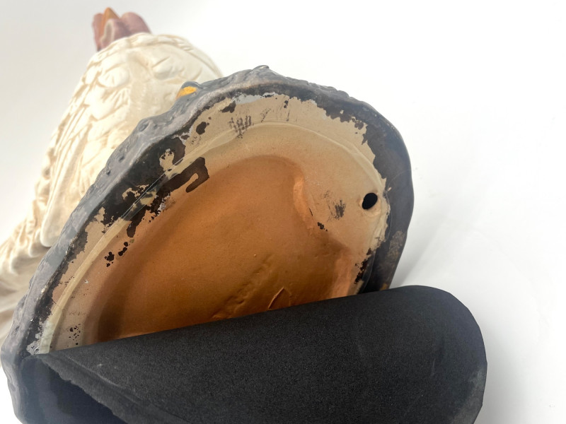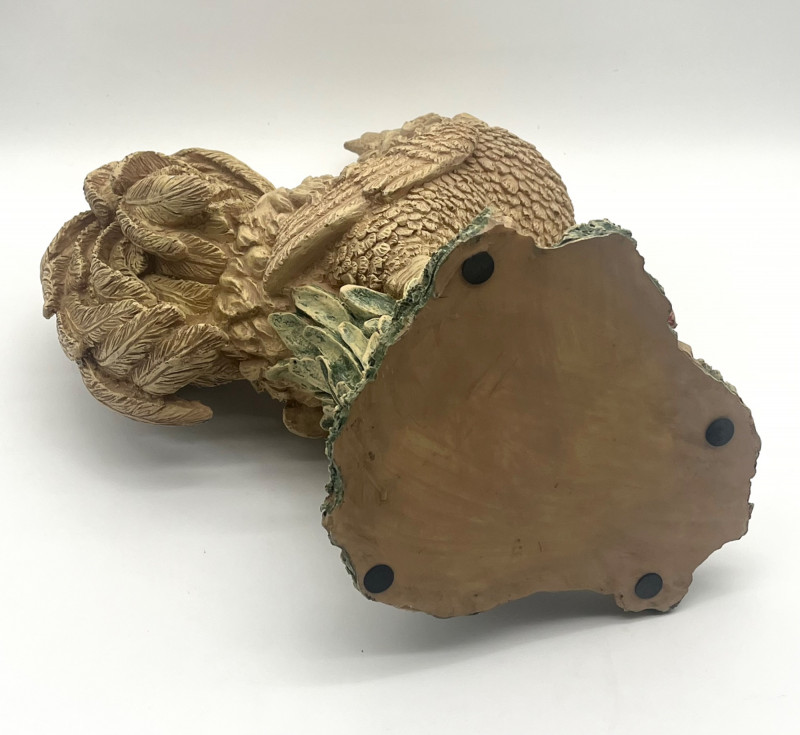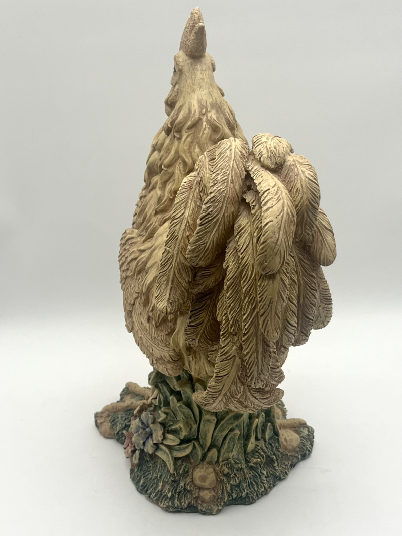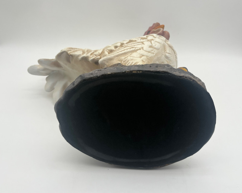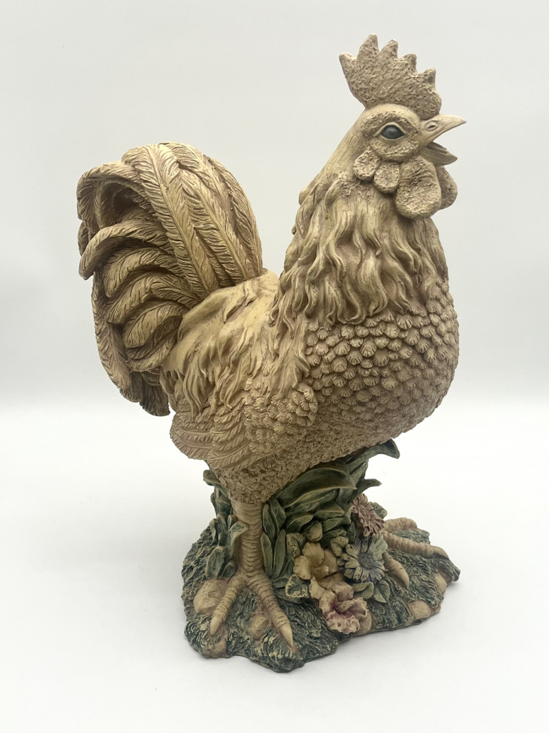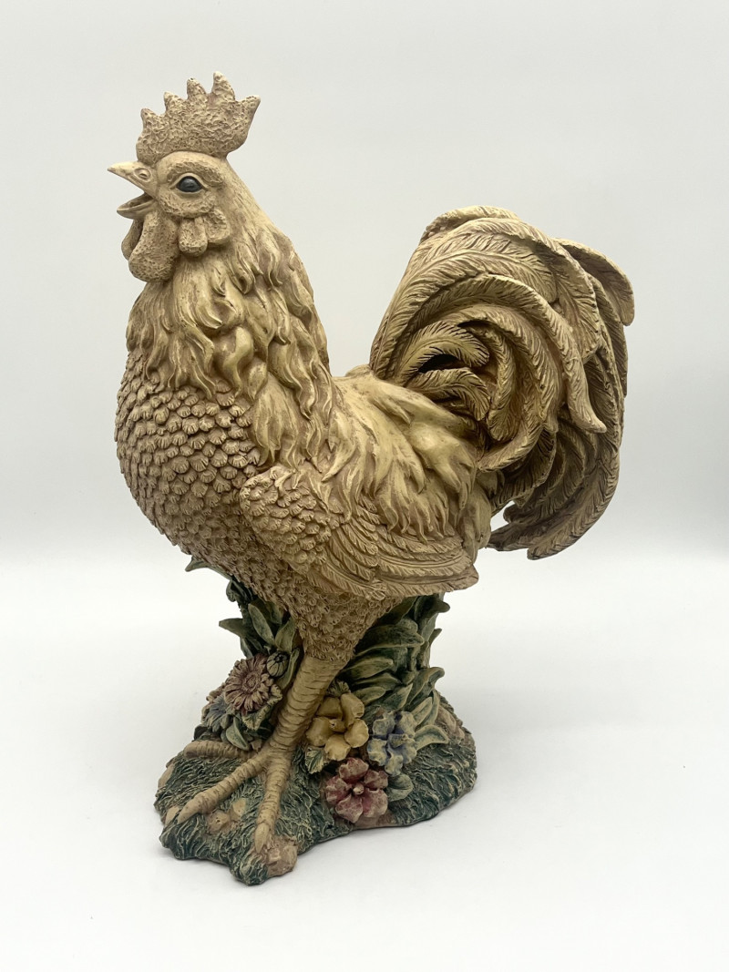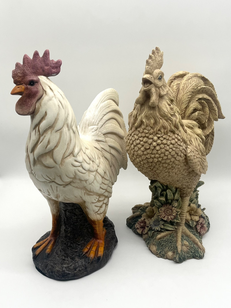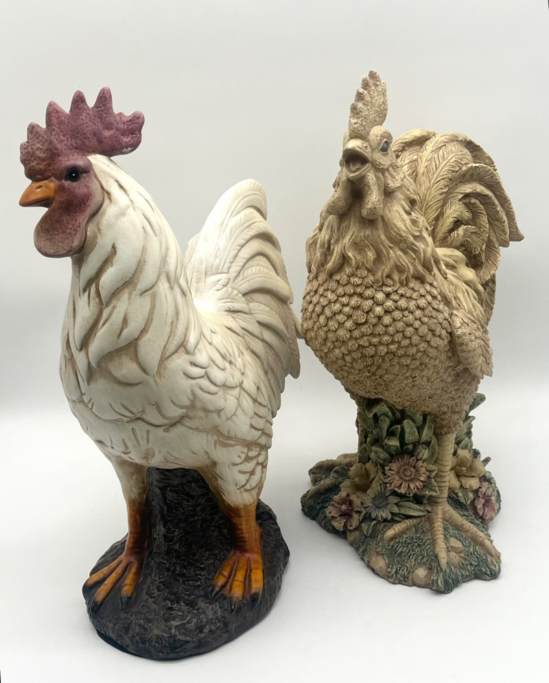 Large 17" Rustic Styled Roosters These are in good condition with no damage with the exception of the pad on the base of the lighter colored one. The lighter colored one is ceramic while the darker is resin.
