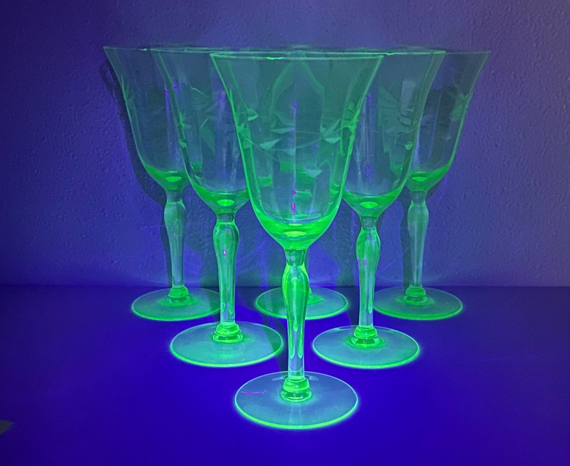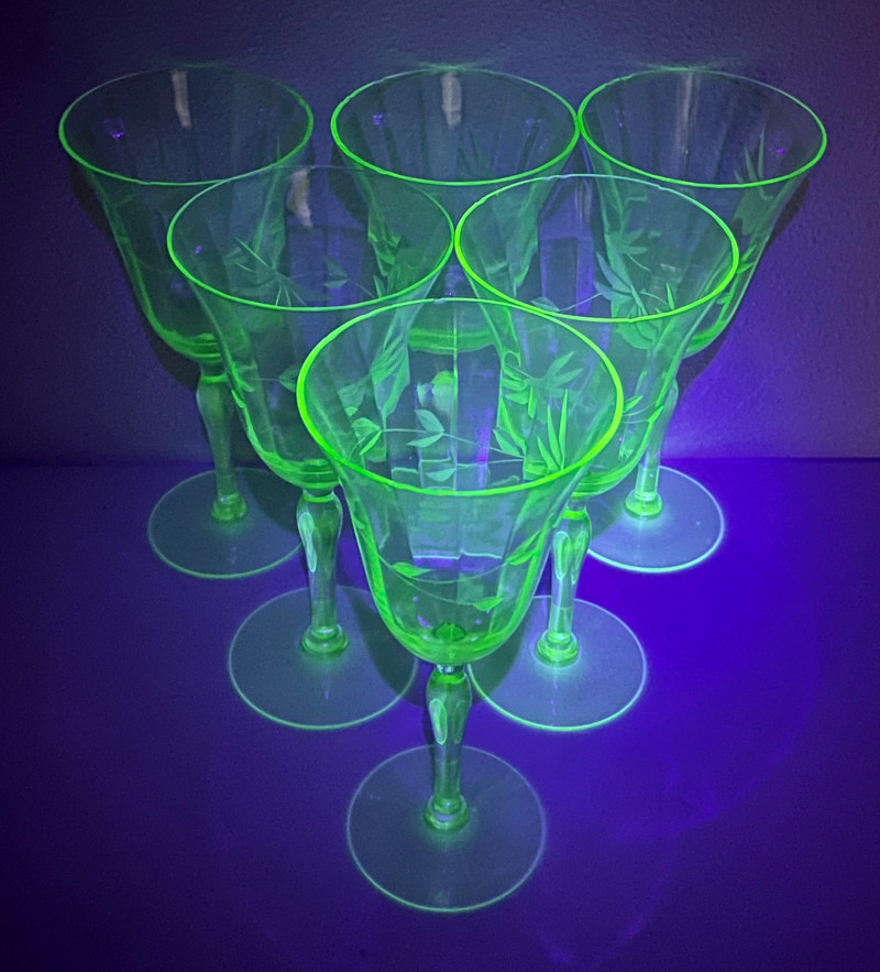 Set of 6 Etched Uranium Wine Glasses These are 7 1/2" tall and in good vintage condition. Note that a few have chips on the rims.