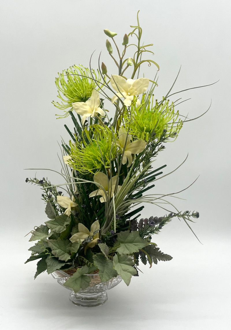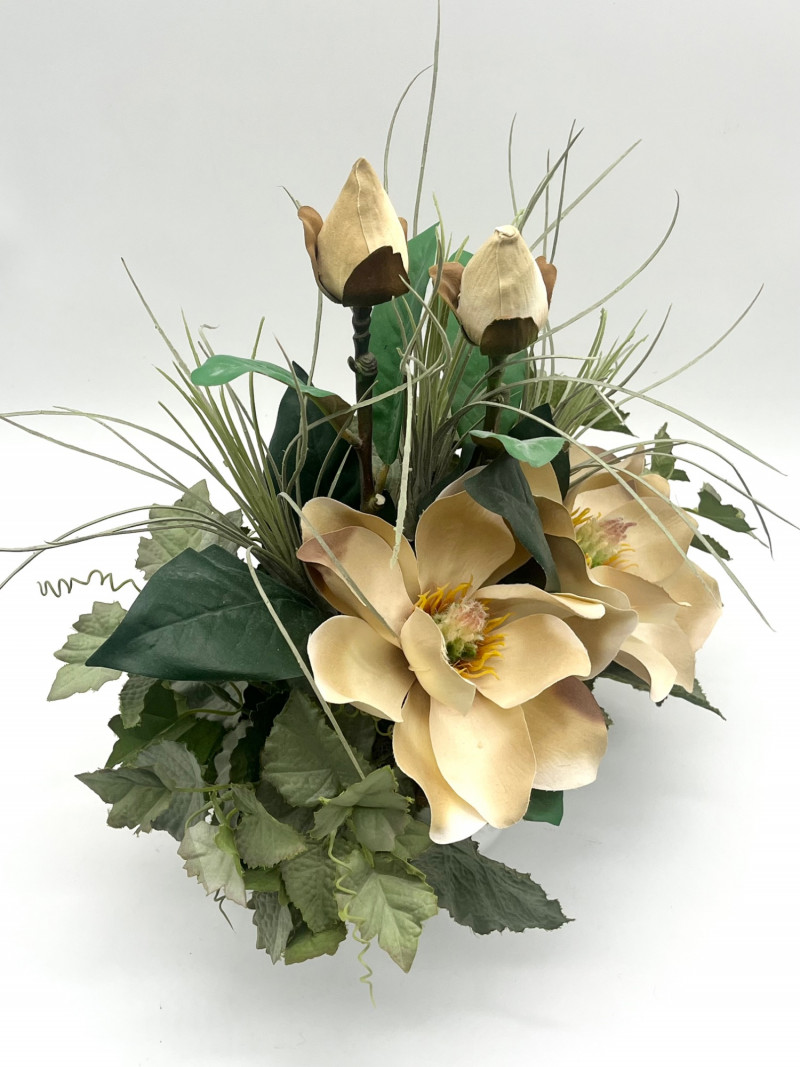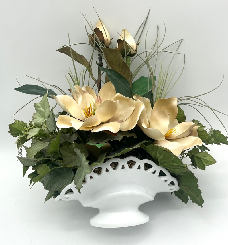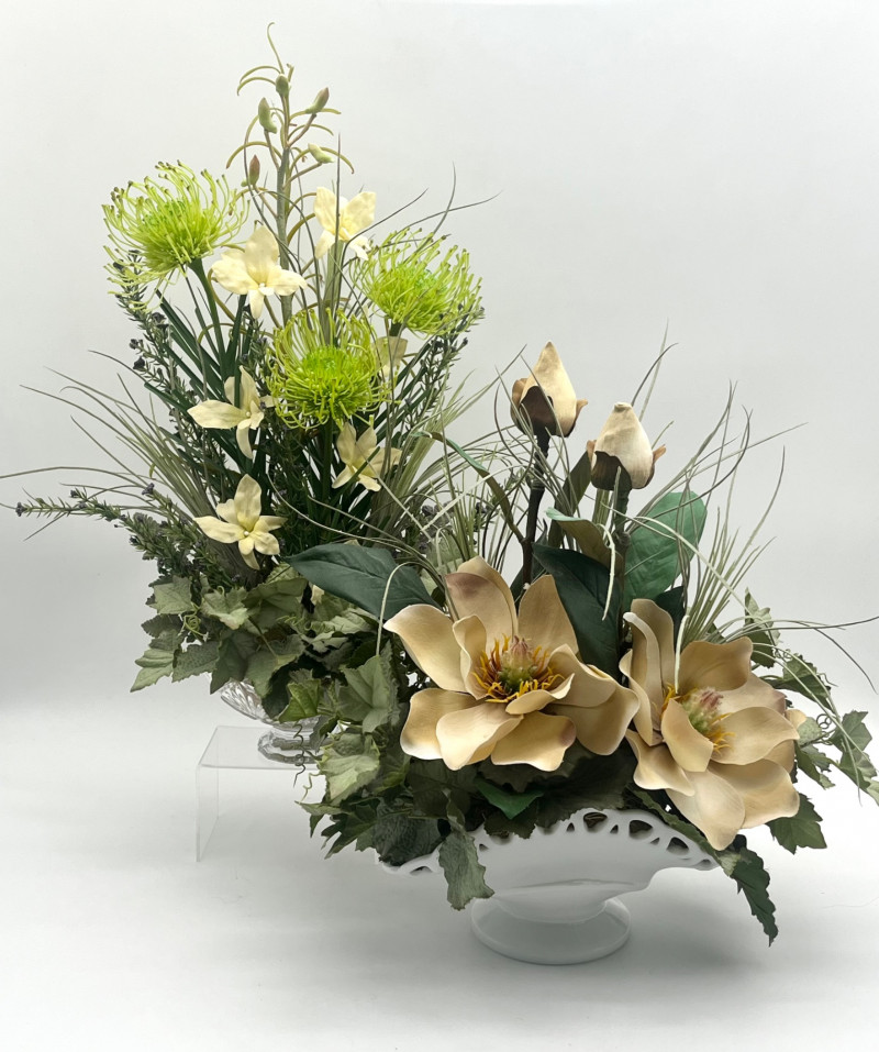 Neutral Floral Arrangements in Vintage Glass and Crystal Bowls These arrangements are GLUED into the bowls they are shown in. I am not sure if the arrangements can easily be removed without damaging the bowls. The arrangement with magnolias is about 15" tall while the other is 18" tall. Both are in nice condition.