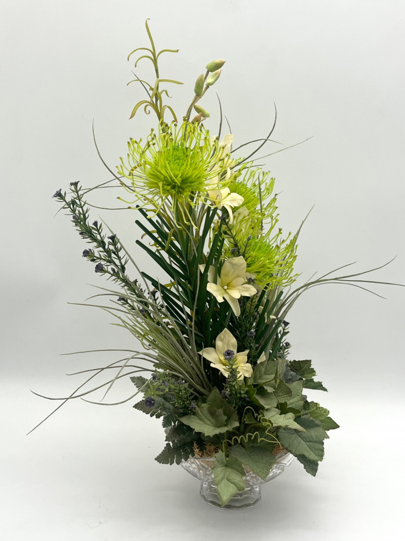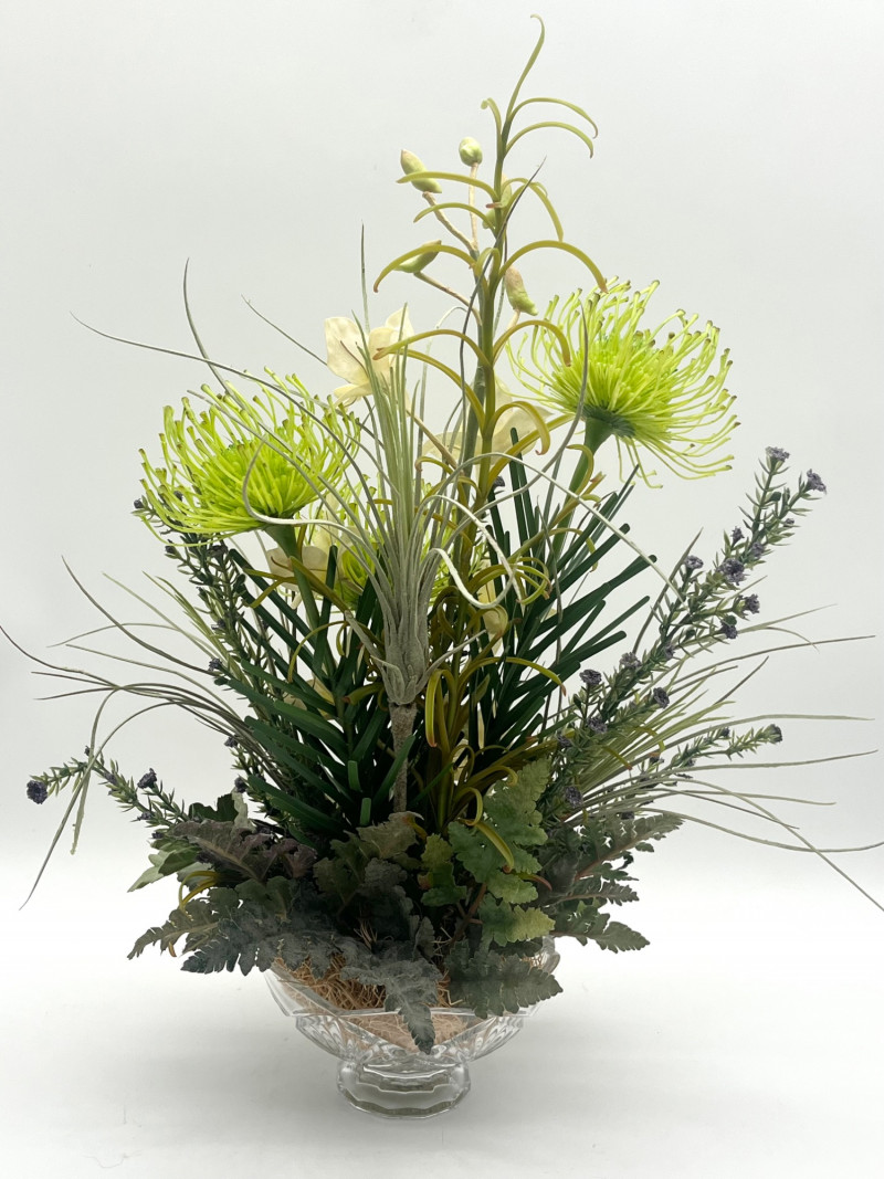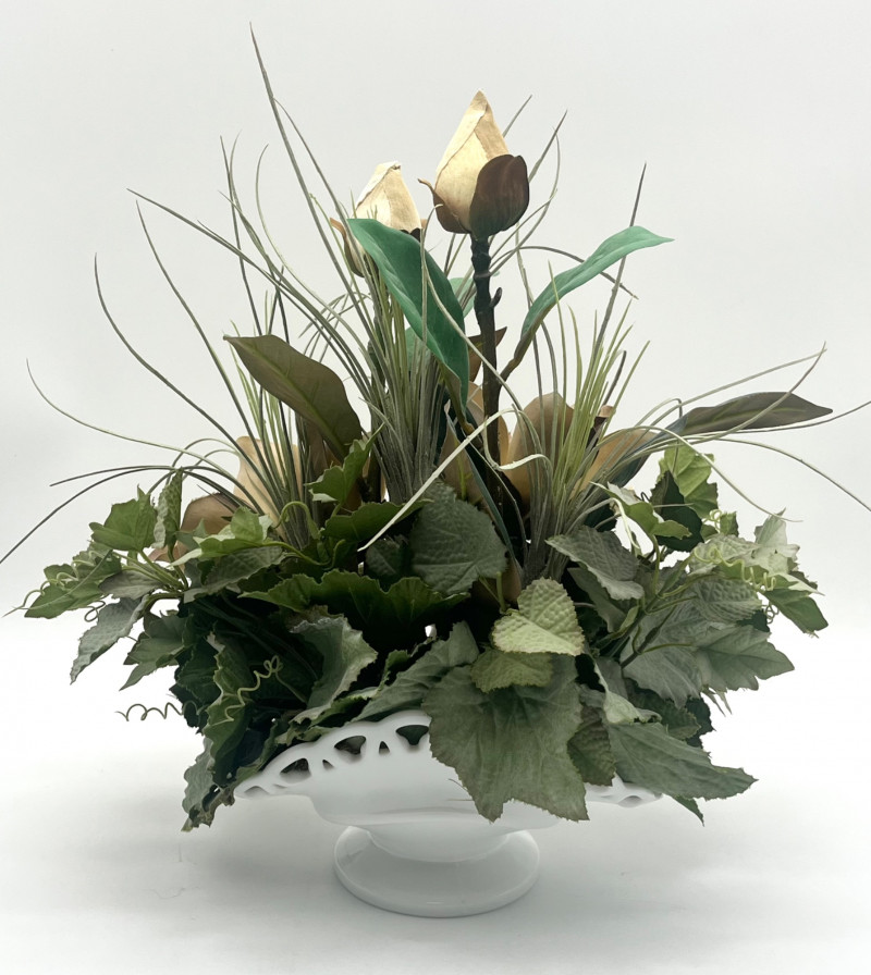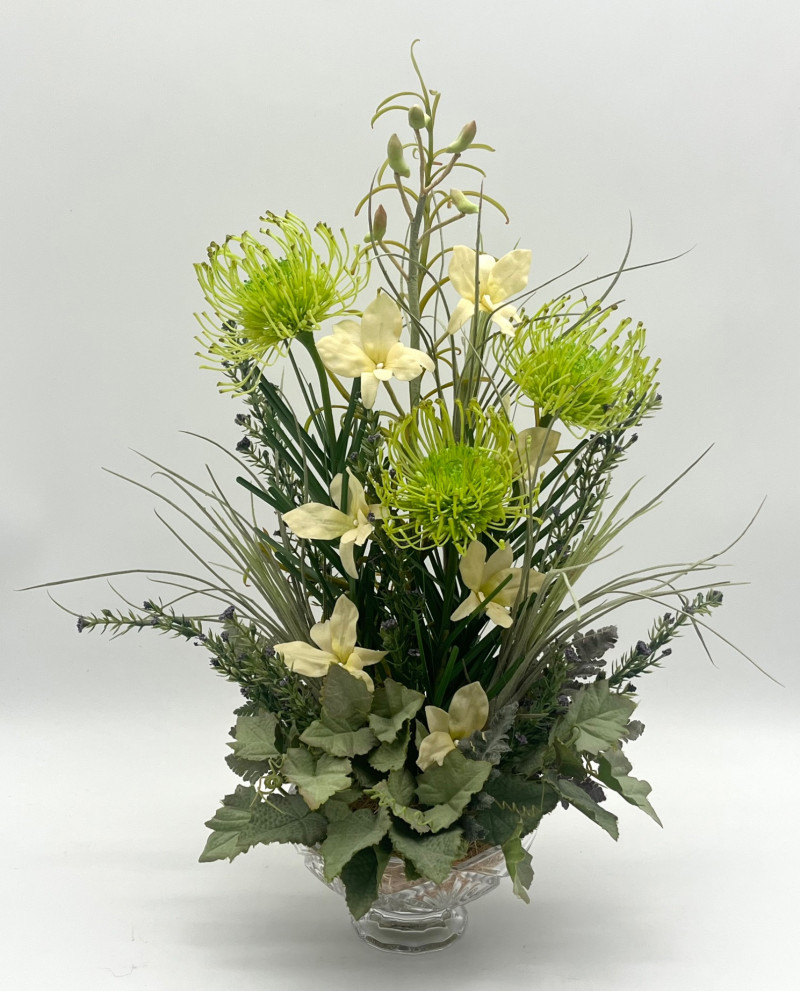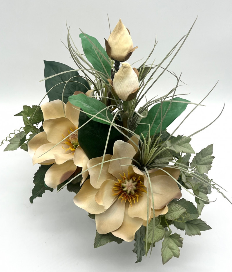 Neutral Floral Arrangements in Vintage Glass and Crystal Bowls These arrangements are GLUED into the bowls they are shown in. I am not sure if the arrangements can easily be removed without damaging the bowls. The arrangement with magnolias is about 15" tall while the other is 18" tall. Both are in nice condition.