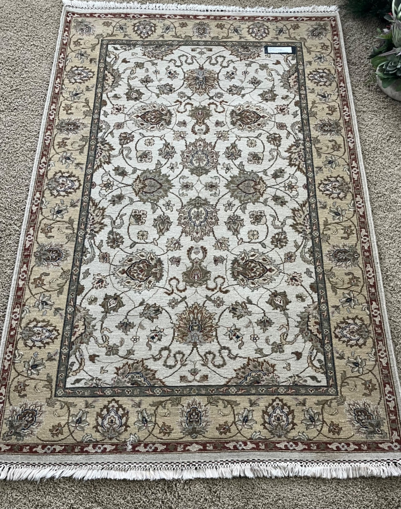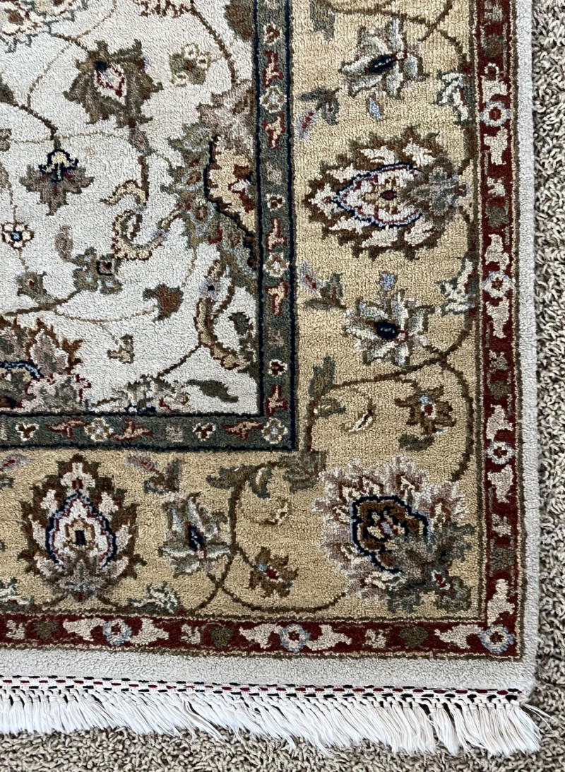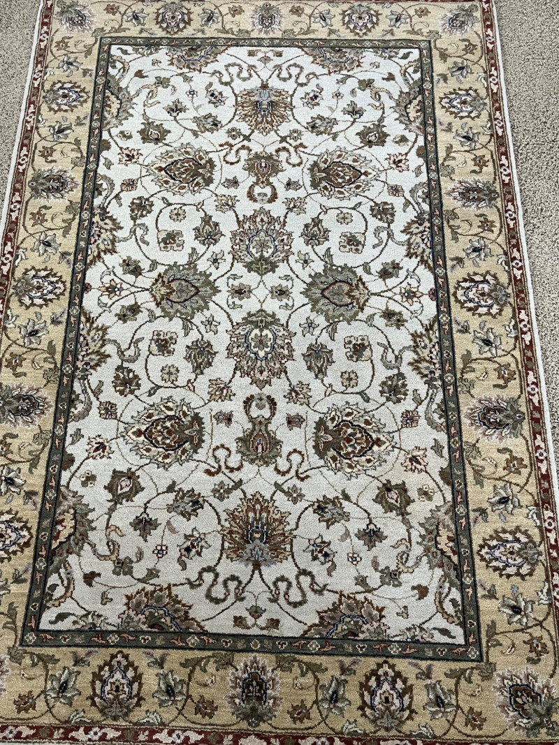 4’1” x 6’2” Hand Knotted Floral Rug This rug is in very good condition with no signs of wear such as threadbare, warping, or fading. I show both sides of the rug to show true condition and wear.