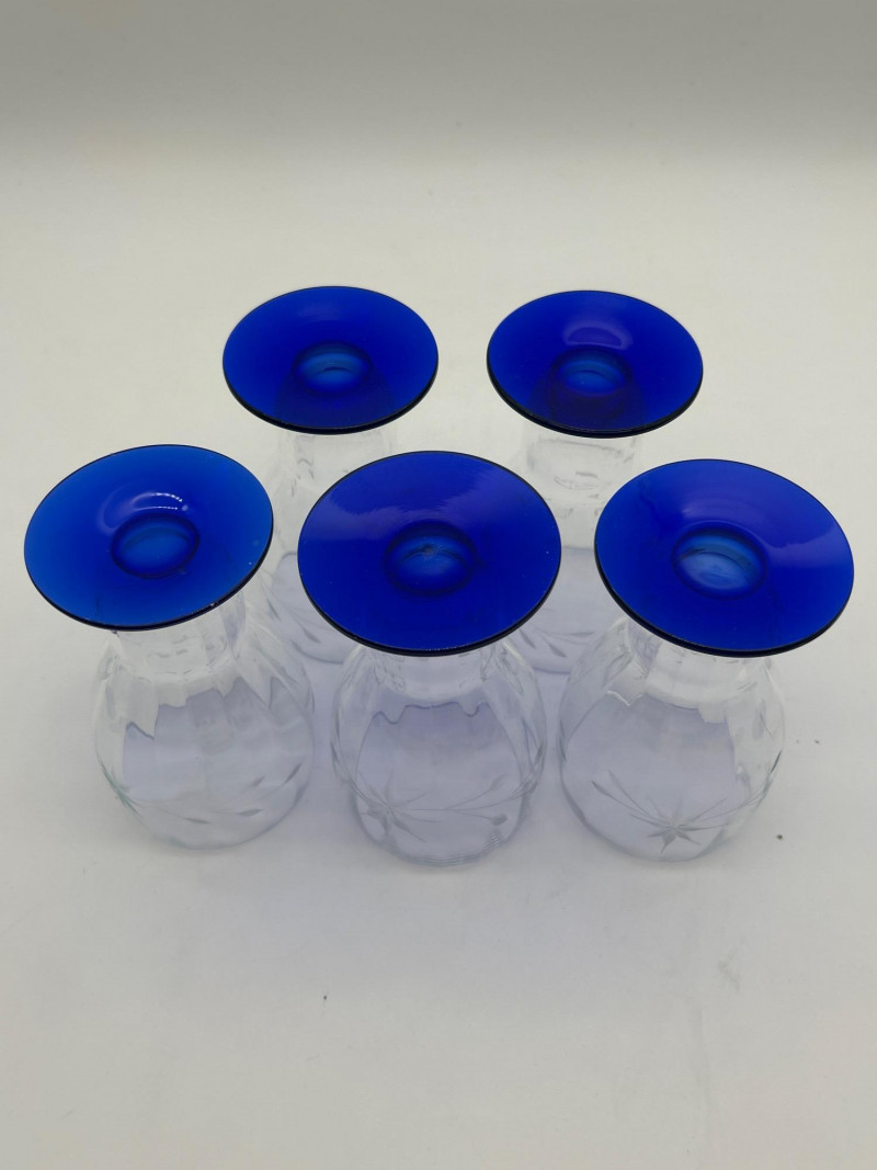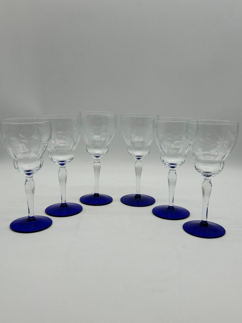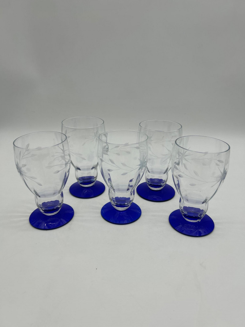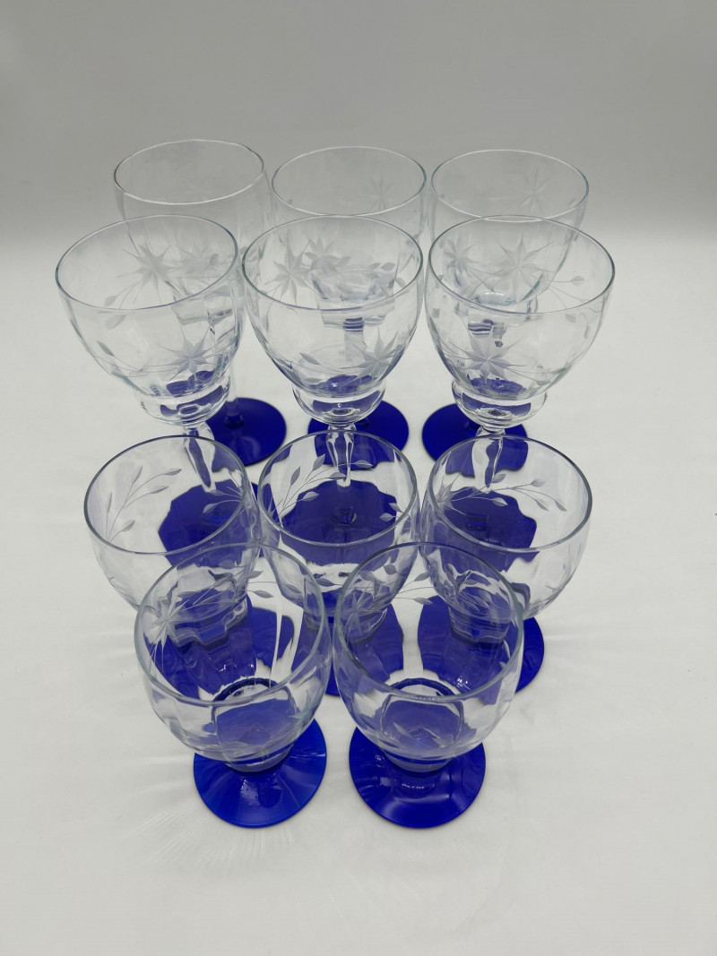 Set of 11 Weston Glass Blue Footed Water Goblets and Iced Tea Glasses Goblets are 7 3/4" tall and the iced tea glasses are 5 1/4" tall. All look to be in good condition with only minor signs of wear.