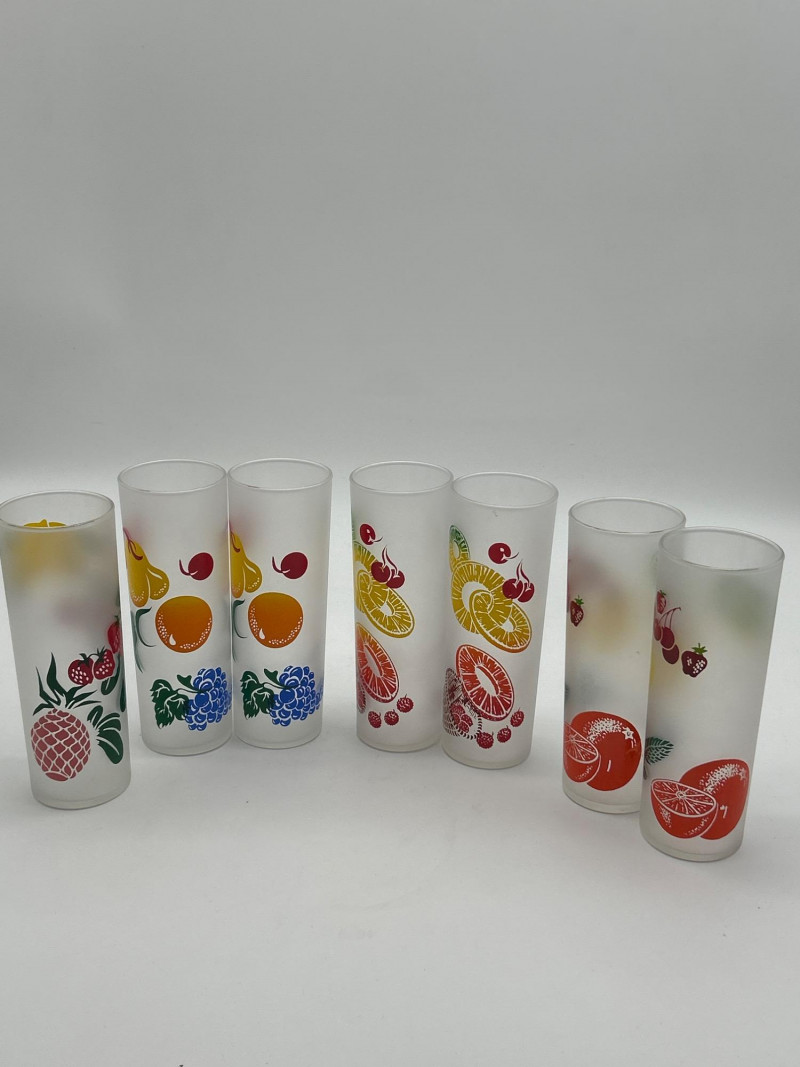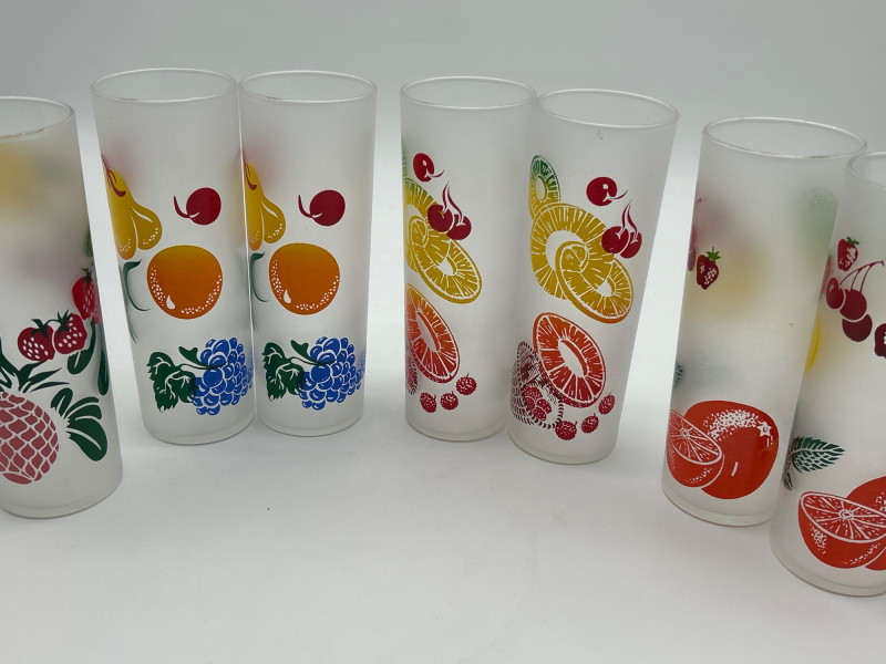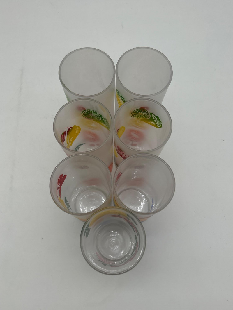 Retro Kitchen Feat. Fiestaware, Viking Glass, & Tom Collins Glasses Tom Collins glasses are by Federal Glass and are 7" tall. The blue juice glasses are by Viking Glass and are 4 1/8" tall. The Fiestaware bowls are newer 7" bistro bowls in what I think is Lapis blue.