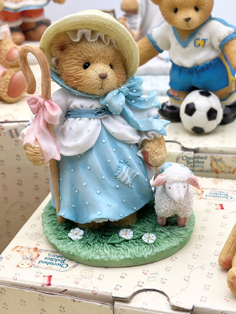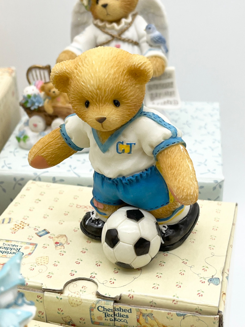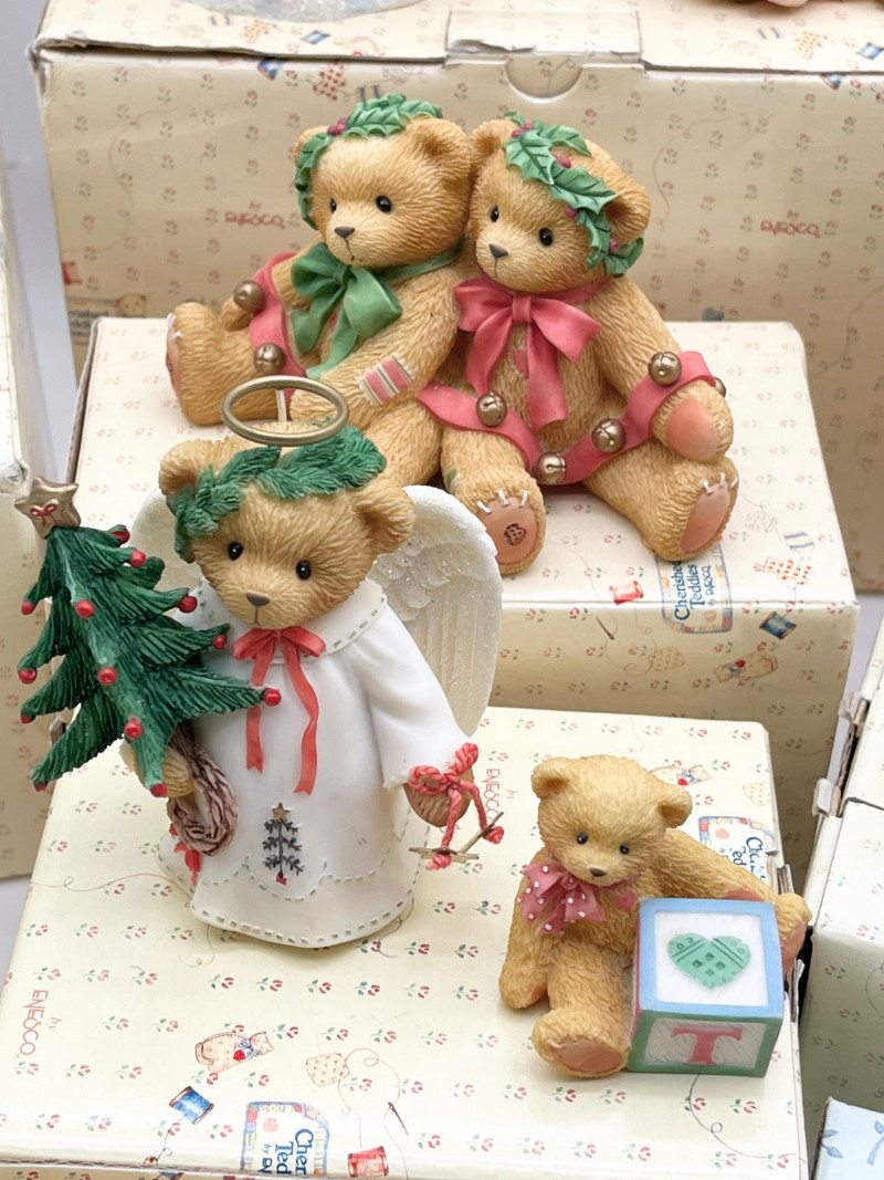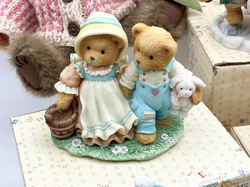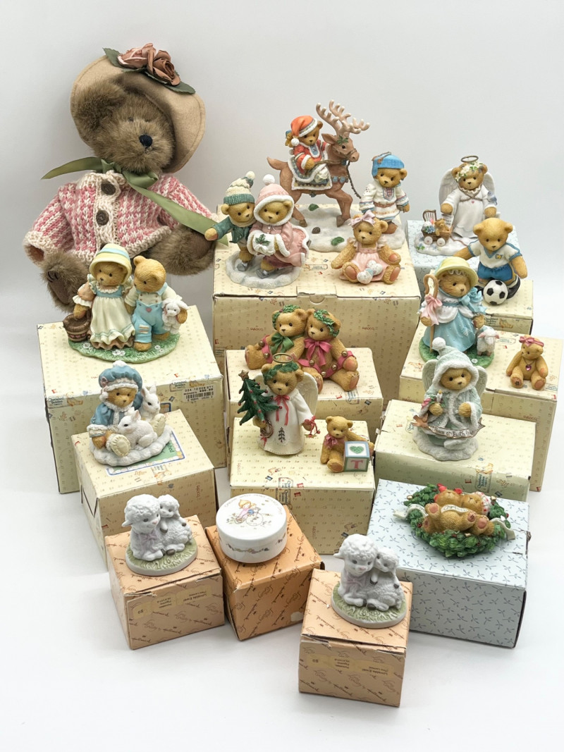 Cherished Teddies and Victorian Dressed Stuffed Bear All of the Cherished Teddies figurines are in good condition and most have their original boxes.
