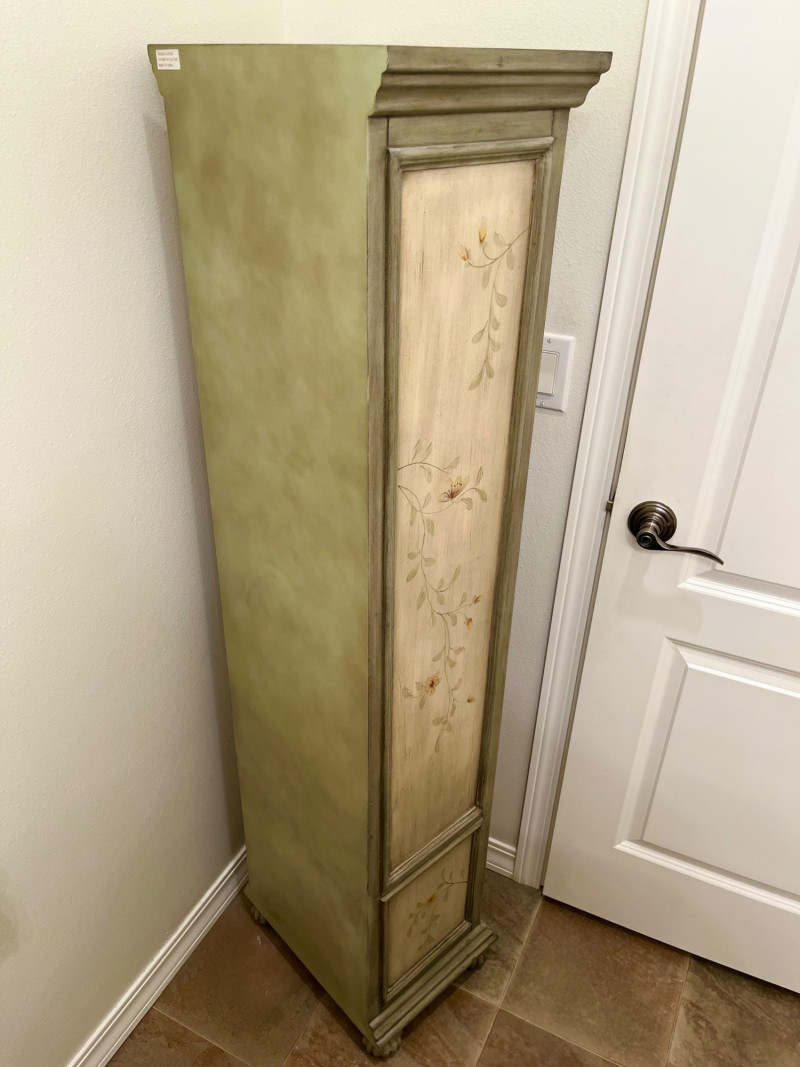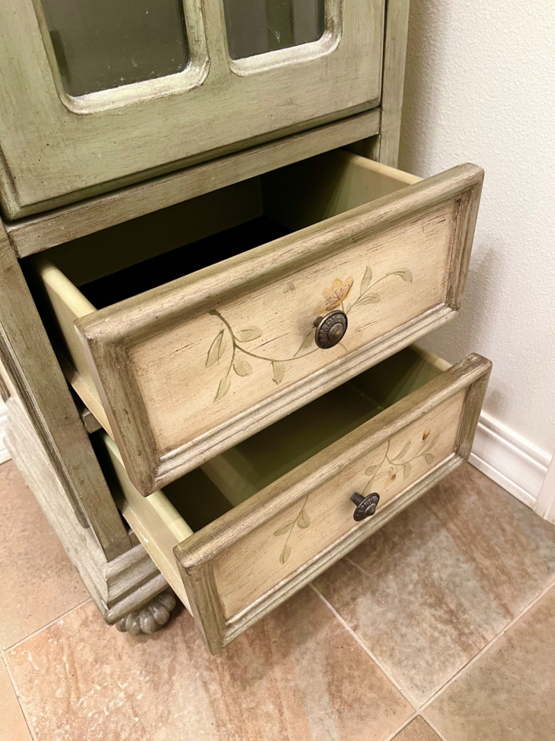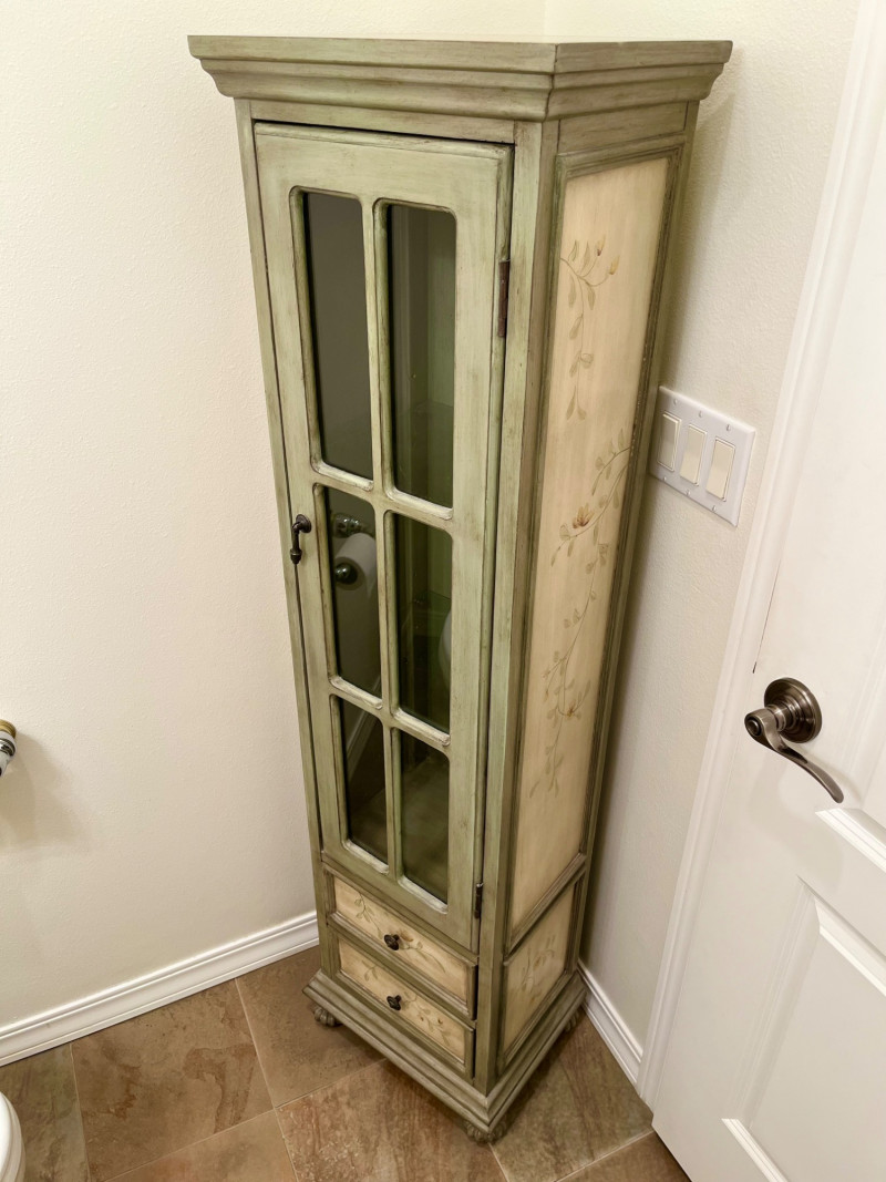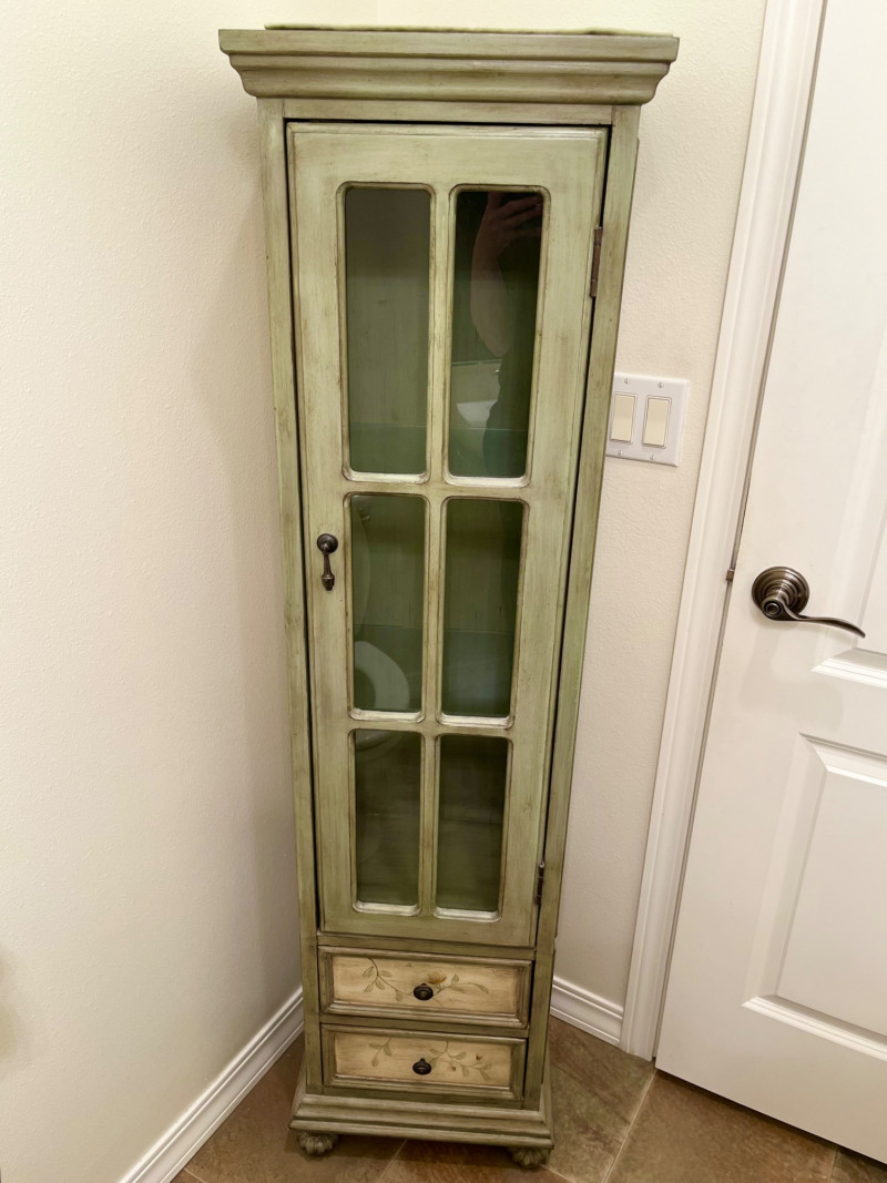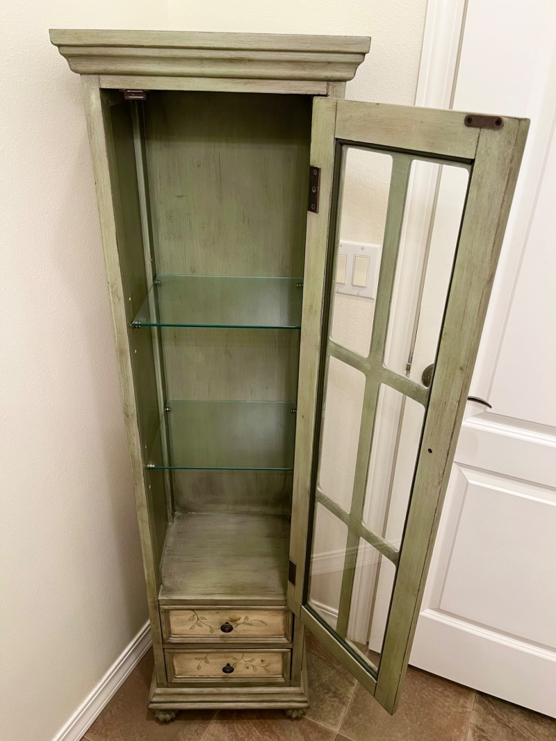 Cute Little Storage Cabinet with Glass Front Door and Two Drawers This cabinet is in very good condition and is great for very small spaces. It even has two glass shelves! 5' tall, 16" wide, 12" deep