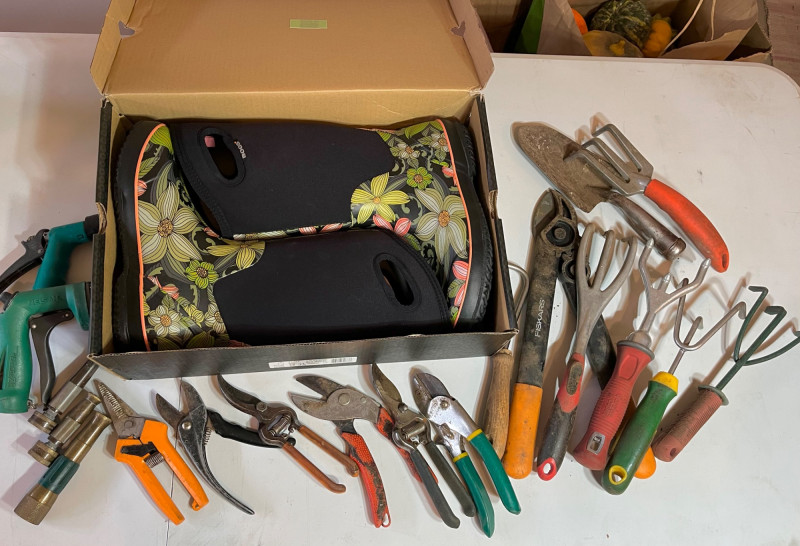 Bogs Gardening Boots and Small Gardening and Pruning Hand Tools The boots look brand new and are size 11 womens.