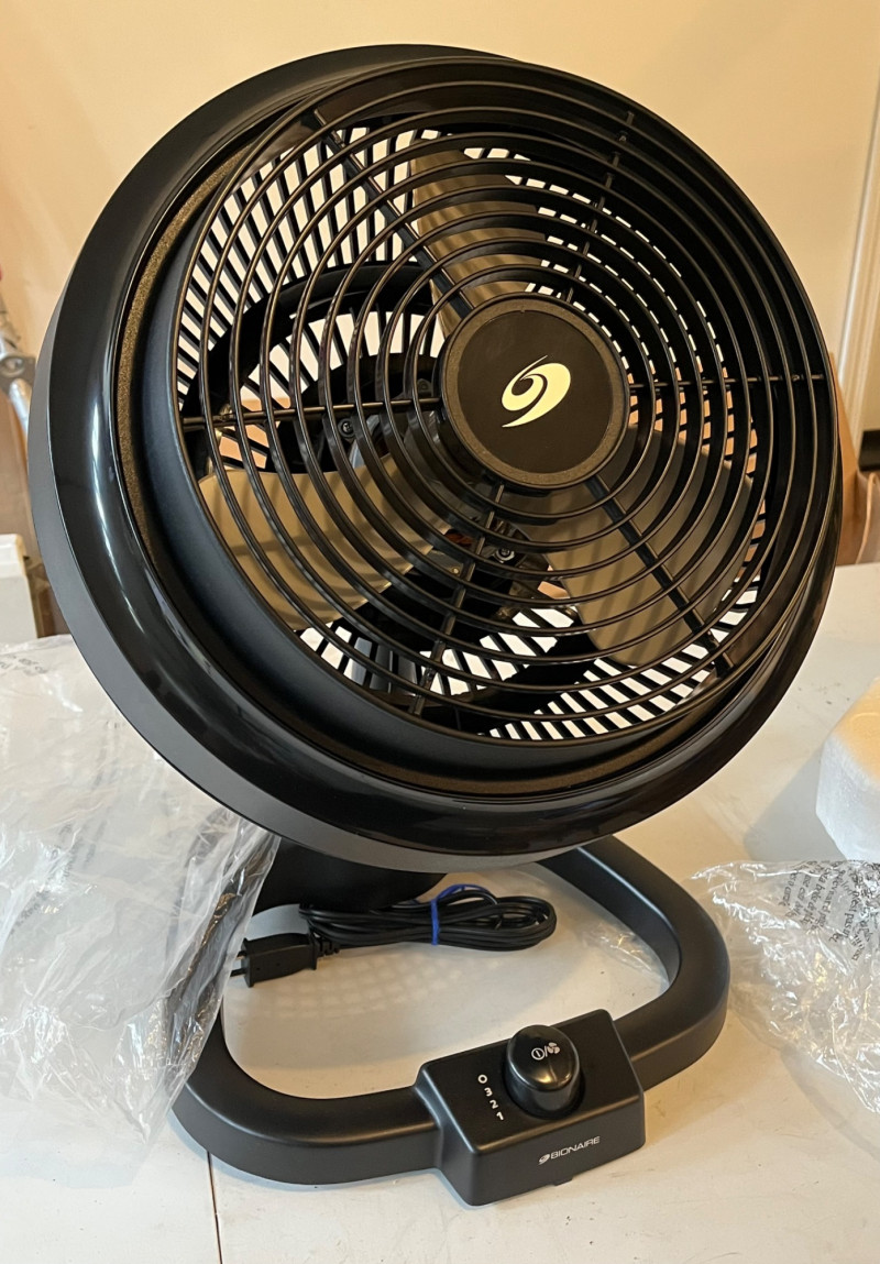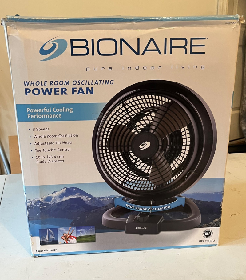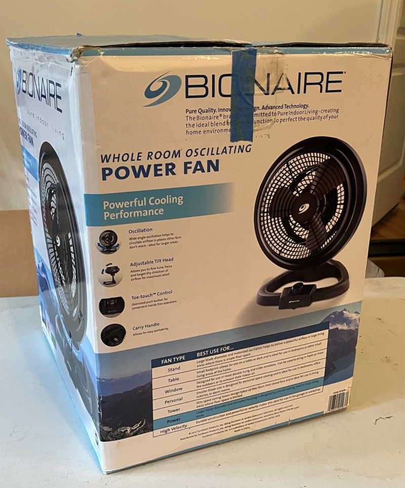Bionaire Oscillating Power Fan Comes with the original box but this is not new. It looks to have only been used a few times. Stands 18" tall.