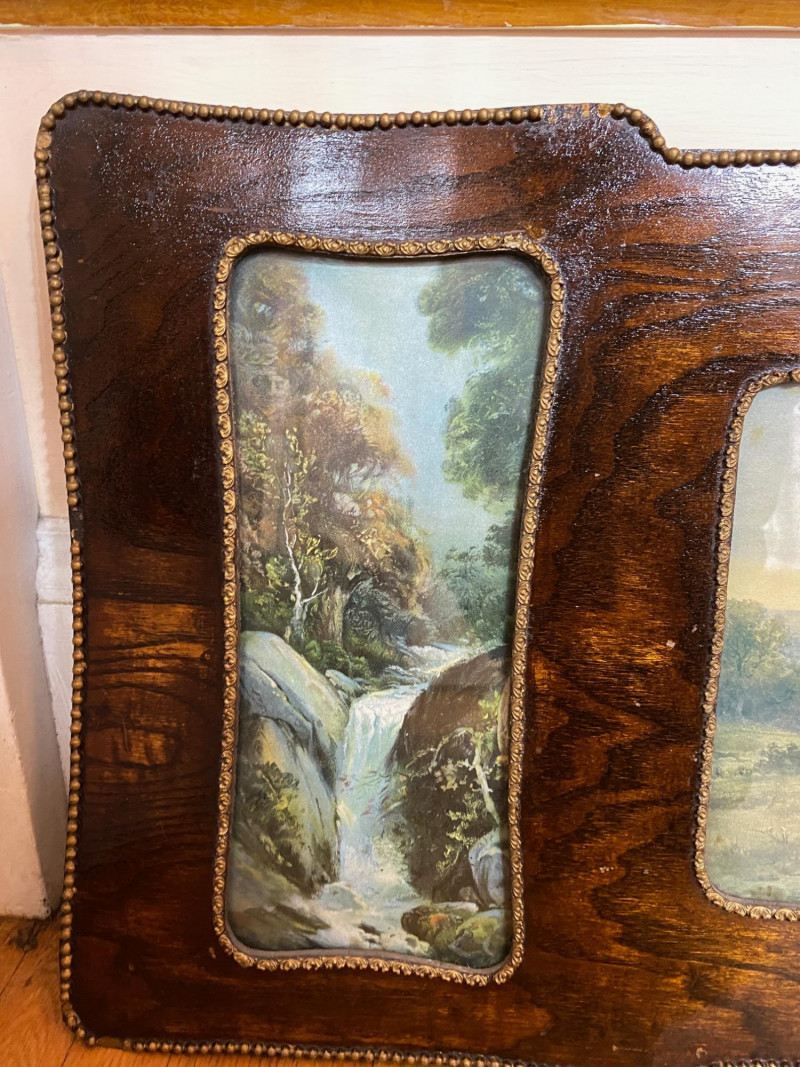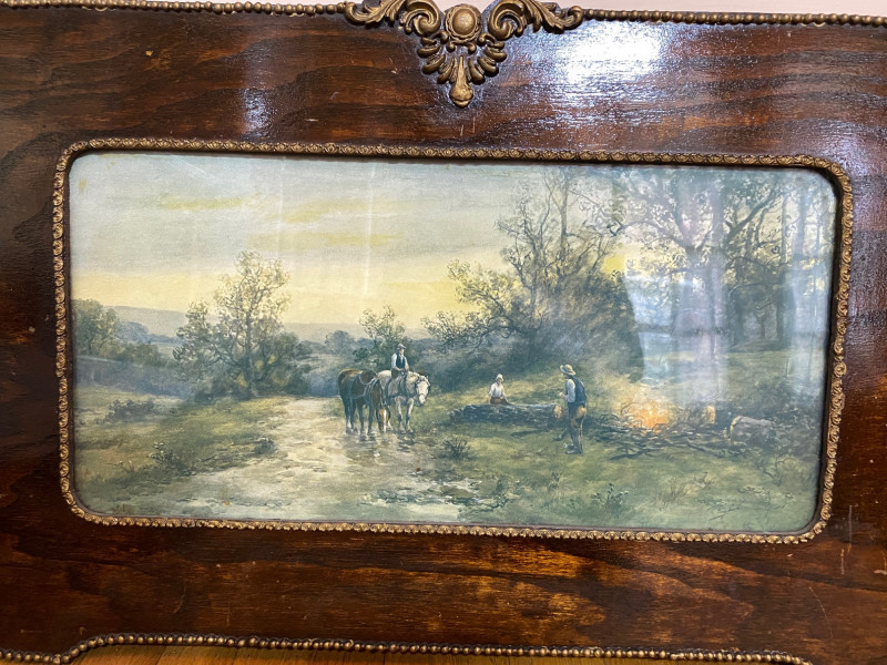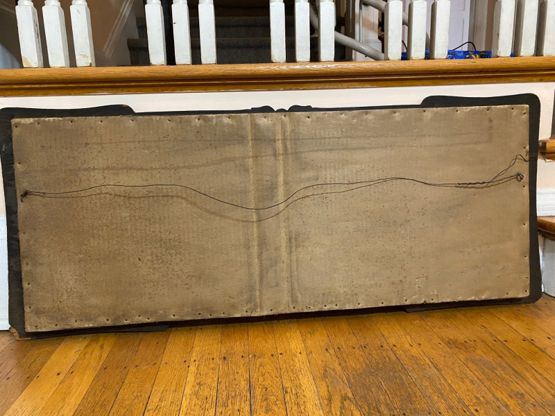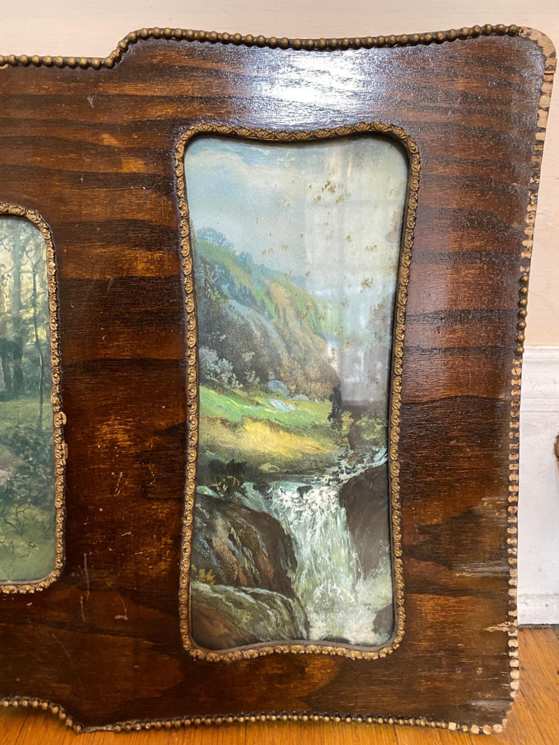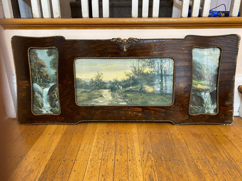 Antique Wood Framed Folk Art Nature Scene - 44" Wide 44" long and about 15" tall. The back has a corrugated cardboard cover. I am unsure if the art is a painting or lithograph as the art has glass overlays.