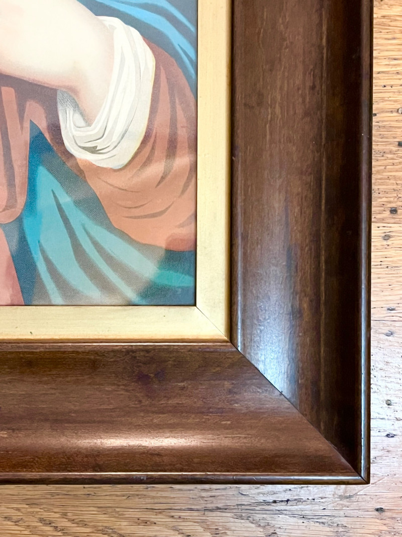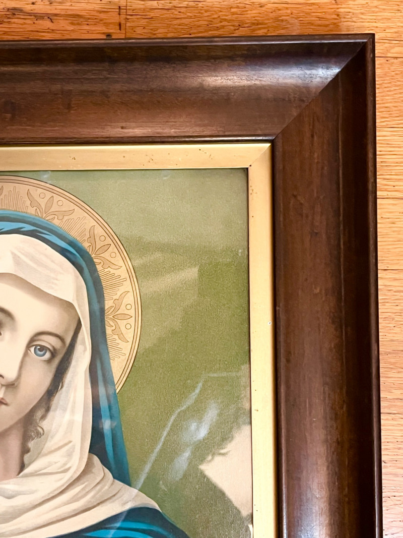 Immaculate Heart of Mary Print in Vintage Wood Frame - 21" x 25" Art has a glass front and the frame is solid wood. This frame is in good vintage condition with only minor blemishes.