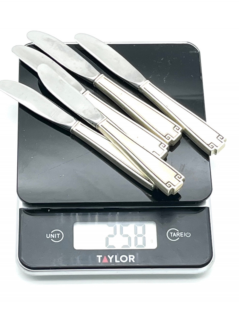 Set of 5 Gorham Etruscan Sterling Handle 6 1/8" Place Knives These have a weight of 258 grams but it is important to consider that the blades are stainless steel.