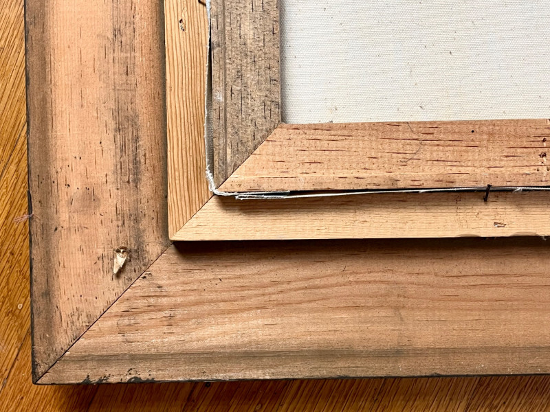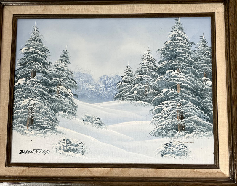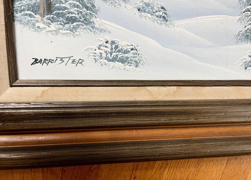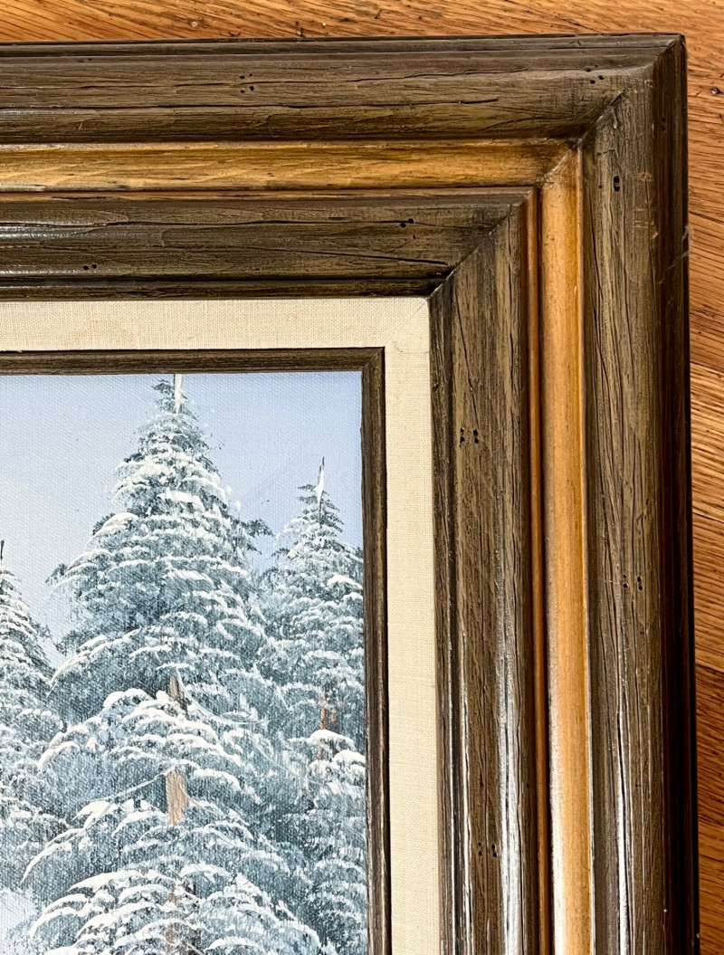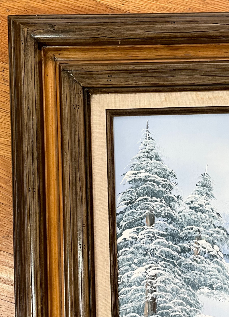 Snowy Tree Oil Painting in Wood Frame - 20" x 24" Oil painting is on canvas. The frame has a linen accent that does have some staining. See photos for details.