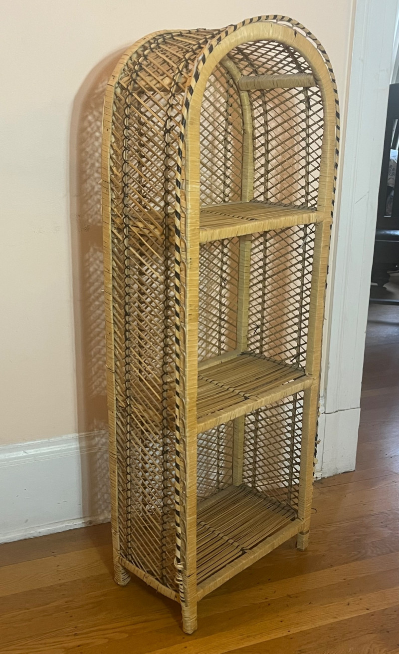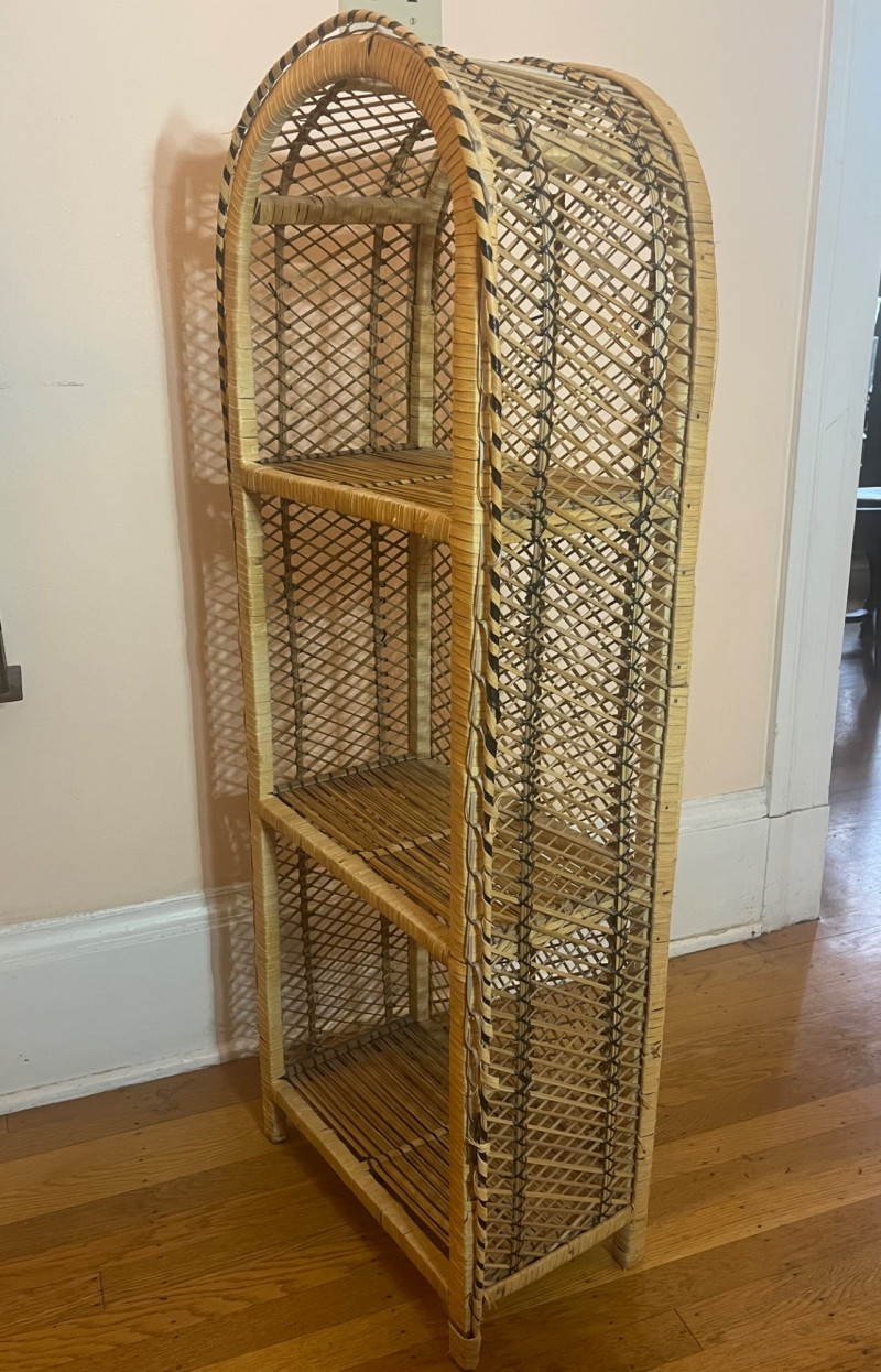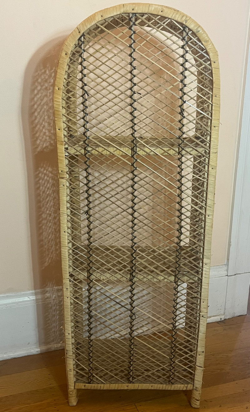 Natural Wicker Shelf - 45" tall 45" tall, 9" deep, and 17 1/2" wide. in good condition with only minor cosmetic flaws. See all photos for details regarding condition.